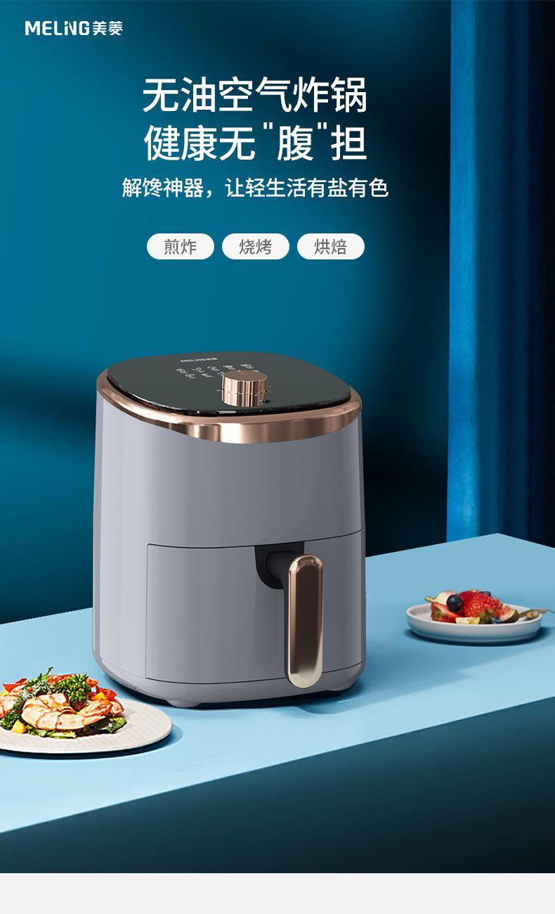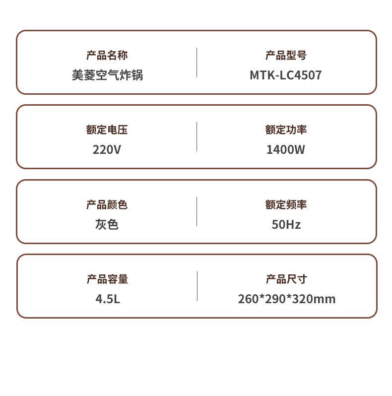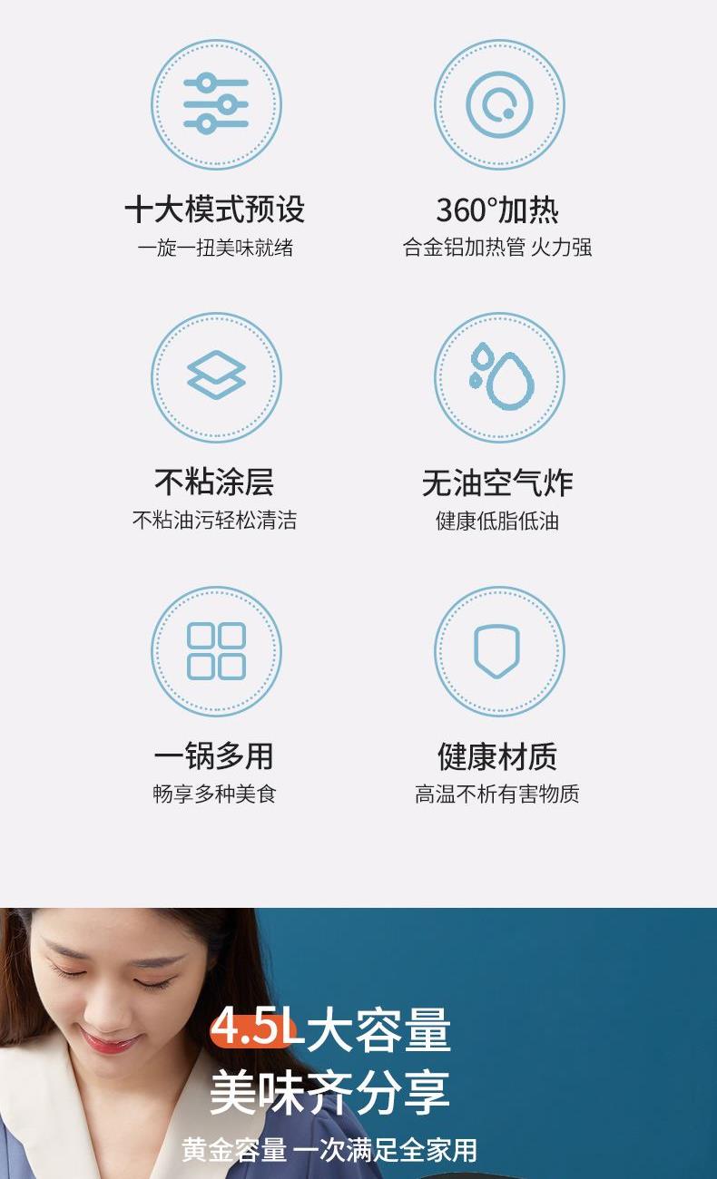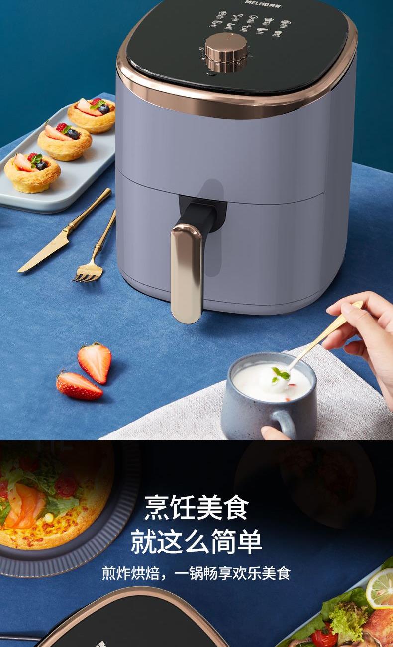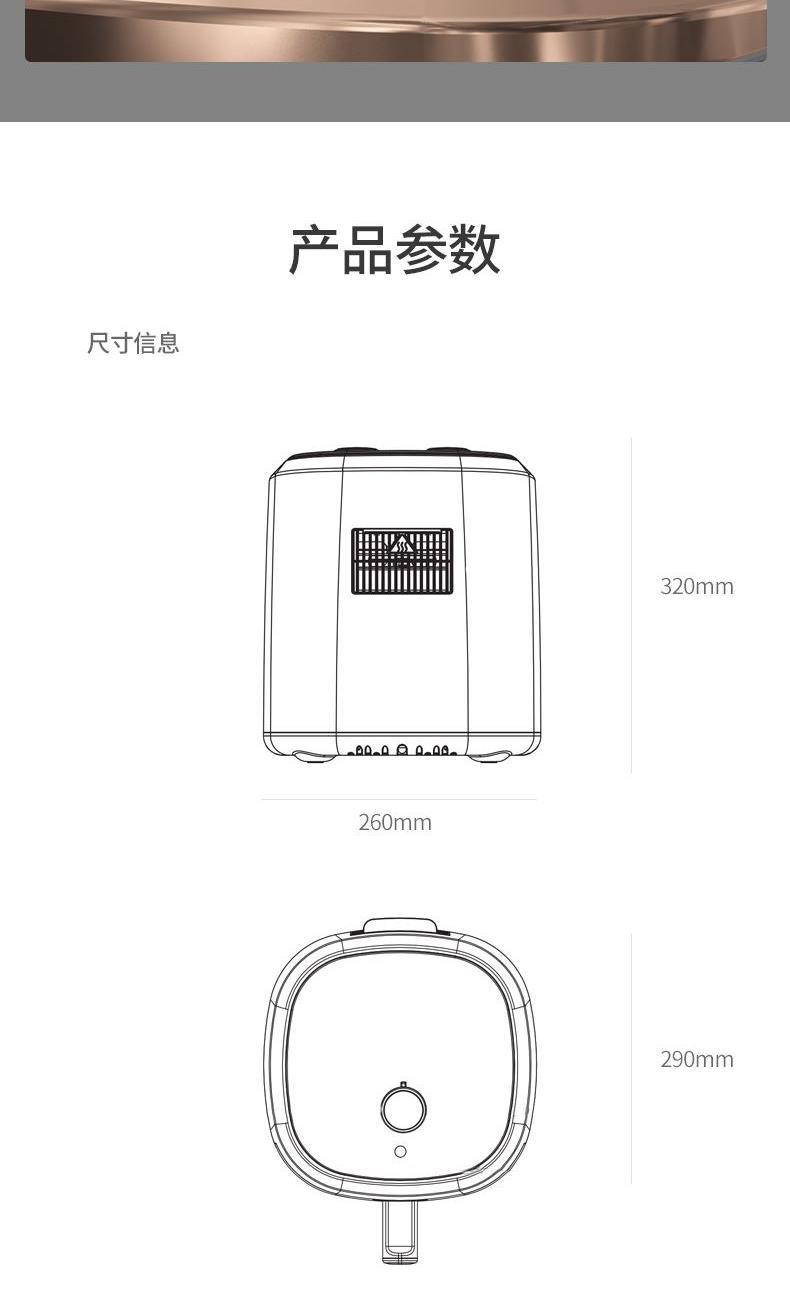 彩包尺寸:315*315*335mm 外箱尺寸:327*327*359mm 单台毛重:4.5kg 单台净重:3.9kg 产品颜色:莫兰迪灰 包装材料:彩包+邮购包 额定电源:220V~ 额定频率:50Hz 额定功率:1400W 容 量:4.5L 产品条码:6936897516932 烘焙炸烤于一身,轻松解锁多样美食 | 大容量,1400W大火力 ,单旋钮 | 食品级不粘涂层,餐后清洗无烦恼 | 一旋定时操作,方便快捷