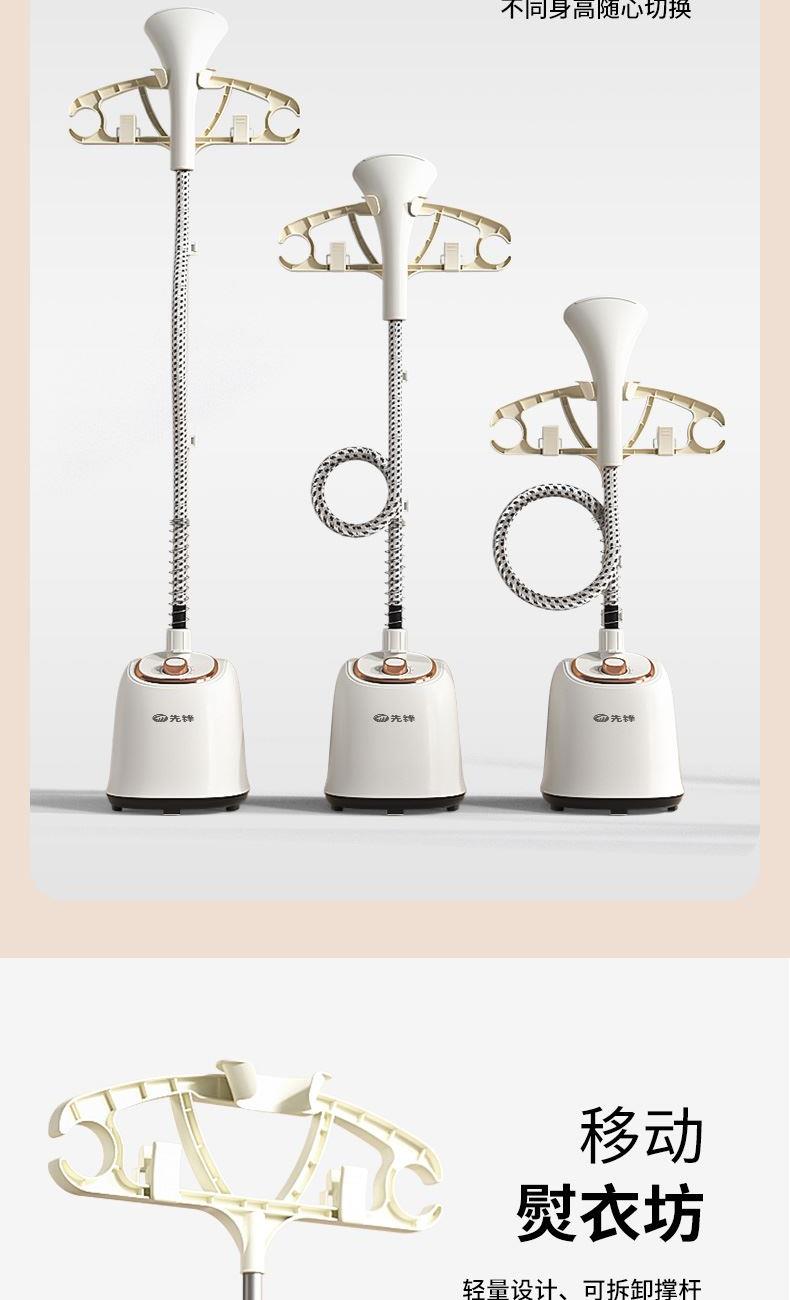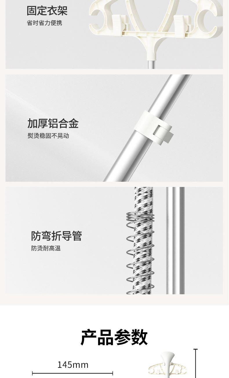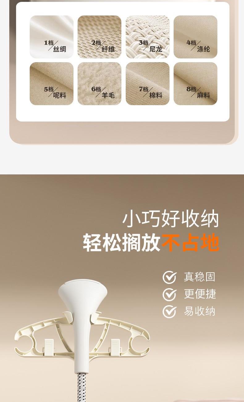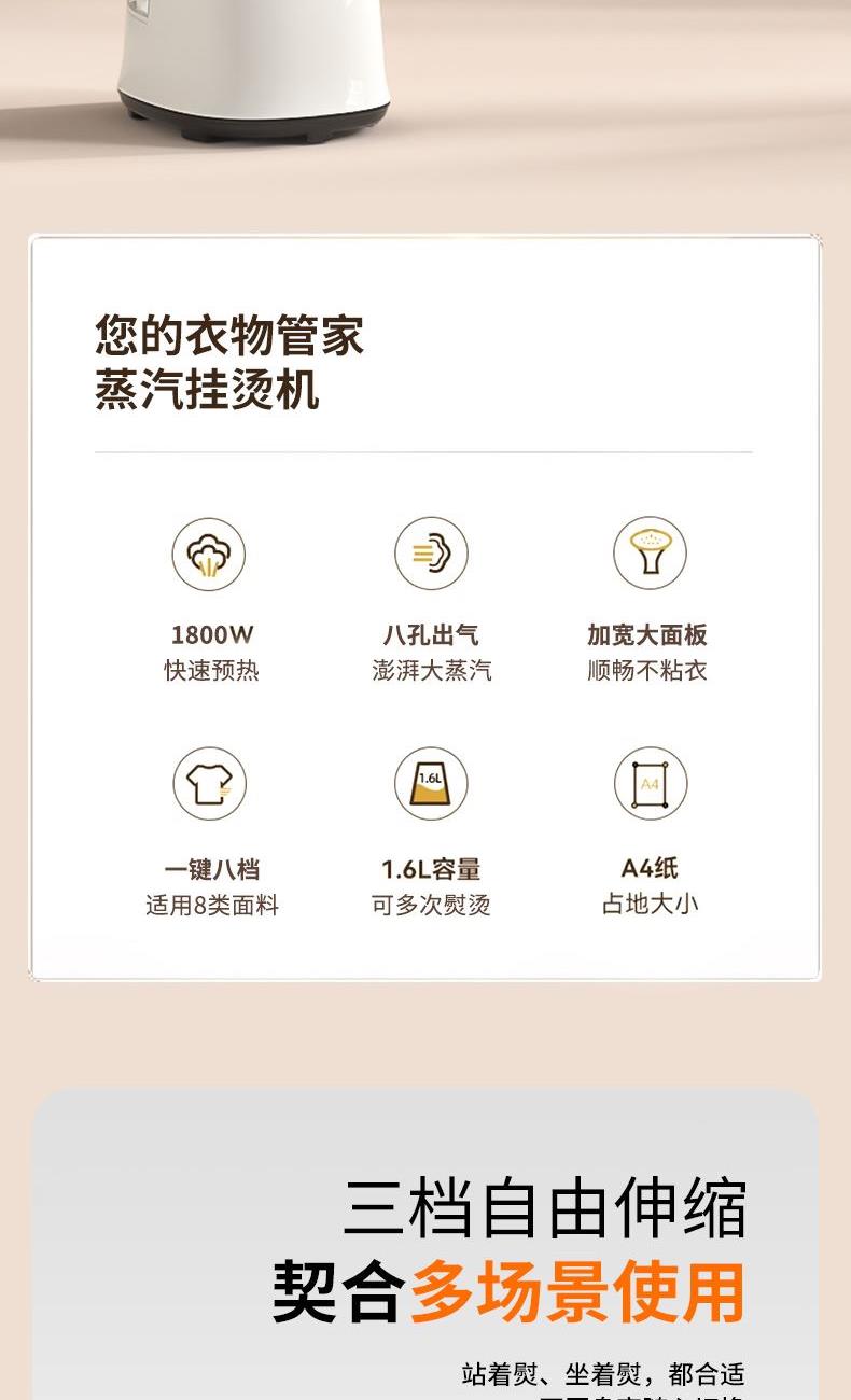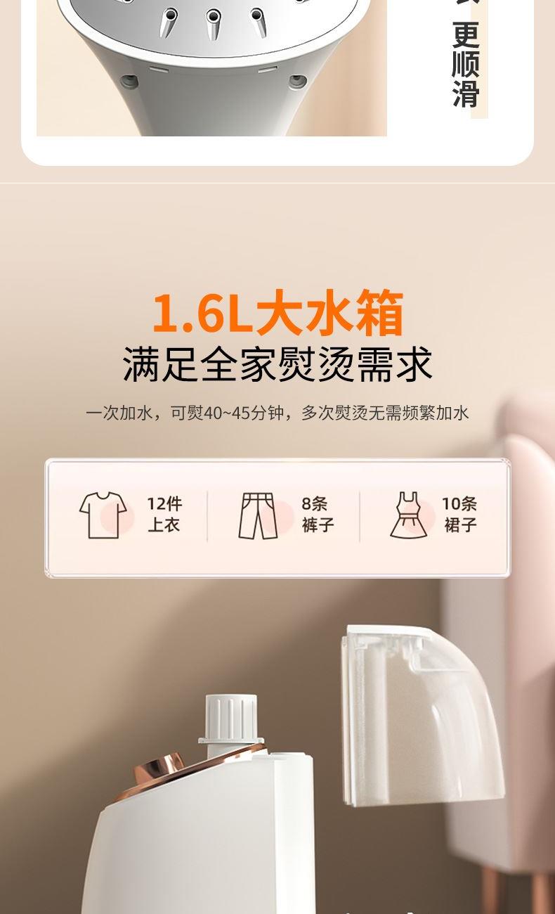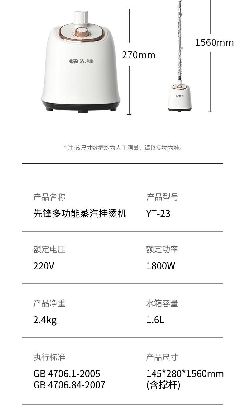 彩包尺寸:375*270*305mm 黄包尺寸:385*280*320mm 单台毛重:3.3kg 单台净重:2.4kg 容量:1.6L 额定电压:220V 额定频率:50HZ 产品条码:6977197070496 包装材料:彩盒+黄盒 产品尺寸:145*280*1560mm(含撑杆) 功率:1800W 6977197070496 三档自由伸缩,契合多场景使用,澎湃大蒸汽,强劲穿透 瞬抚褶皱,小巧好收纳,轻松搁放下当地,高温蒸汽,祛味更护衣