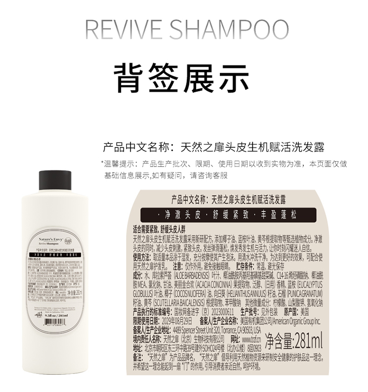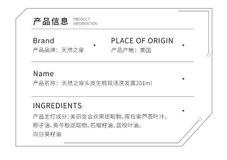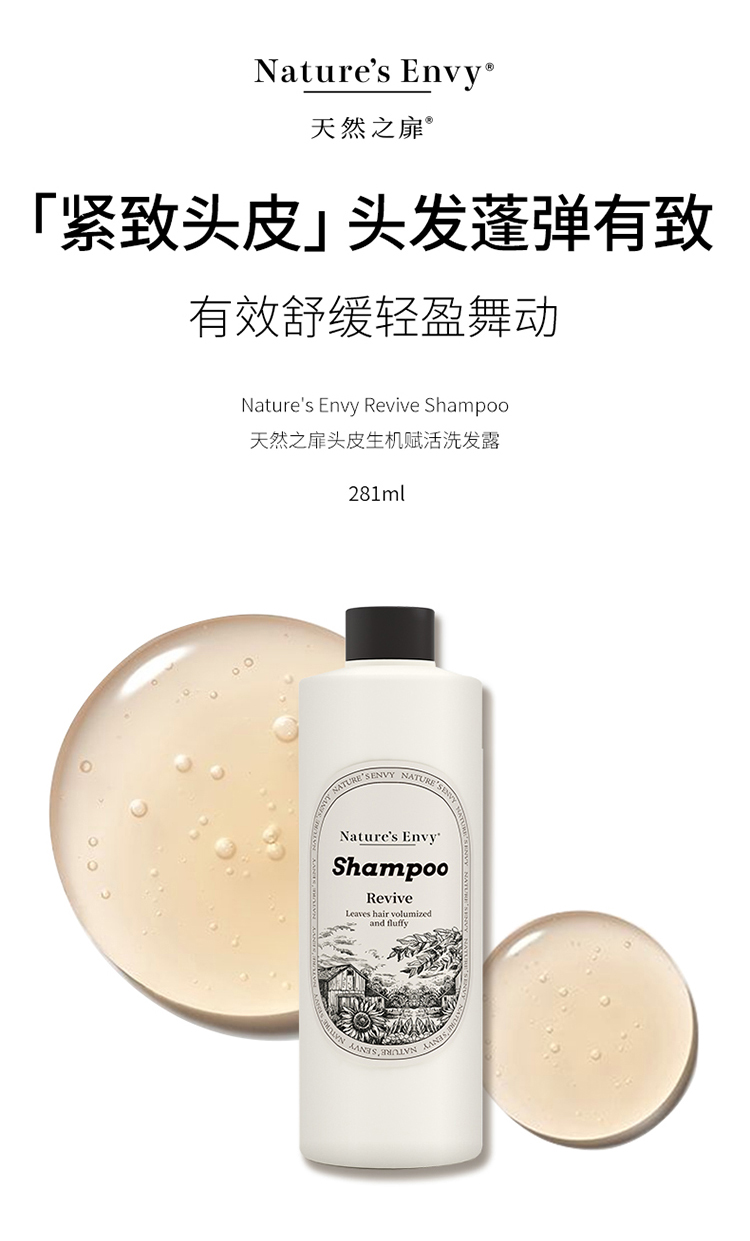 天然之扉头皮生机赋活洗发露采用新研配方,添加椰子油、蓝桉叶油、黄芩根提取物等甄选植物成分。净漖头皮的同时,减少头皮刺激,紧致头皮。发丝弹滑蓬松,焕发秀发生机与活力,让你时刻闪耀迷人自信。使用方法:取适量本品涂于湿发,充分技摩使其产生泡沫。用清水冲洗干净。为达到更好的效果,可配合使用天然之扉护发乳。