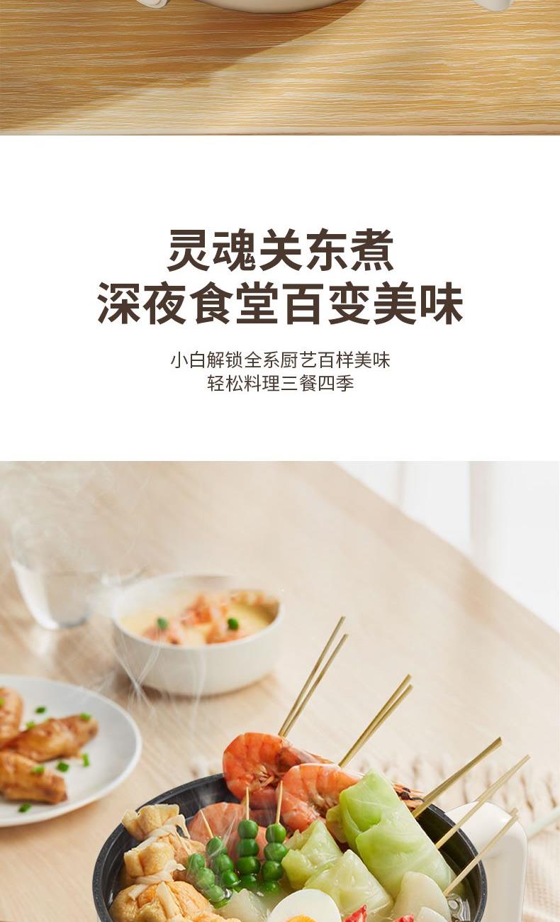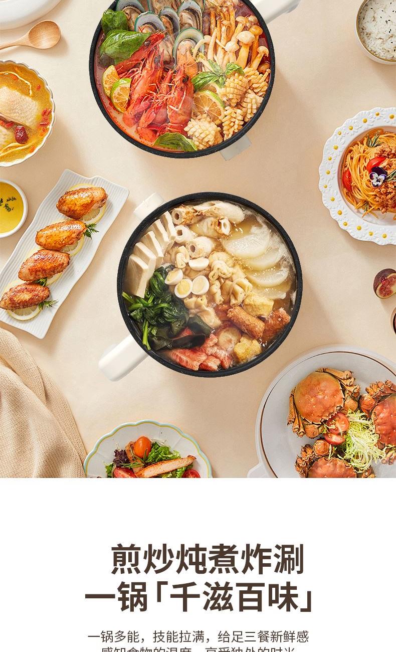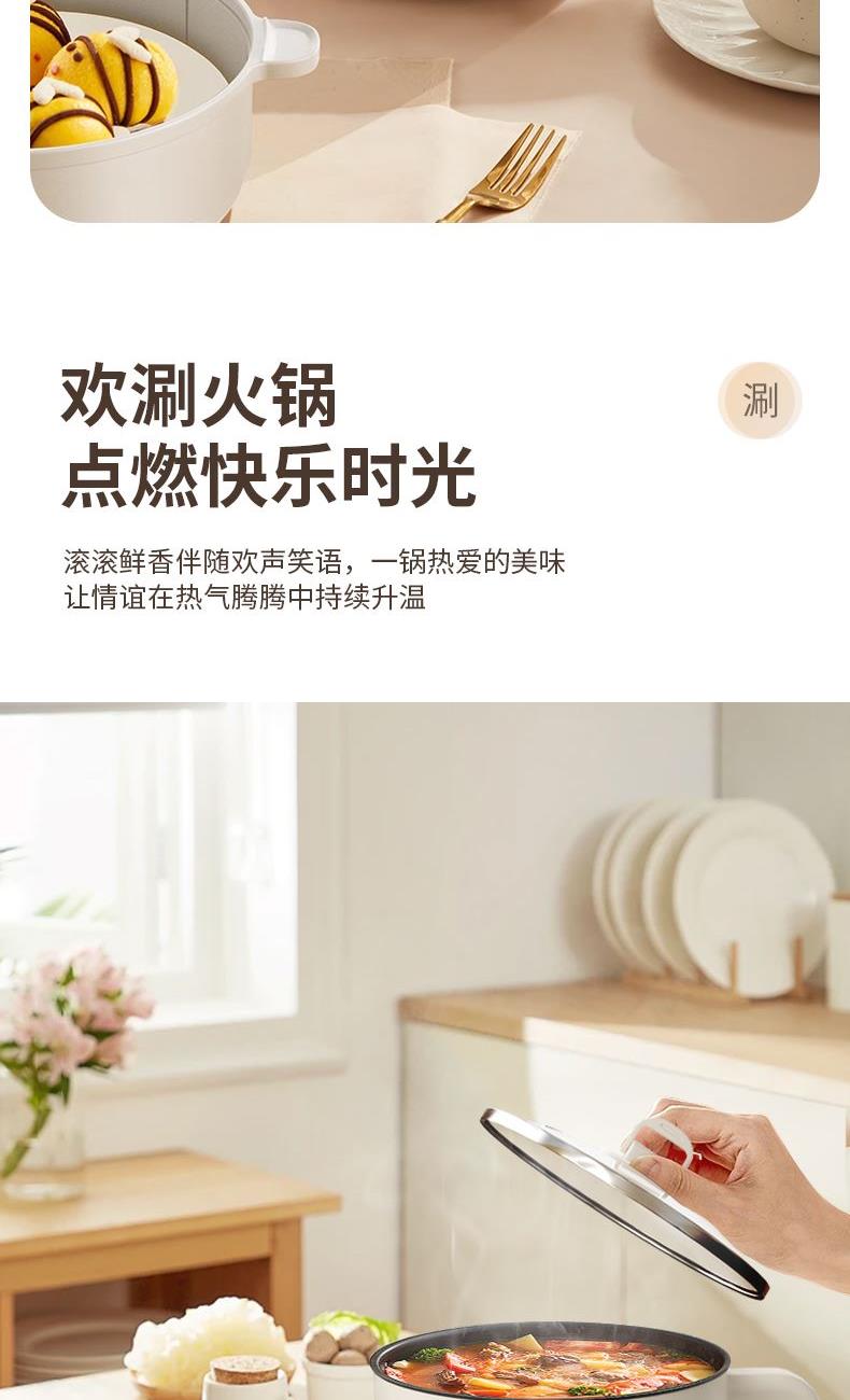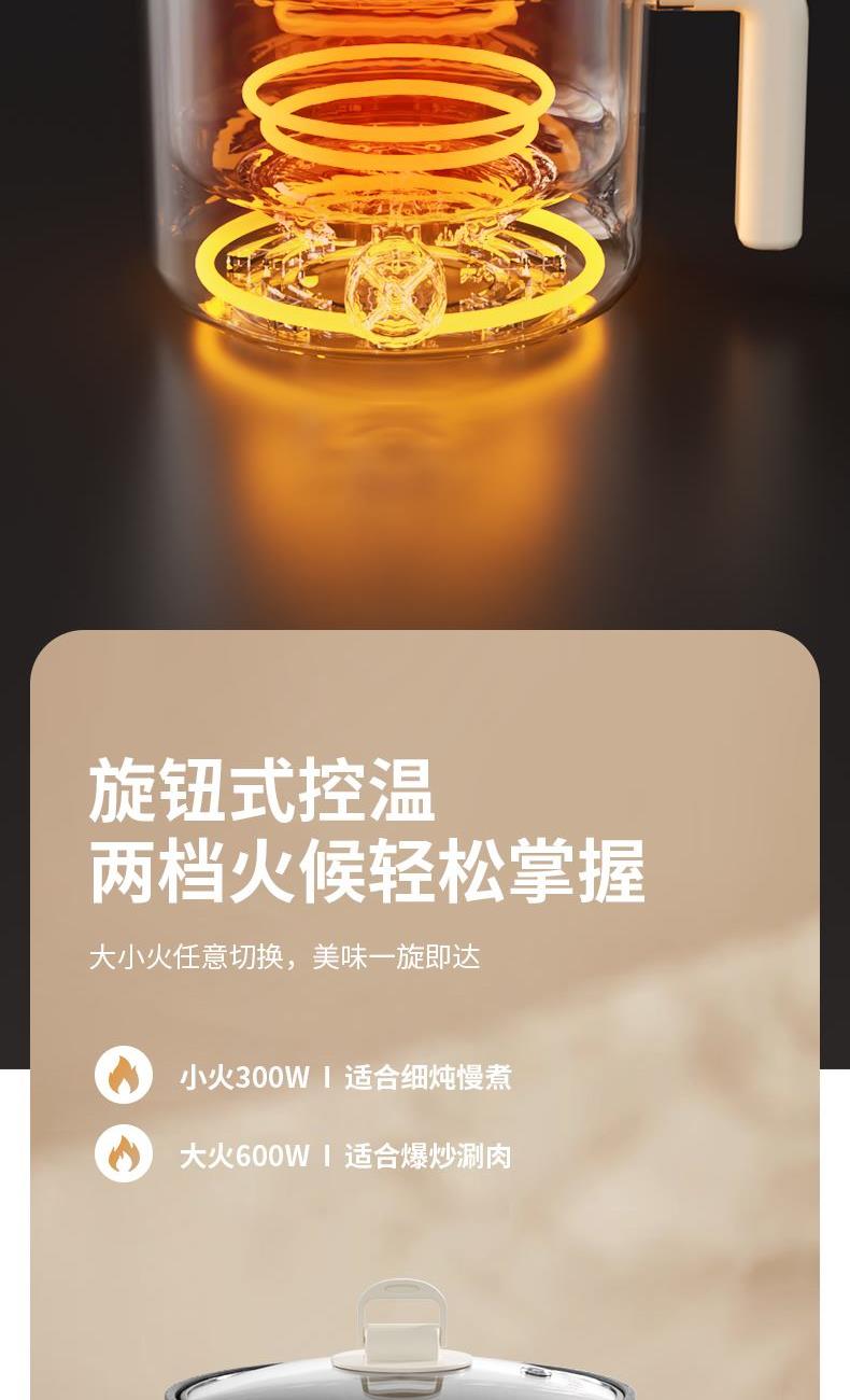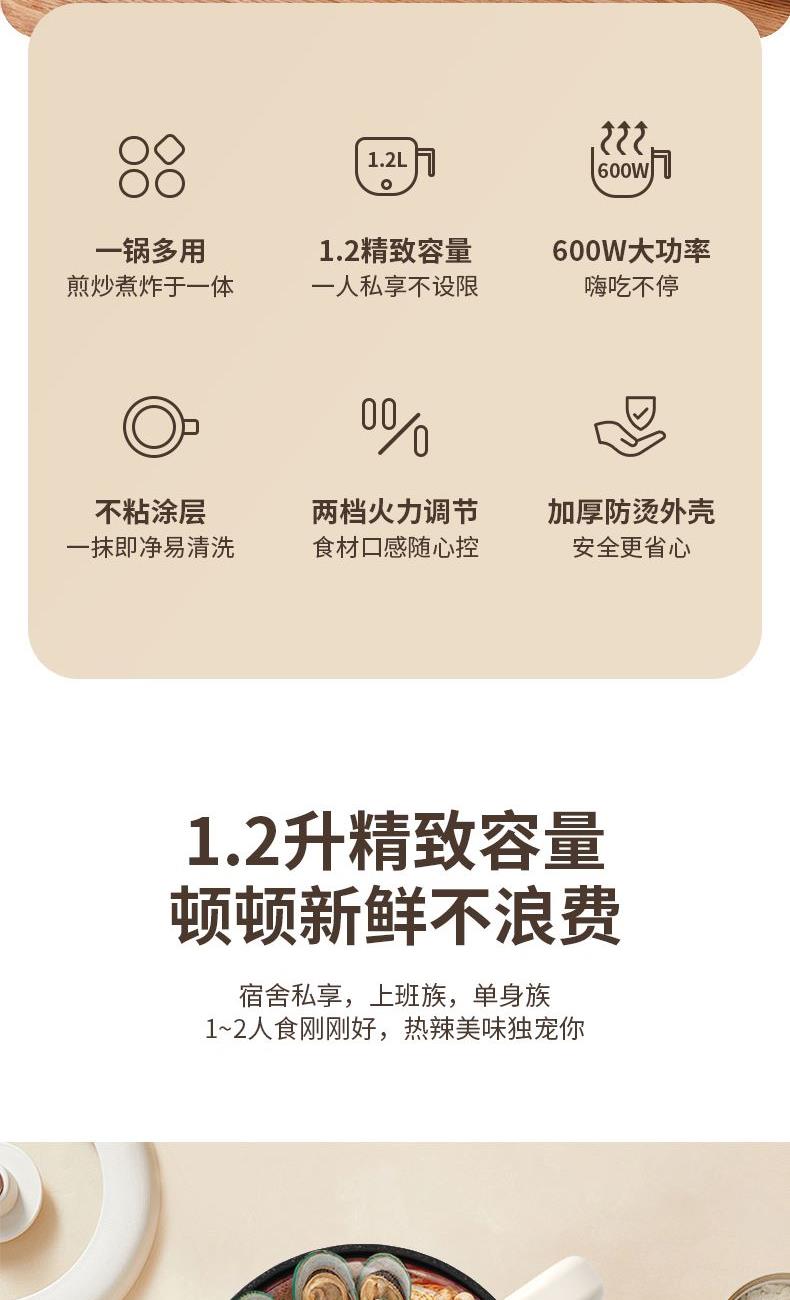 分离式插头收纳更方便 | 便携把手防烫防滑拿取更安心 | 超温、干烧自动断电 | 两档火候,大火涮火锅,快熟不久候 | 加班时刻,泡面快煮,不饿肚子,实现宵夜自由 | 双层防烫,端锅吃面。