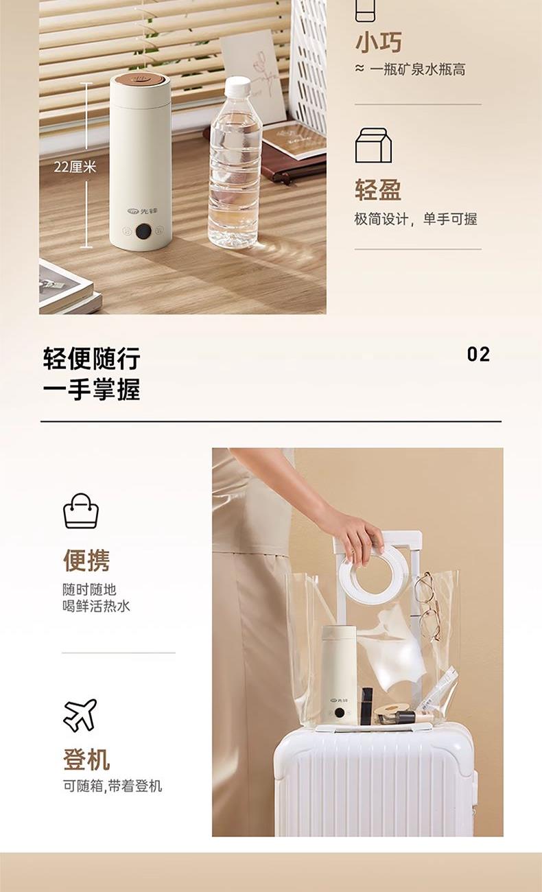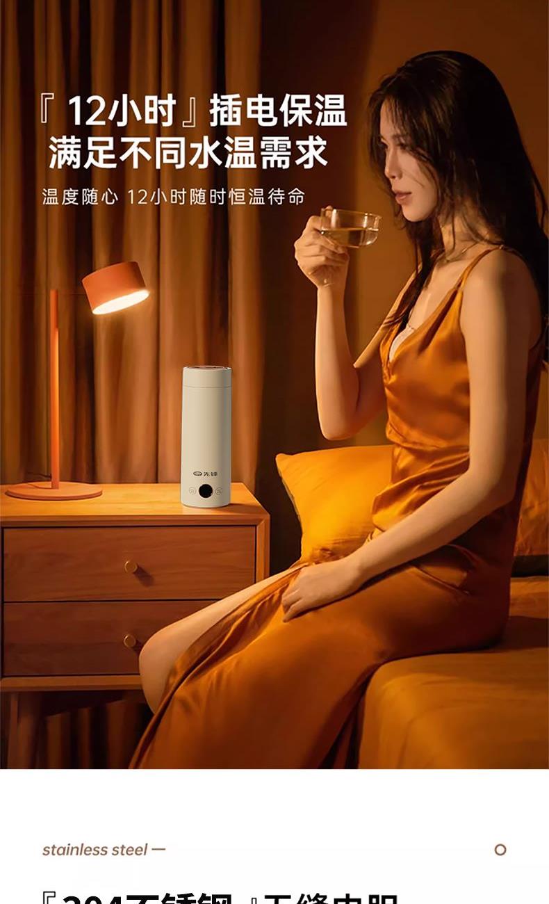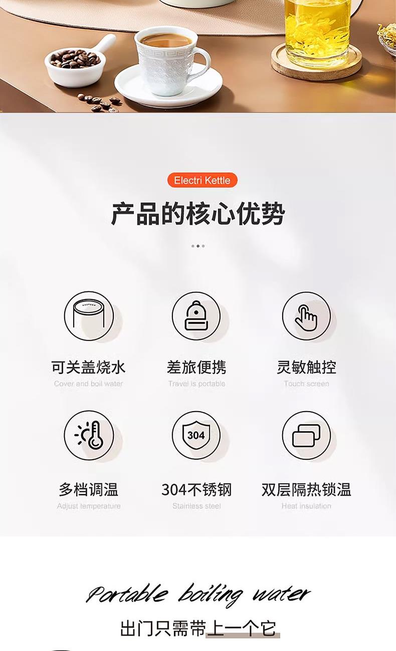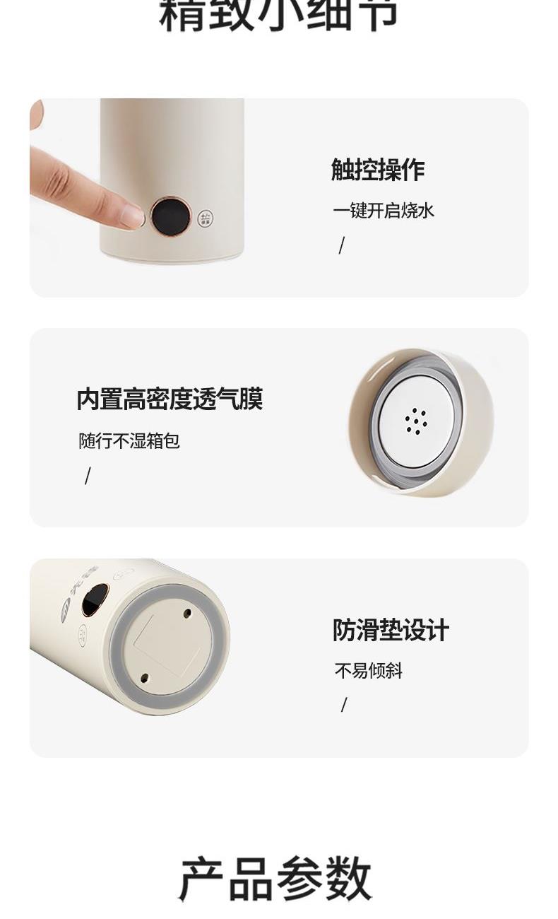 彩盒尺寸:102*102*250mm 大外箱尺寸:540*506*440mm 单台净重:0.60kg 单台毛重:0.65kg 额定容量:400mL 额定电压:220V~ 额定频率:50Hz 额定功率:300W产品条码:6977197070847 包装方式:彩盒+大外箱 6977197070847 400ml容量,出行好帮手 | 304不锈钢材质,耐热耐腐蚀,安心使用 | 300w功率 | 关盖烧水,安全无忧,长效保温 | 小巧轻盈,从容携带