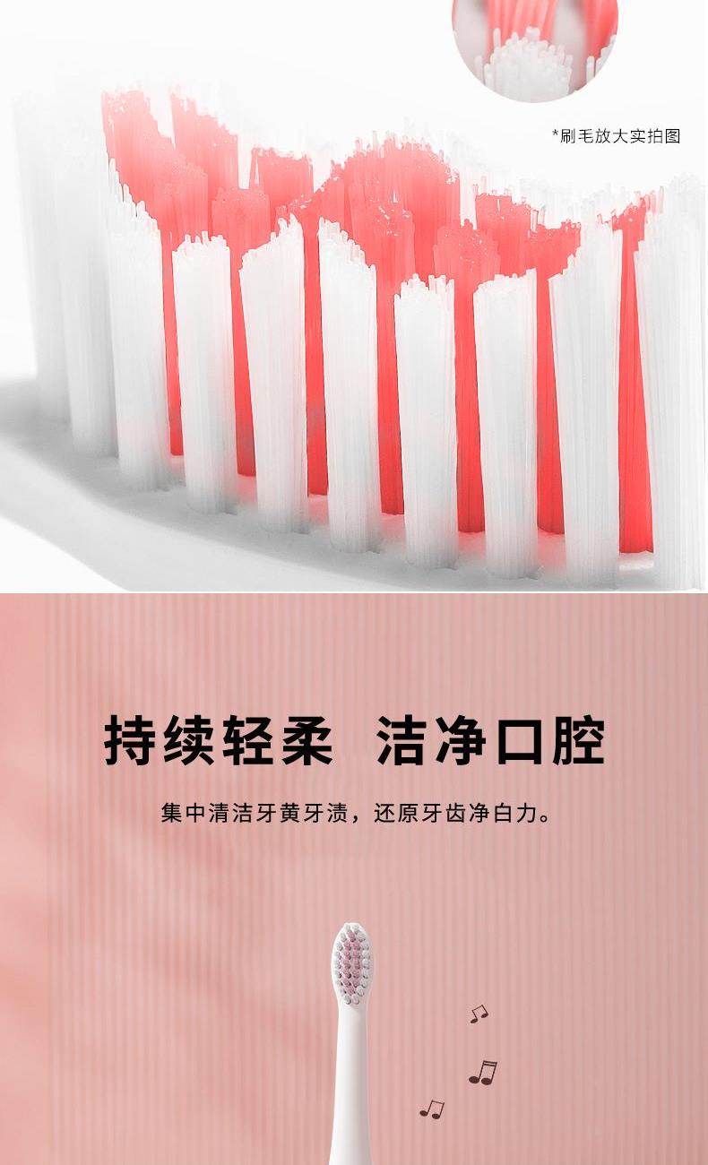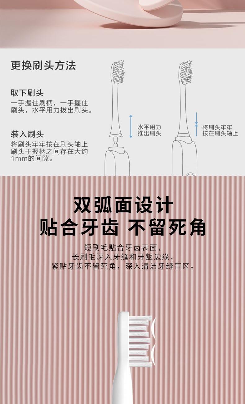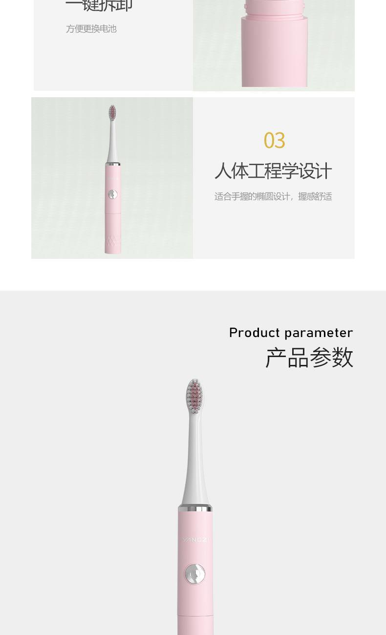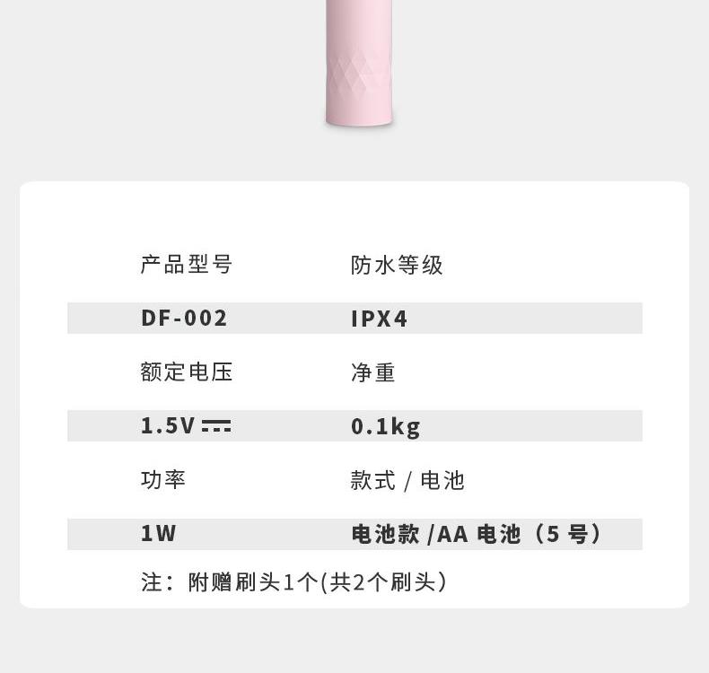 包装尺寸:50*26*220mm 外箱包装:470*460*570mm 包装材料:彩包 额定电压:1.5V~ 产品功率:1W 单台净重:0.1kg 材 质:ABS 刷 头:2个 双面弧设计,贴合牙齿,不留死角 高密度植毛,清洁效果显著提升 高效瓦解牙渍,深入牙缝亮白牙齿