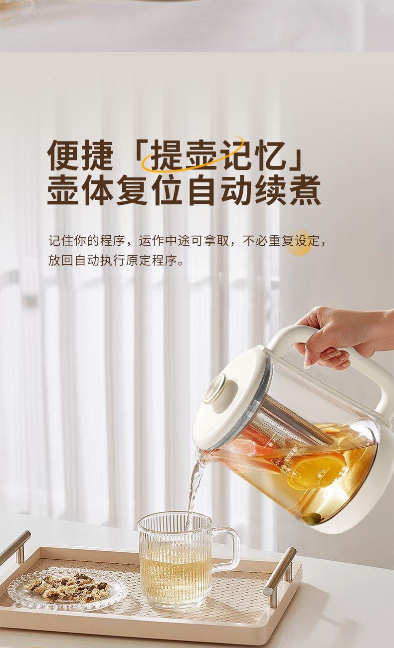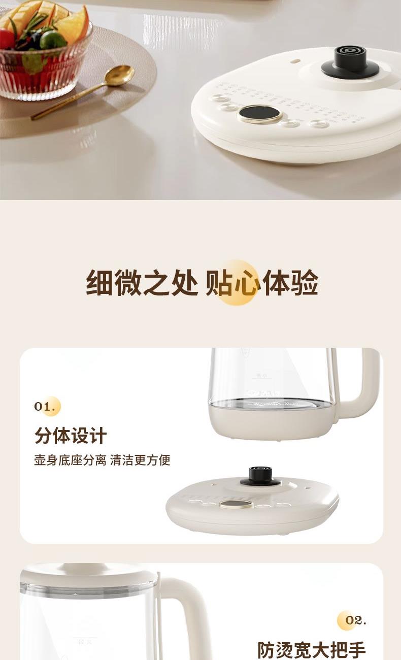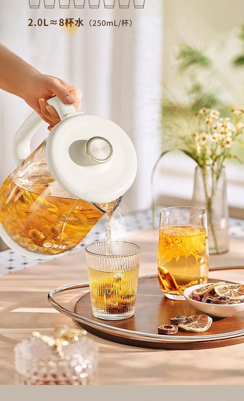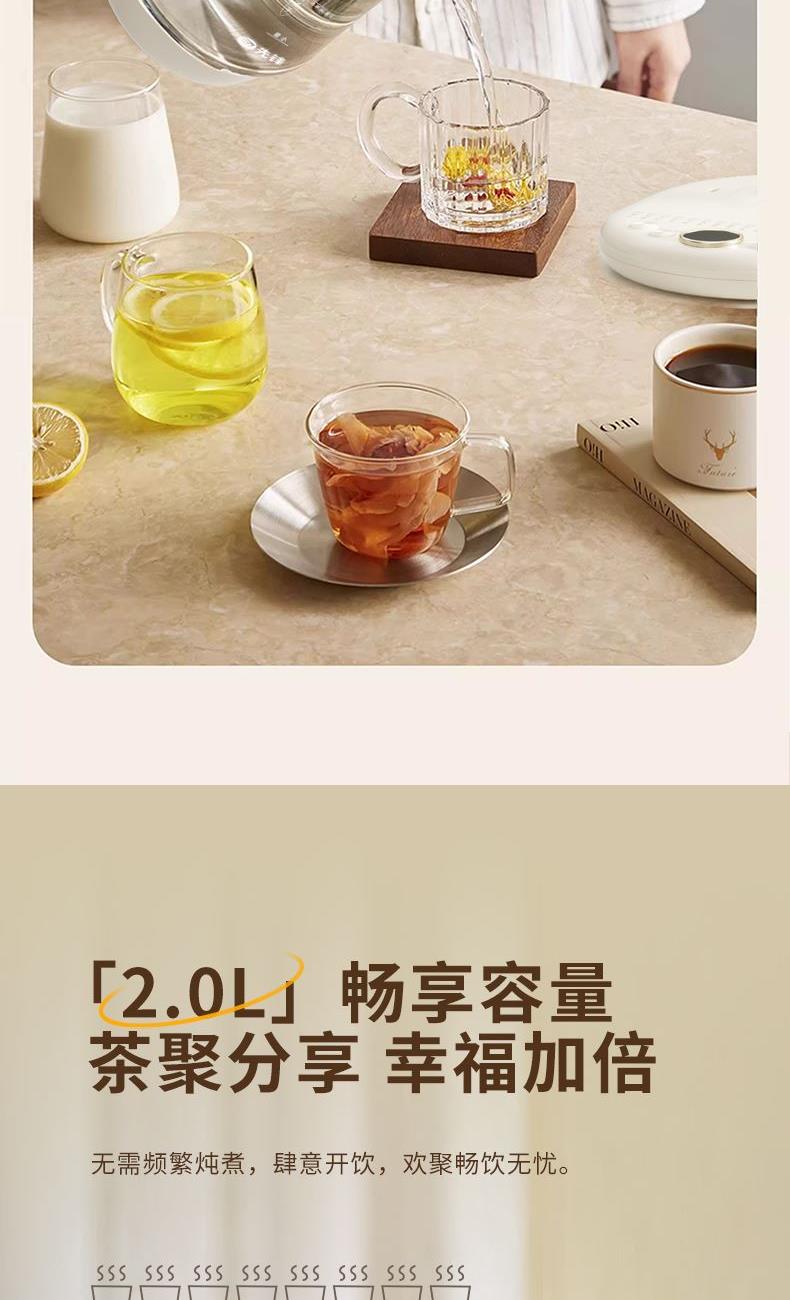彩盒尺寸:265*235*285mm 大外箱尺寸:760*550*595mm 单台净重:1.12kg 单台毛重:1.51kg 额定容量:2.0L 额定电压:220V~ 额定频率:50Hz 额定功率:800W 产品条码:6977197070823 包装方式:彩盒+大外箱 6977197070823 2.0L大容量,办公家居都实用 | 304不锈钢,高硼硅玻璃 | 800W大功率 | 16大智煮功能,一壶满足日常所需 | 24小时可调预约。