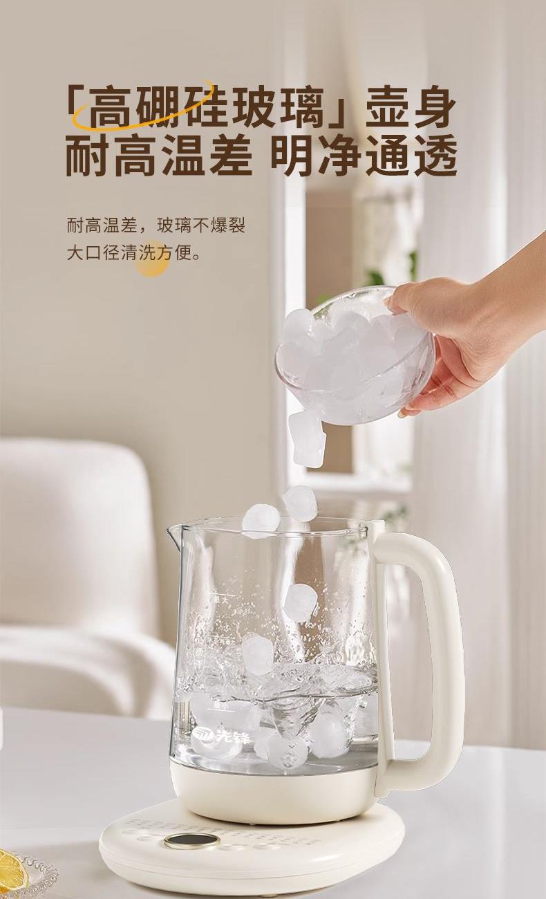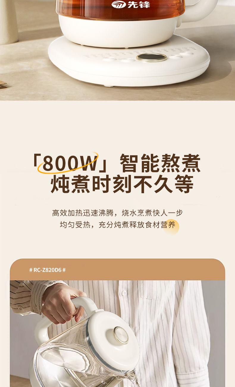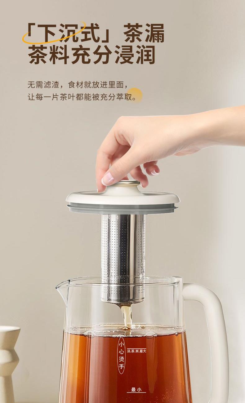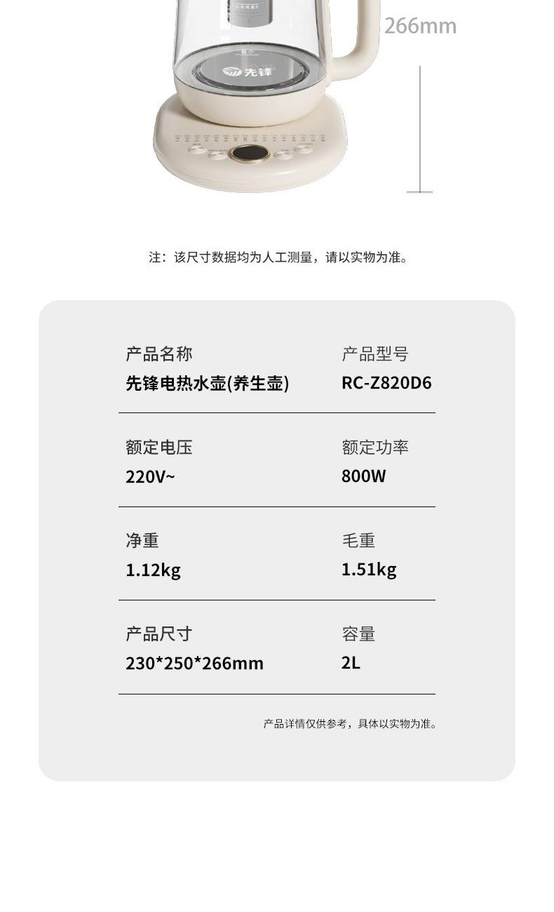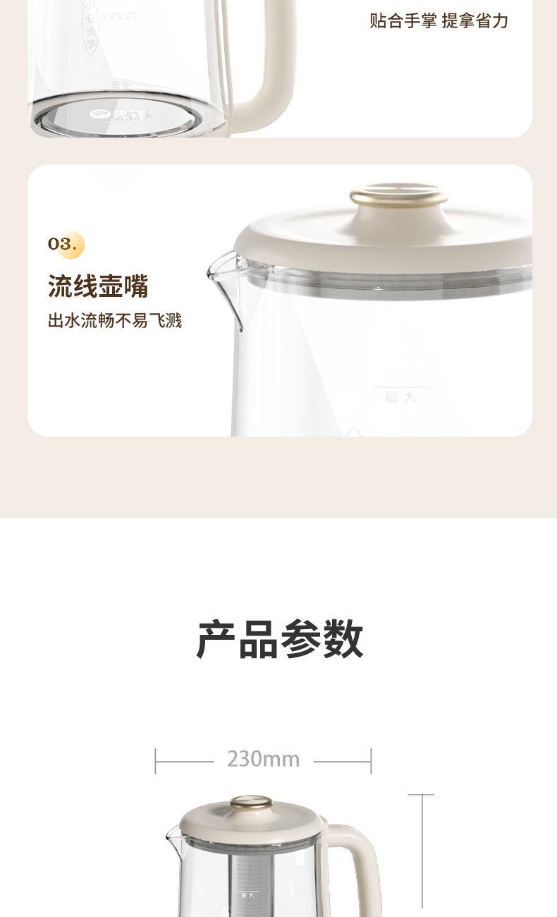 彩盒尺寸:265*235*285mm 大外箱尺寸:760*550*595mm 单台净重:1.12kg 单台毛重:1.51kg 额定容量:2.0L 额定电压:220V~ 额定频率:50Hz 额定功率:800W 产品条码:6977197070823 包装方式:彩盒+大外箱 6977197070823 2.0L大容量,办公家居都实用 | 304不锈钢,高硼硅玻璃 | 800W大功率 | 16大智煮功能,一壶满足日常所需 | 24小时可调预约。