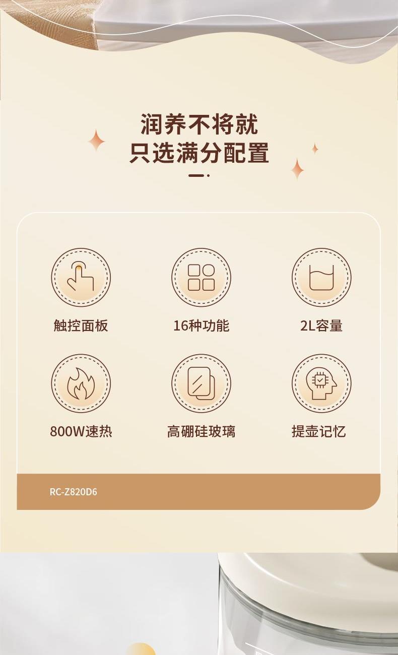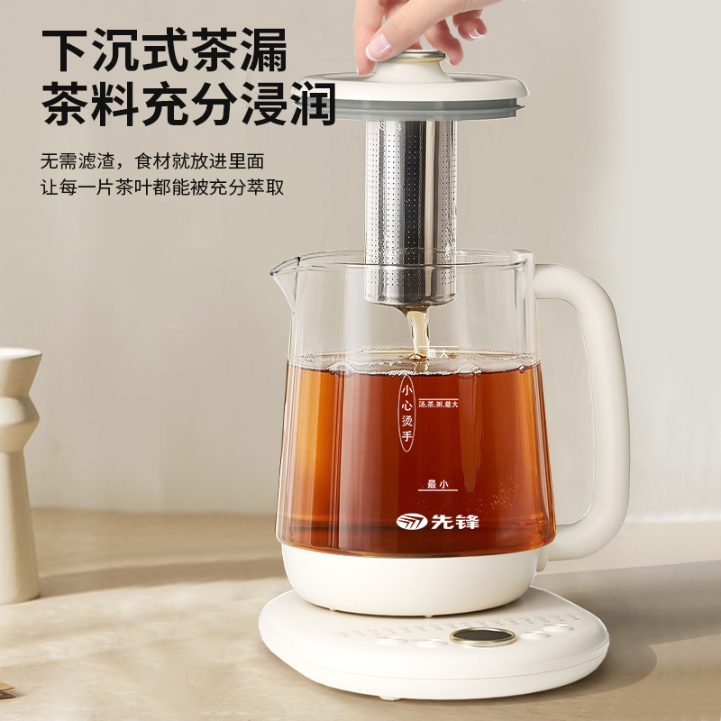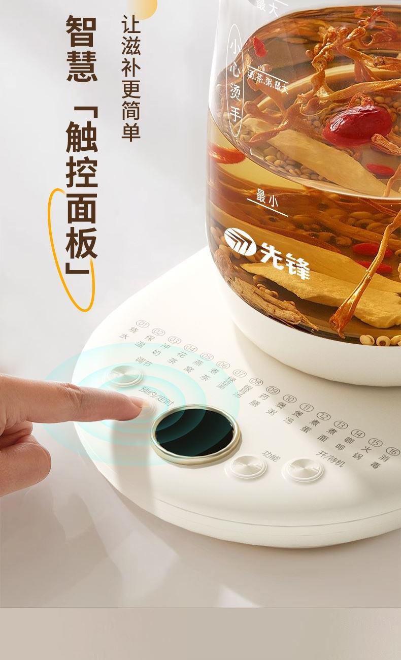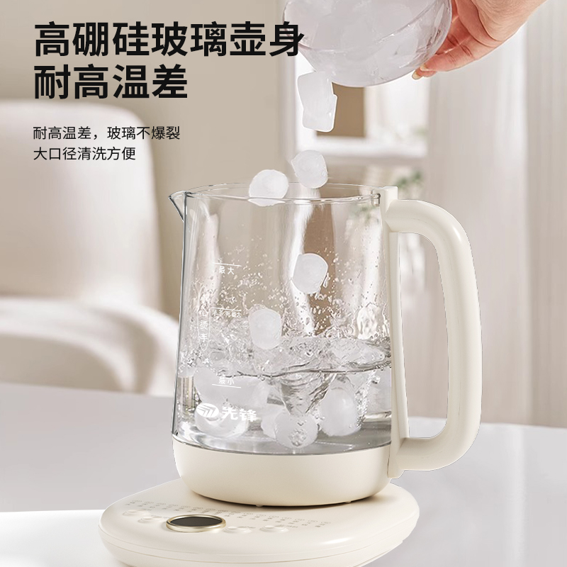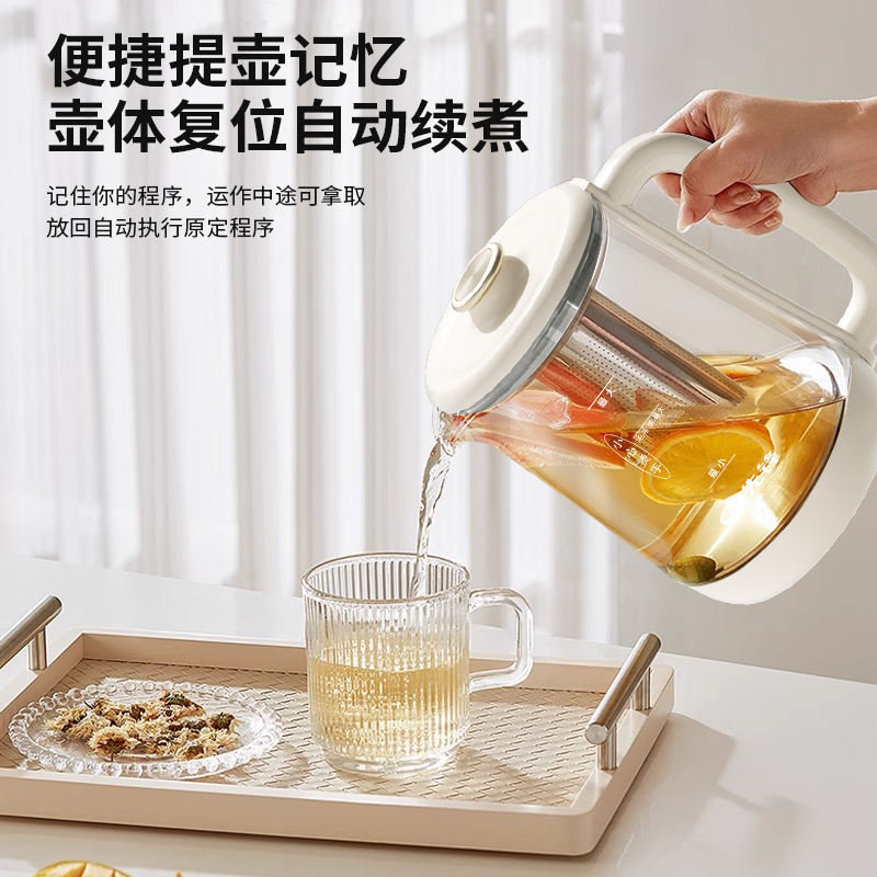 彩盒尺寸:265*235*285mm 大外箱尺寸:760*550*595mm 单台净重:1.12kg 单台毛重:1.51kg 额定容量:2.0L 额定电压:220V~ 额定频率:50Hz 额定功率:800W 产品条码:6977197070823 包装方式:彩盒+大外箱 6977197070823 2.0L大容量,办公家居都实用 | 304不锈钢,高硼硅玻璃 | 800W大功率 | 16大智煮功能,一壶满足日常所需 | 24小时可调预约。
