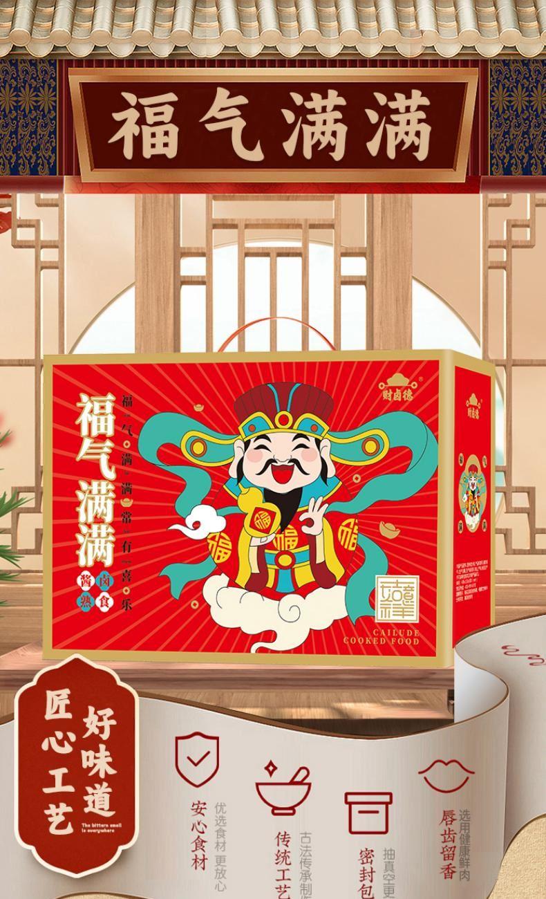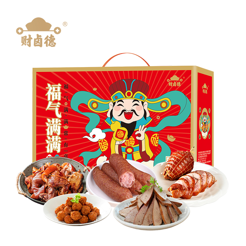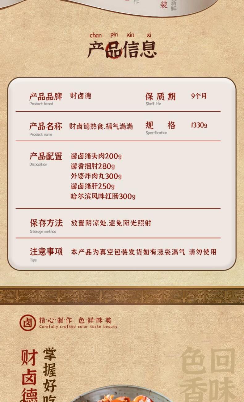 1.酱卤猪头肉200g 2.酱香捆肘280g 3.外婆炸肉丸300g 4.酱卤猪肝250g 5.哈尔滨风味红肠300g