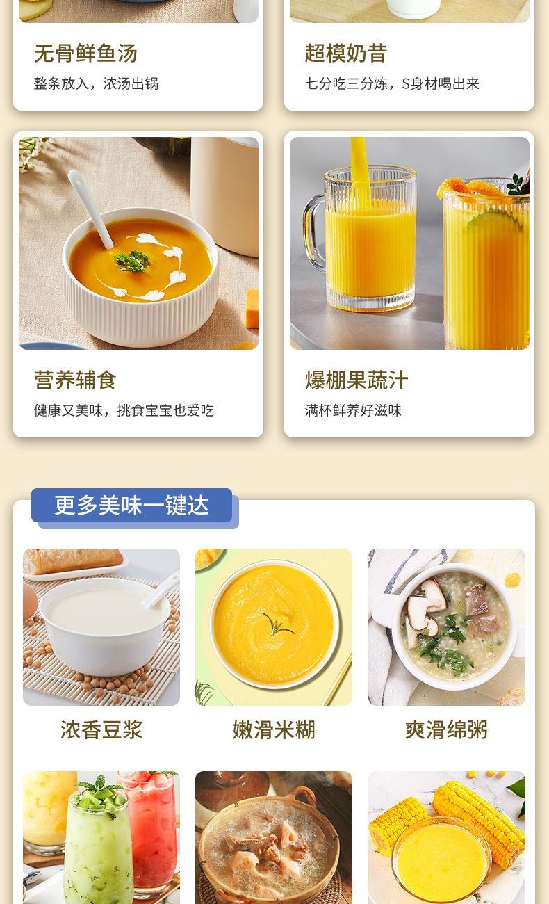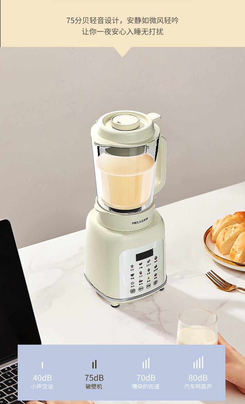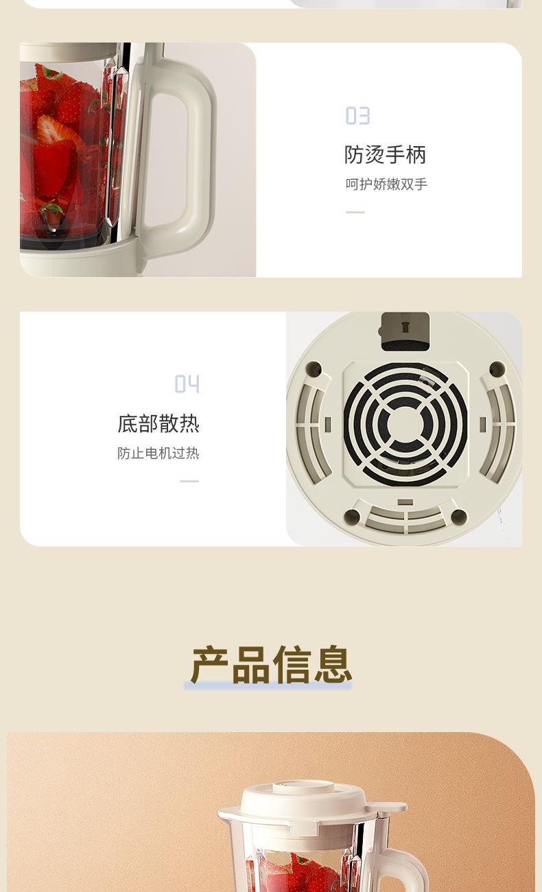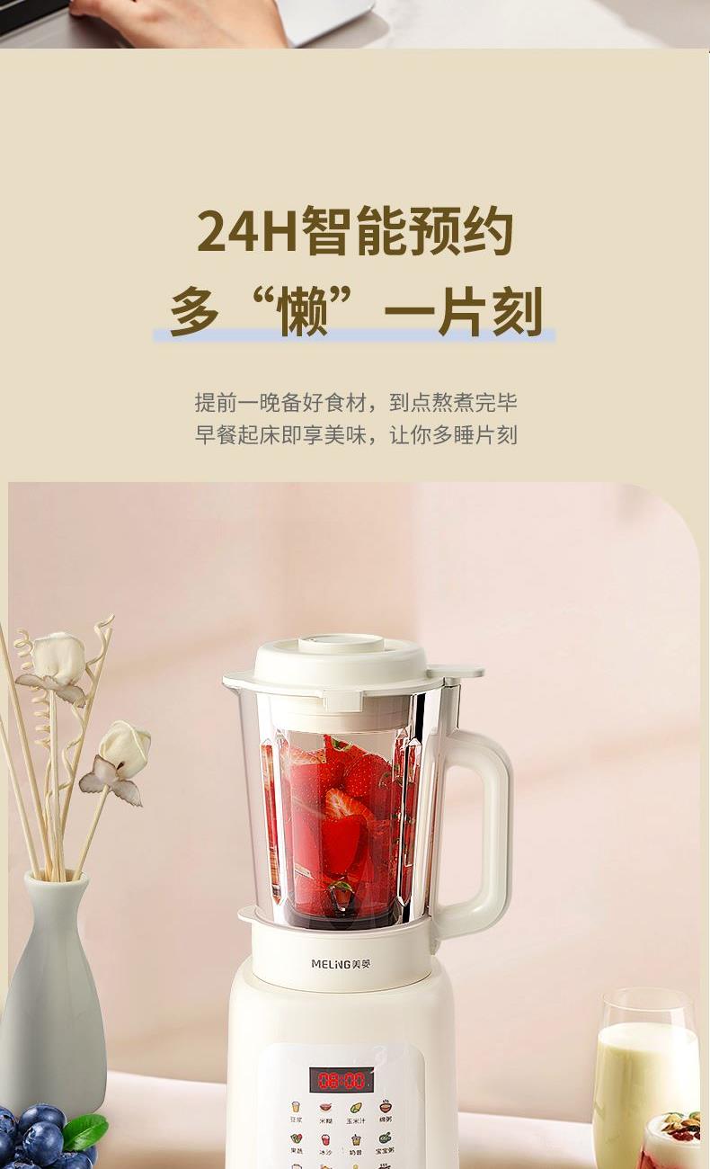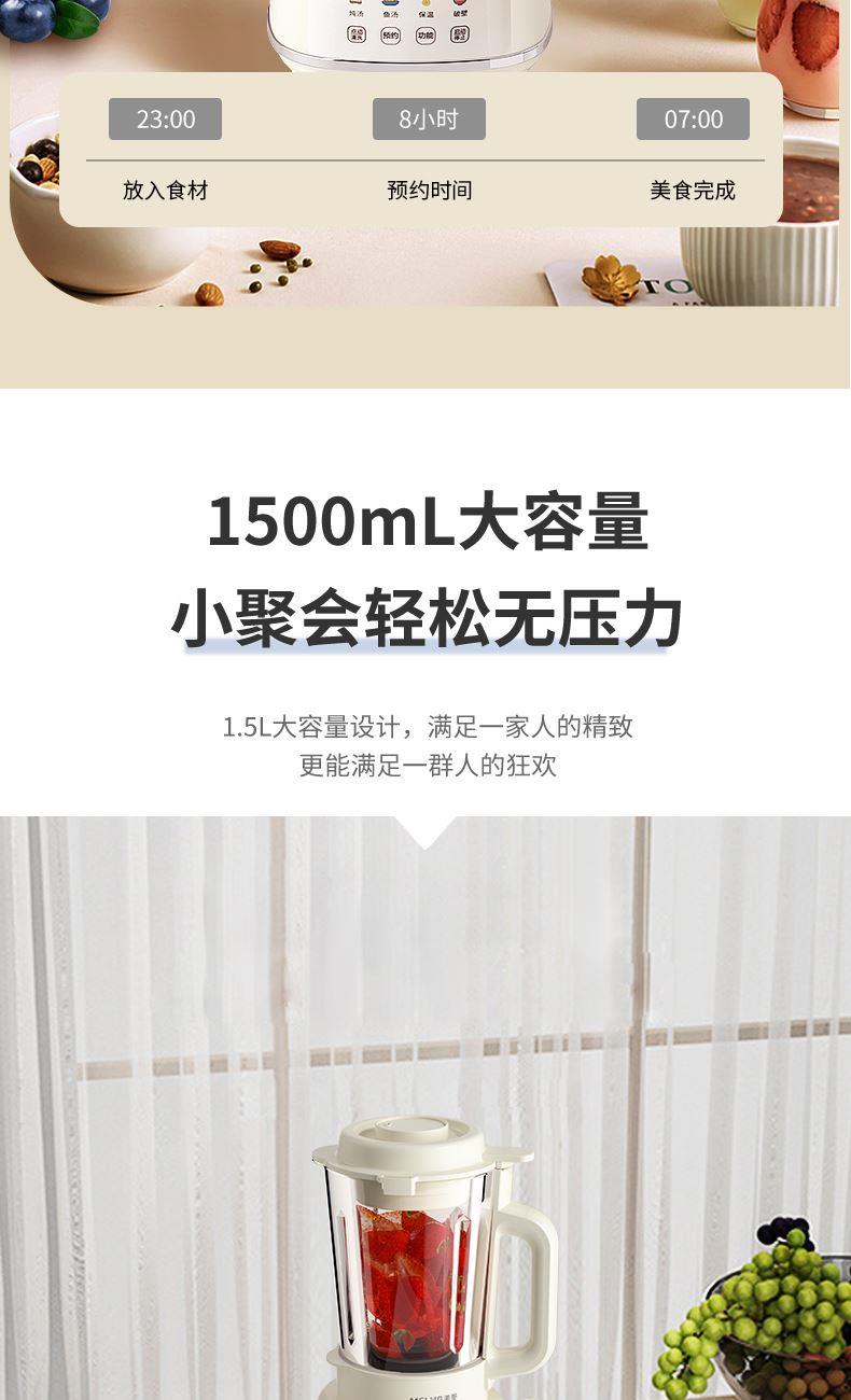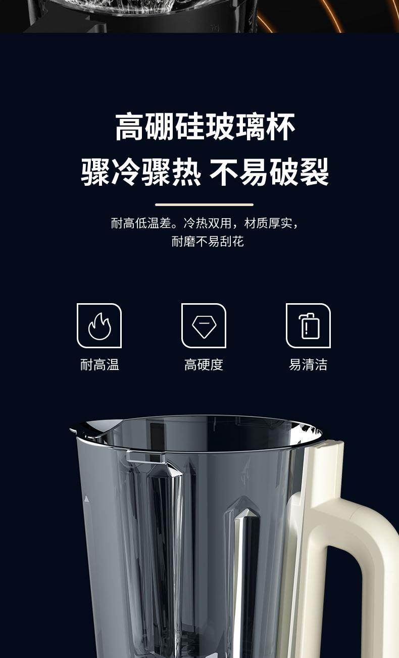 包装尺寸:419*254*334mm 外箱尺寸:523*433*686mm 单台毛重:4 kg 单台净重:3.2kg 包装材料:彩包 额定电压:220V 额定频率:50Hz 加热功率:1200W 搅拌功率:400W 容 量:1500mL 产品条码: 6936897510961 冷、热饮,预约功能 | 多种菜单,一键操作 | 玻璃杯,卫生、健康,坚固耐用,易清洁 | 低噪音工作
