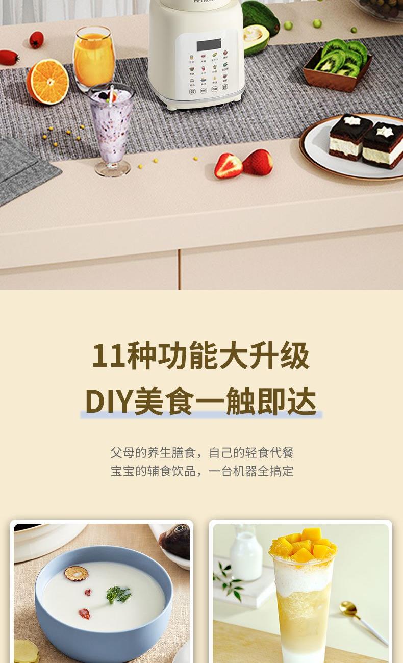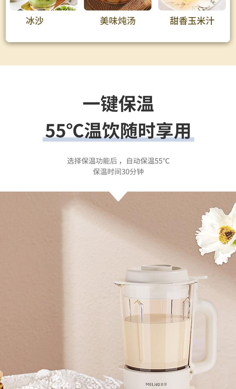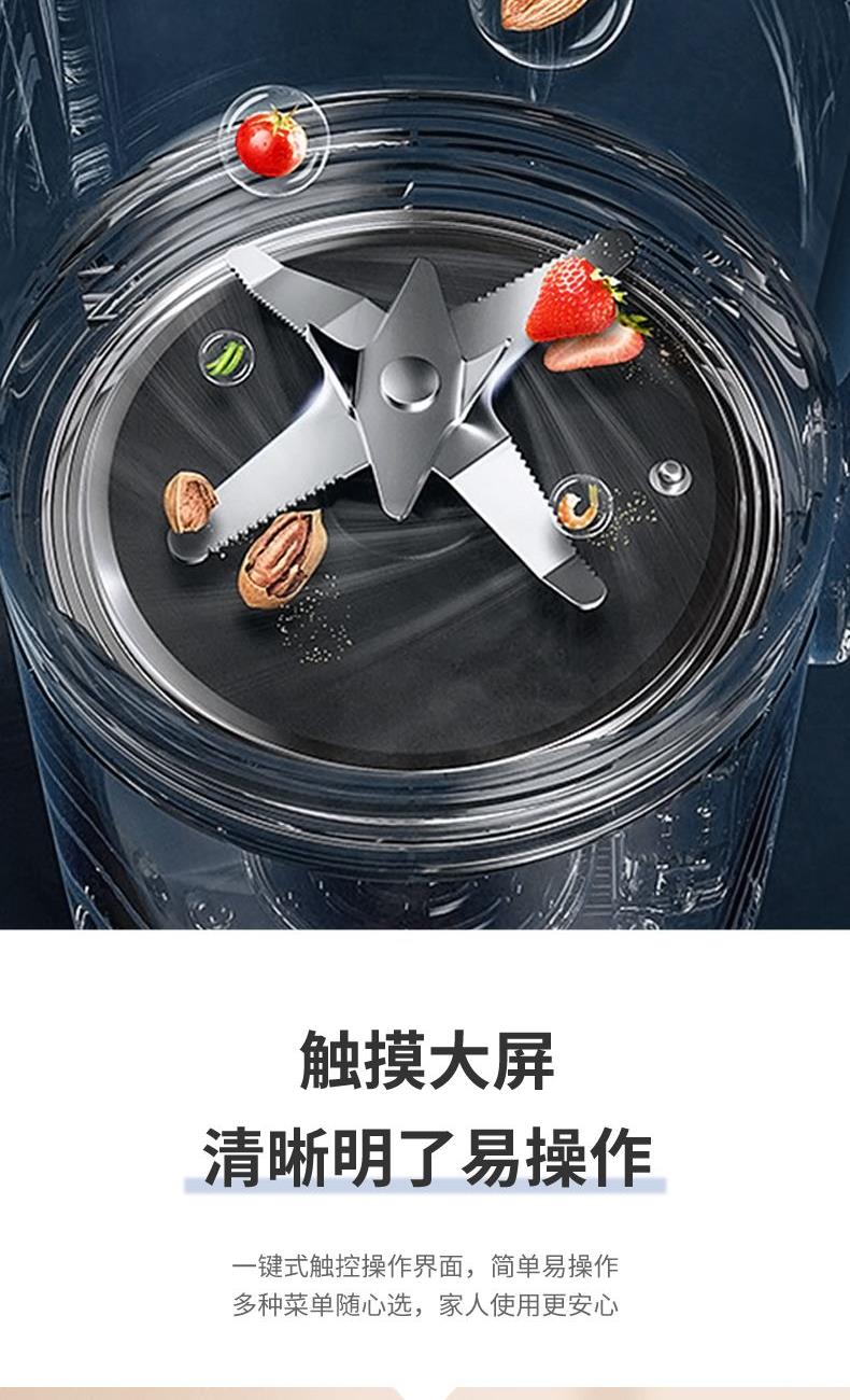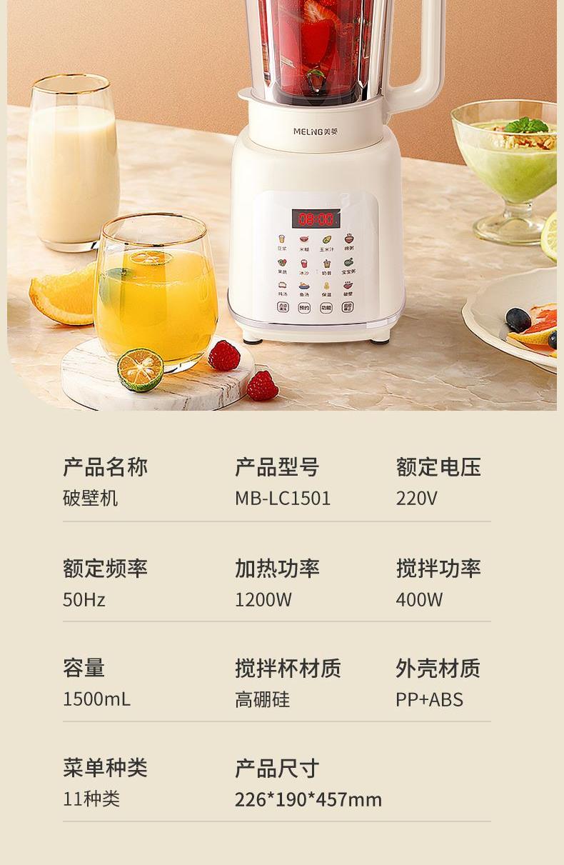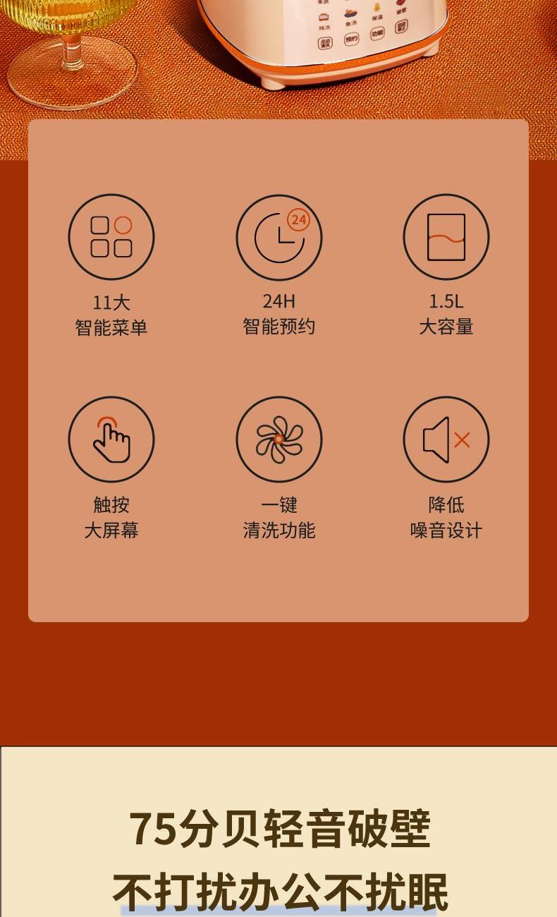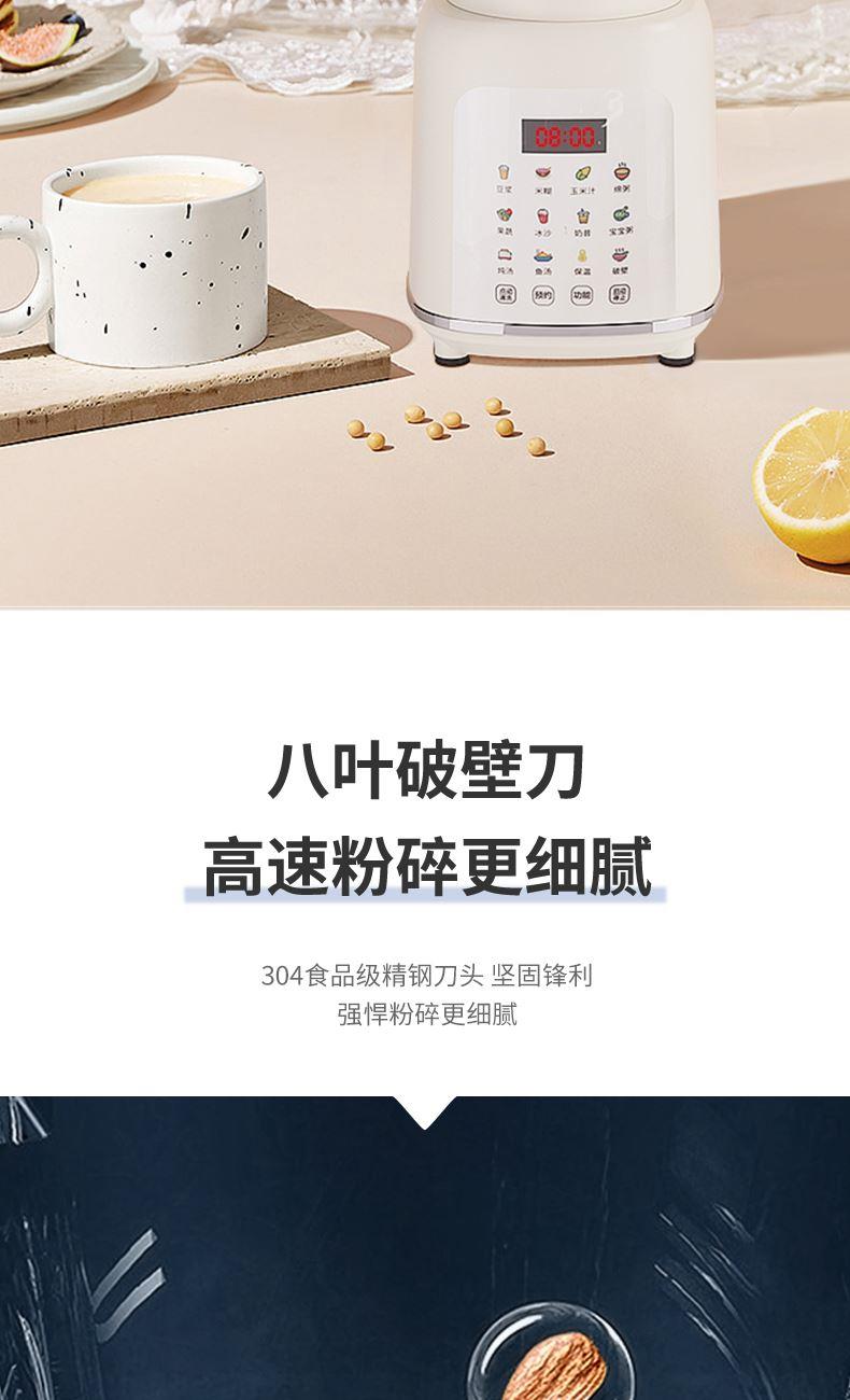 包装尺寸:419*254*334mm 外箱尺寸:523*433*686mm 单台毛重:4 kg 单台净重:3.2kg 包装材料:彩包 额定电压:220V 额定频率:50Hz 加热功率:1200W 搅拌功率:400W 容 量:1500mL 产品条码: 6936897510961 冷、热饮,预约功能 | 多种菜单,一键操作 | 玻璃杯,卫生、健康,坚固耐用,易清洁 | 低噪音工作