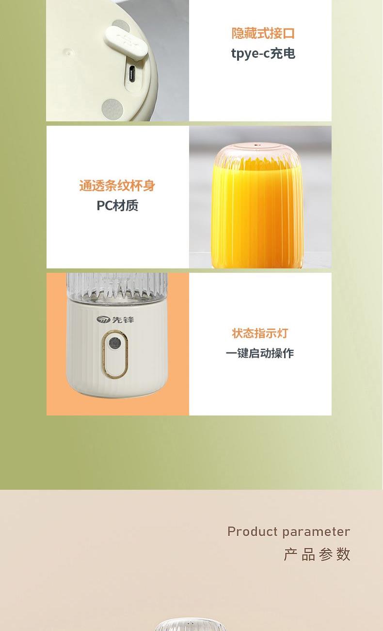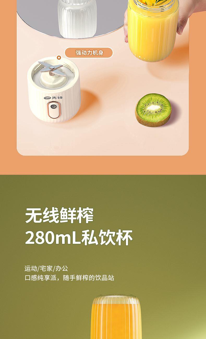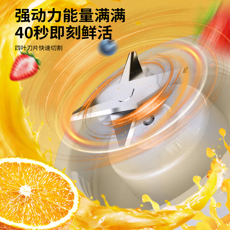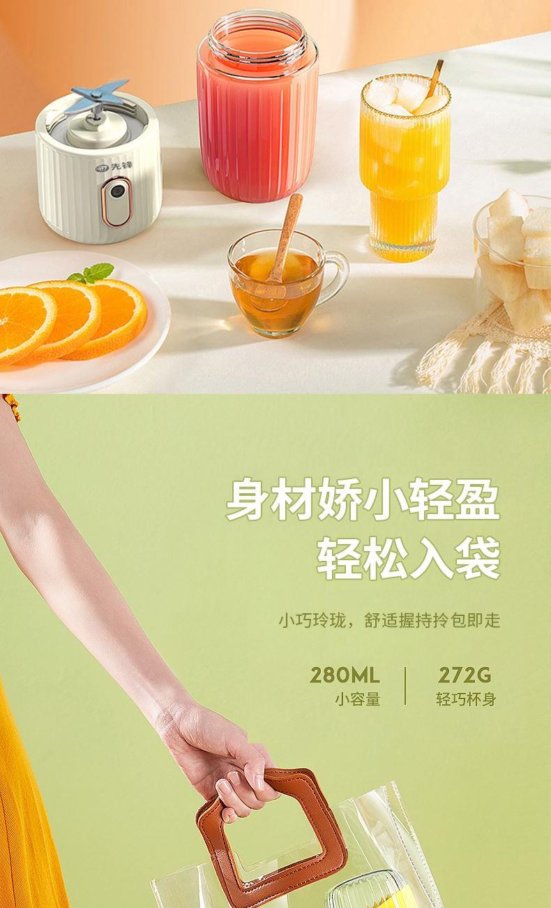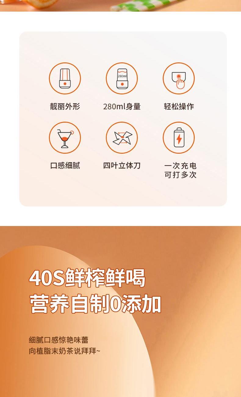 280ml容量,出行好帮手 | 食品级PC材质,安心使用 | 刀头304不锈钢 | 4叶刀头搅拌细腻 | 一键启动模式 | tpye-c充电,无线便携,现榨鲜喝 | 小巧轻盈,从容携带