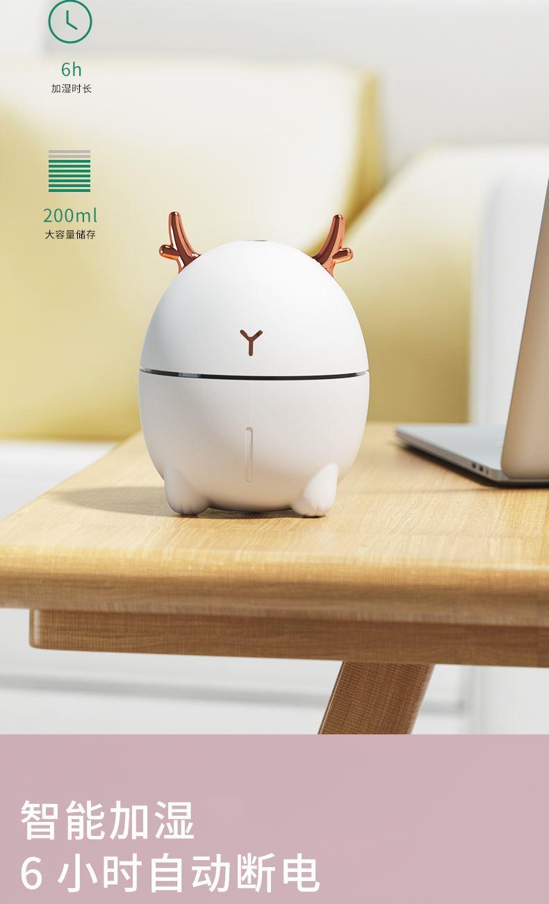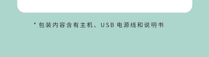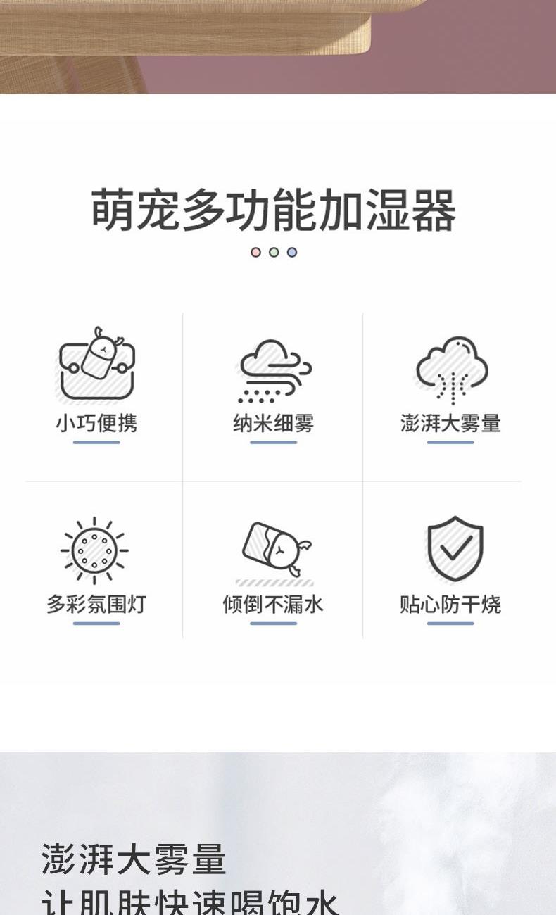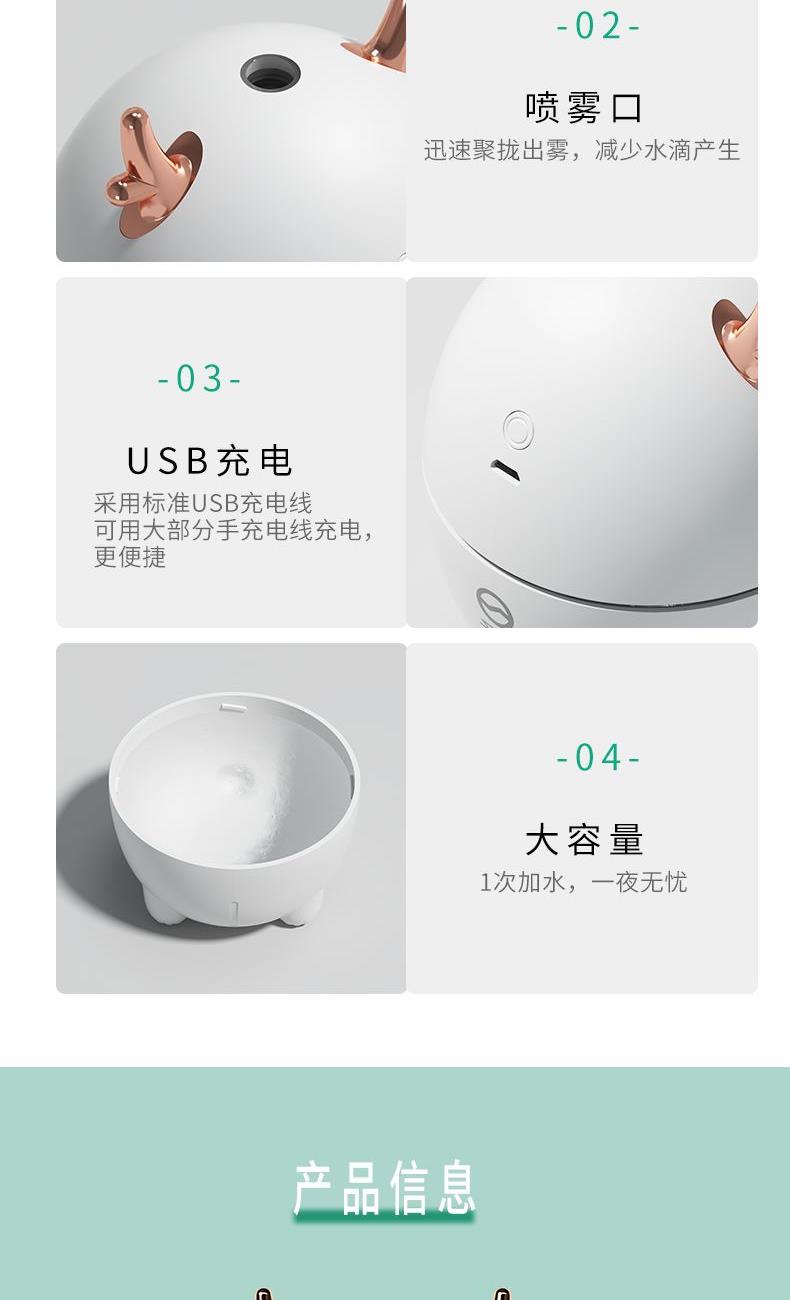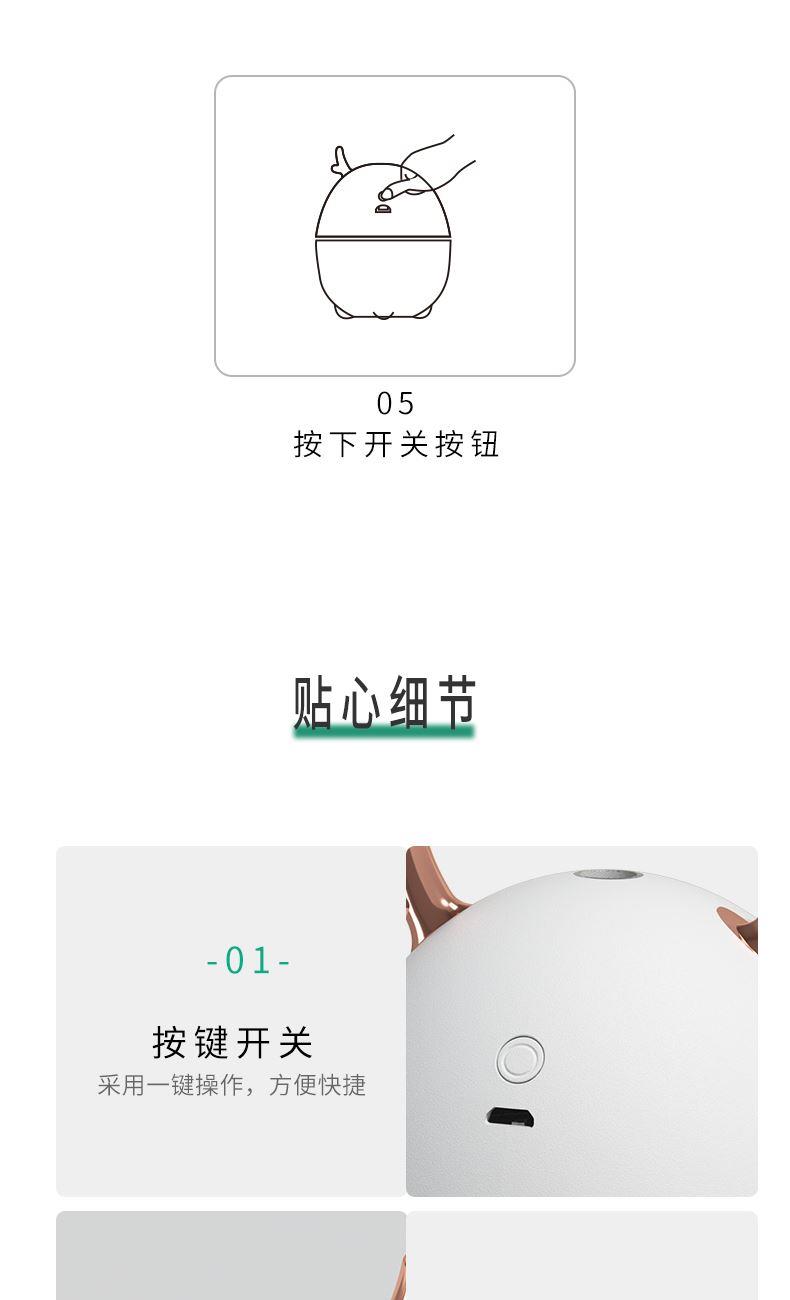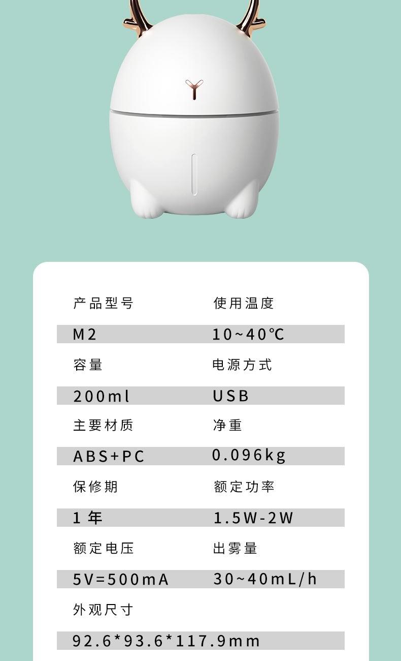 包装尺寸:95*95*126mm 外箱包装:500*405*525mm 包装材料:彩包 额定电压:5V 产品功率:1.5-2W 单台毛重:0.152kg 单台净重:0.096kg 容 量:200mL 小巧萌宠,不湿桌面 多彩氛围灯,静音滋润一整晚 细雾索绕,空间不燥,出雾迅速,防干烧