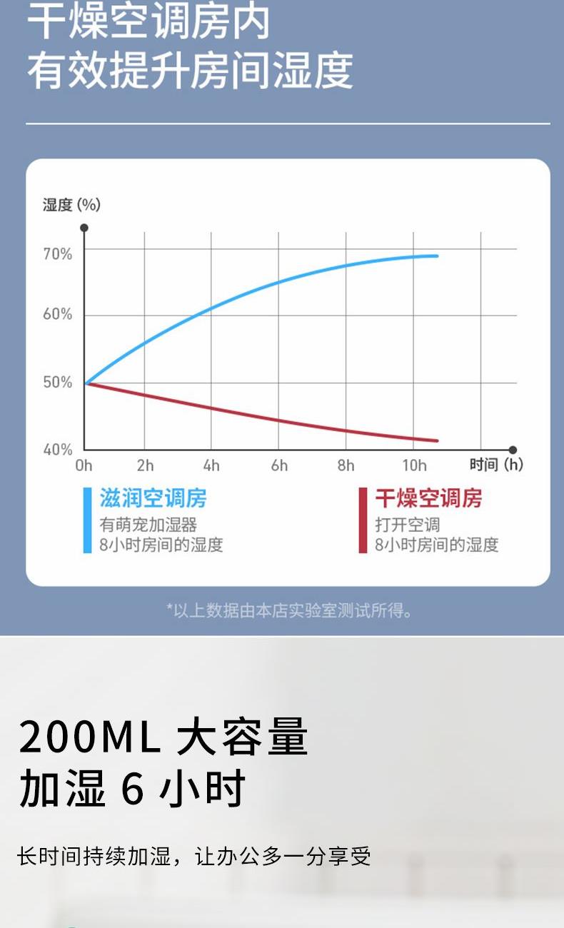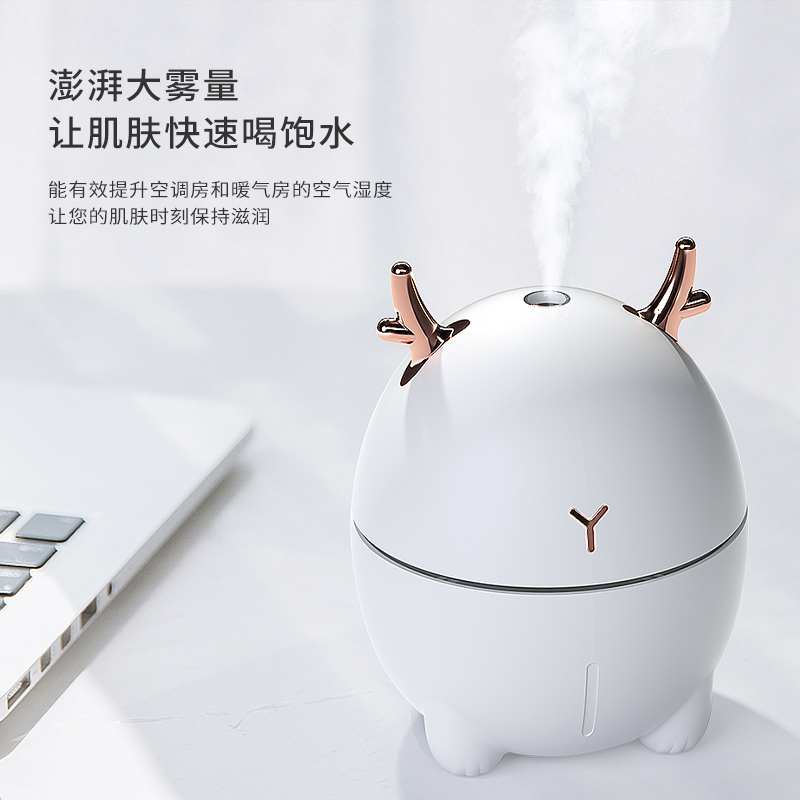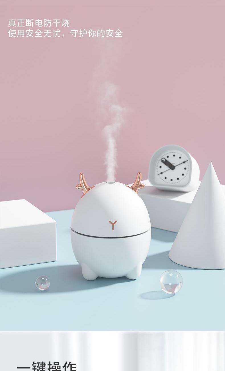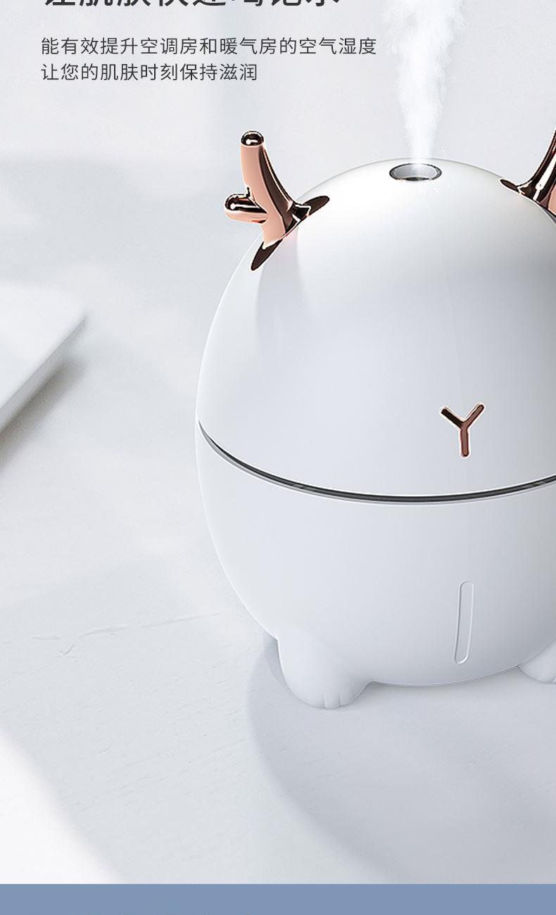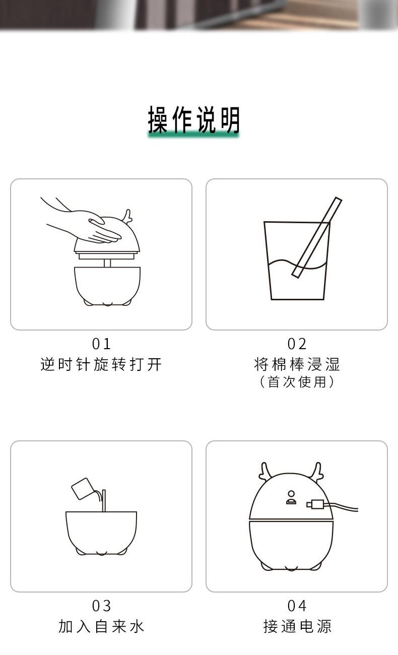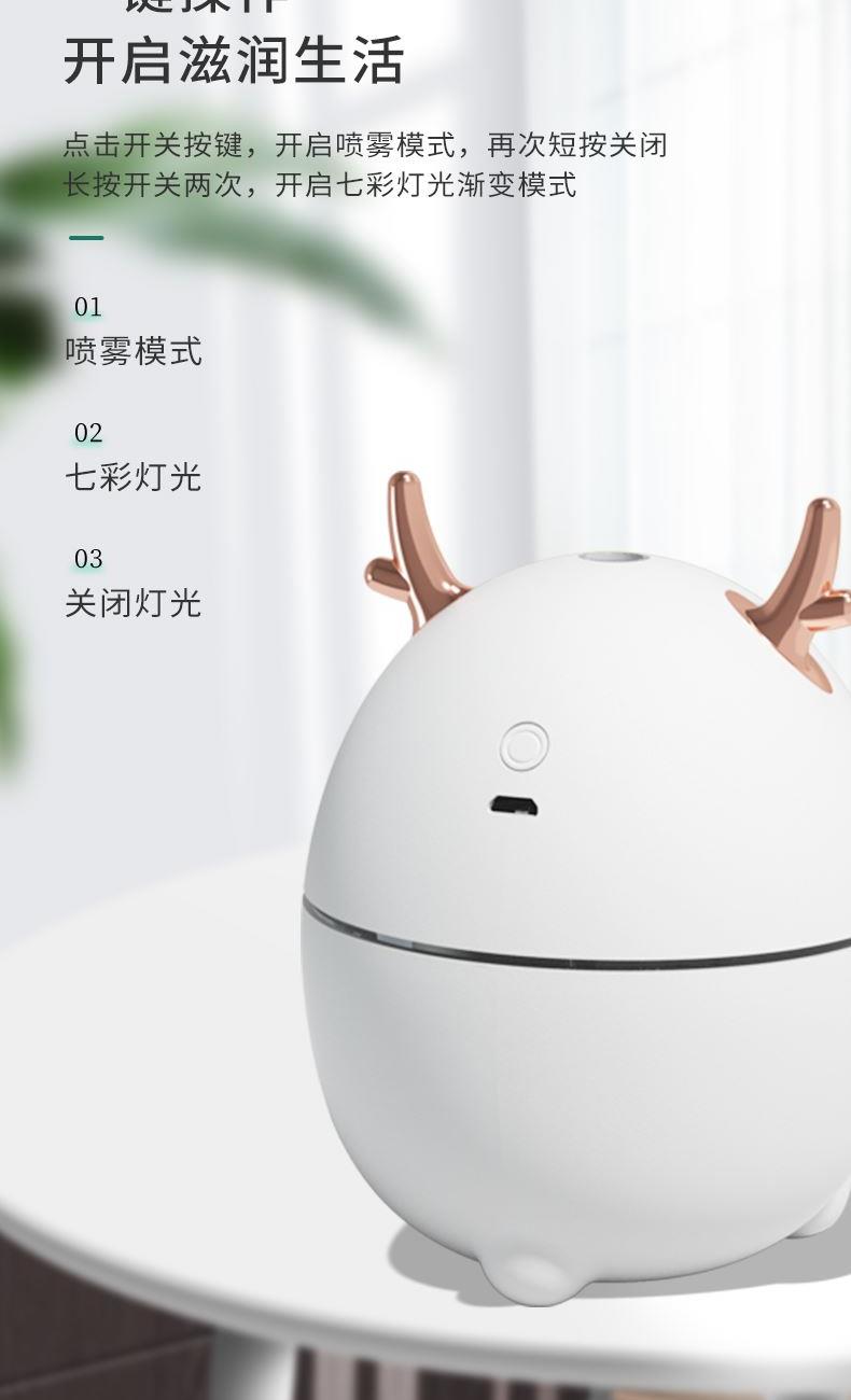 包装尺寸:95*95*126mm 外箱包装:500*405*525mm 包装材料:彩包 额定电压:5V 产品功率:1.5-2W 单台毛重:0.152kg 单台净重:0.096kg 容 量:200mL 小巧萌宠,不湿桌面 多彩氛围灯,静音滋润一整晚 细雾索绕,空间不燥,出雾迅速,防干烧