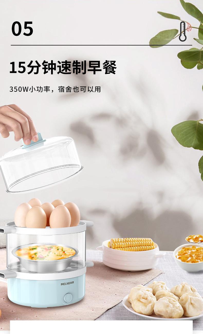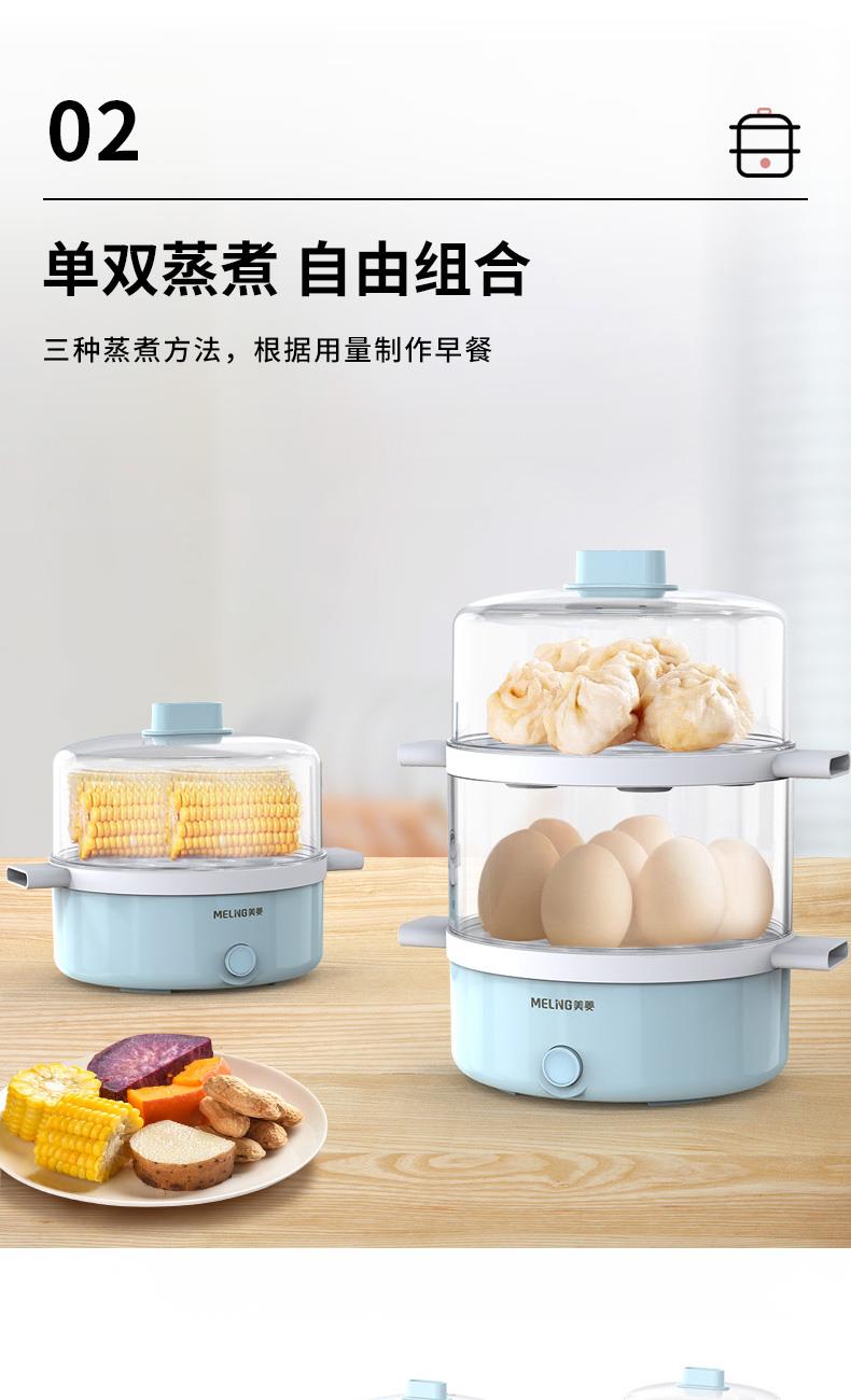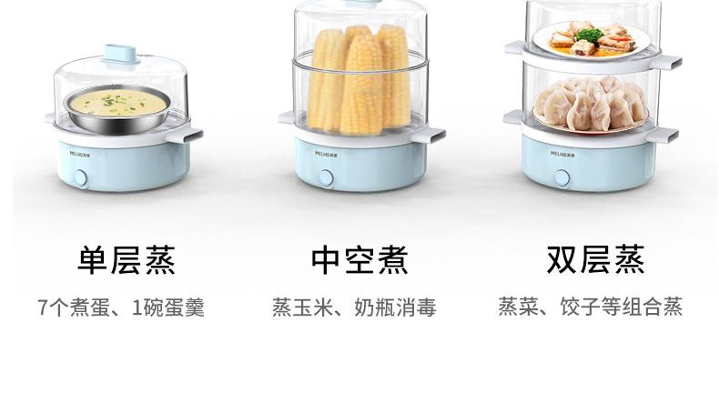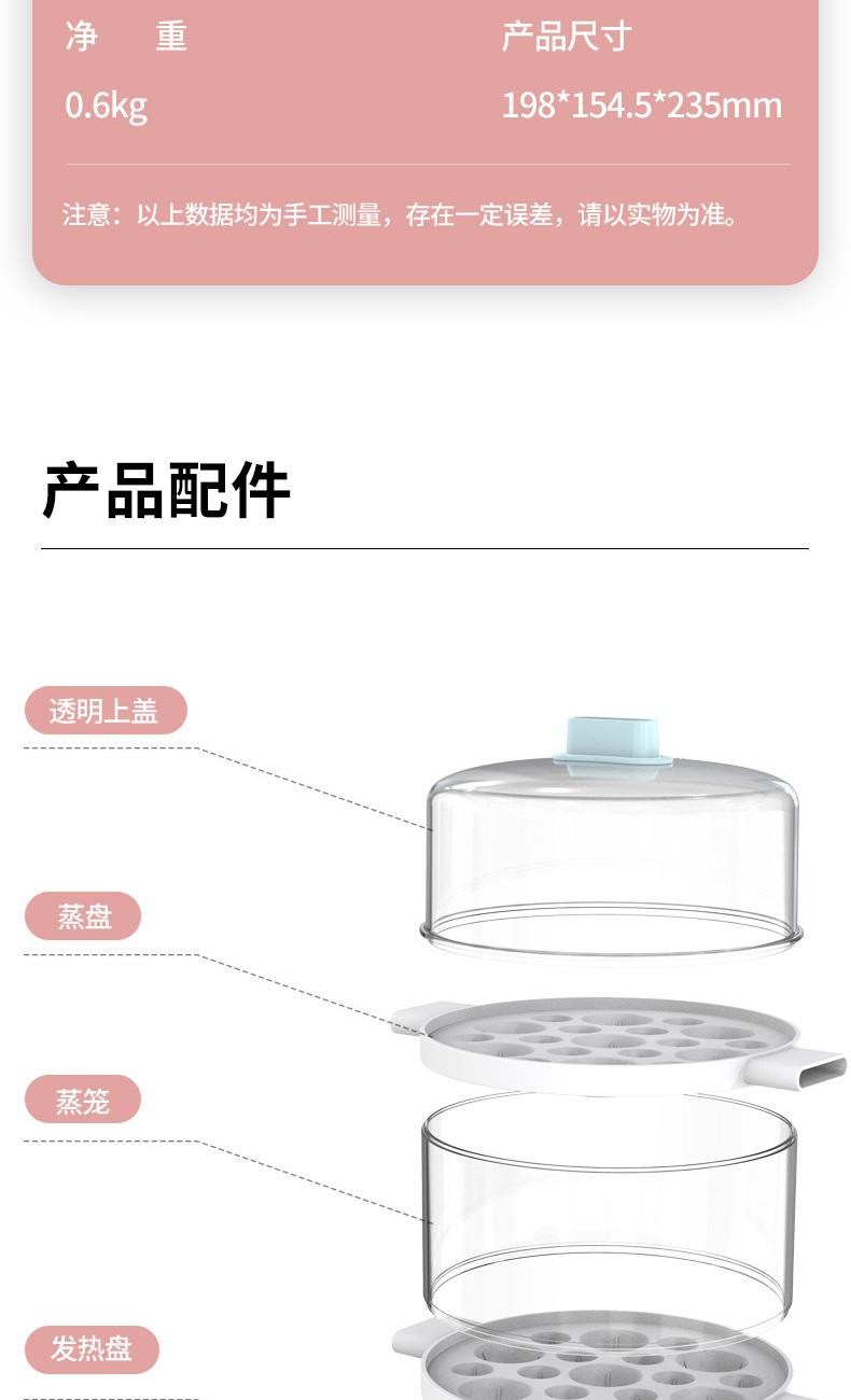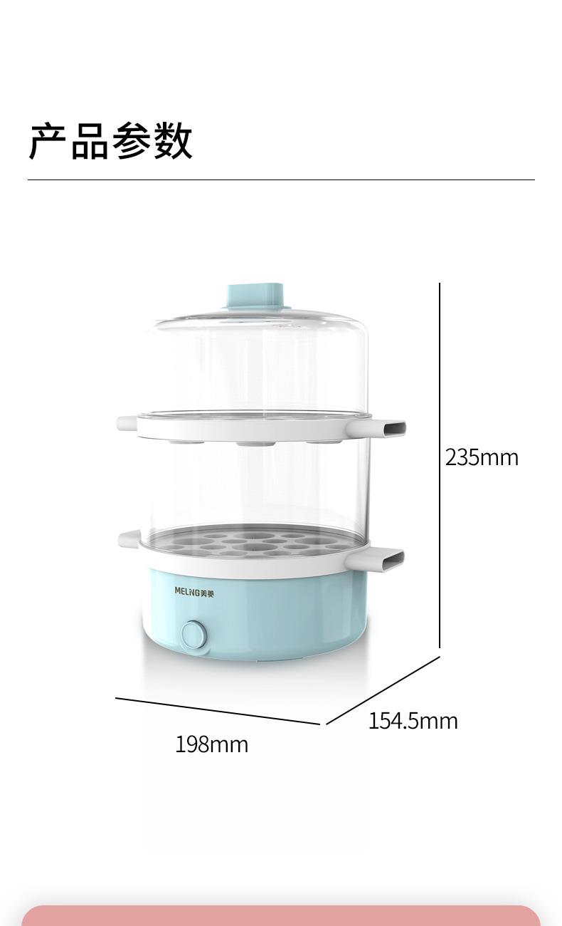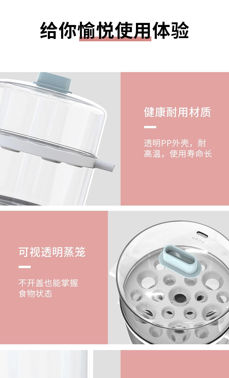 产品尺寸:198*154.5*235mm 包装尺寸::175*175*245mm 外箱尺寸:540*360*510mm 单台毛重:0.78kg 单台净重:0.6kg 包装材料:彩包 额定电源:220V~ 额定频率:50Hz 额定功率:350W 产品颜色:蓝色 产品条码:6907778940290 单双蒸煮,自由组合 | 304不锈钢发热盘,经久耐用 | PP外壳材质,高温不产生双酚A,更安全 | 一键式按钮,操作简单,更易上手。