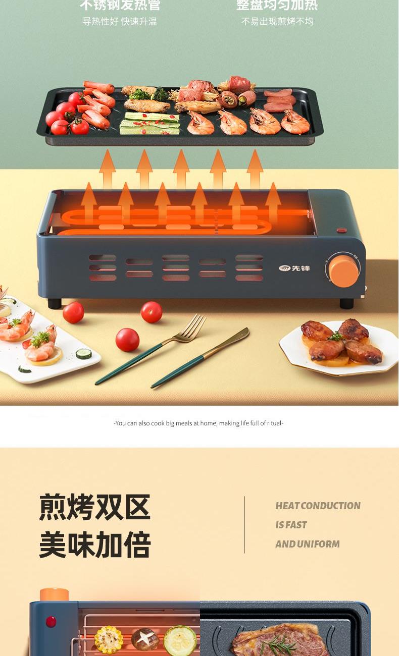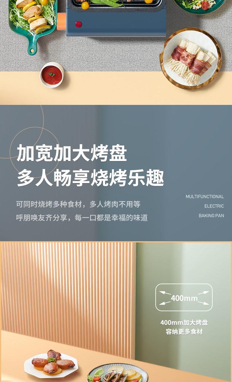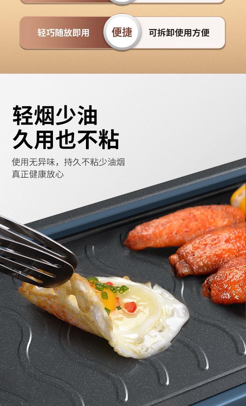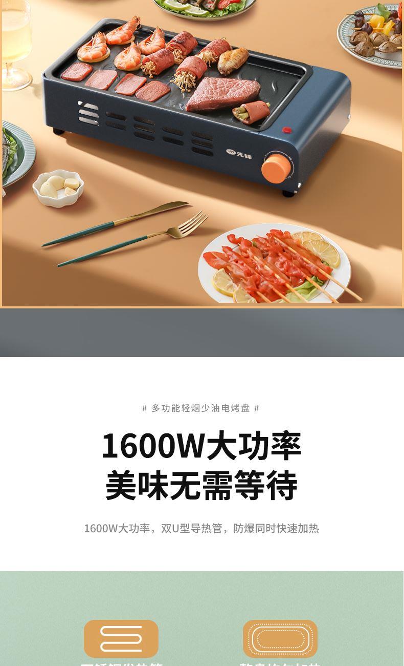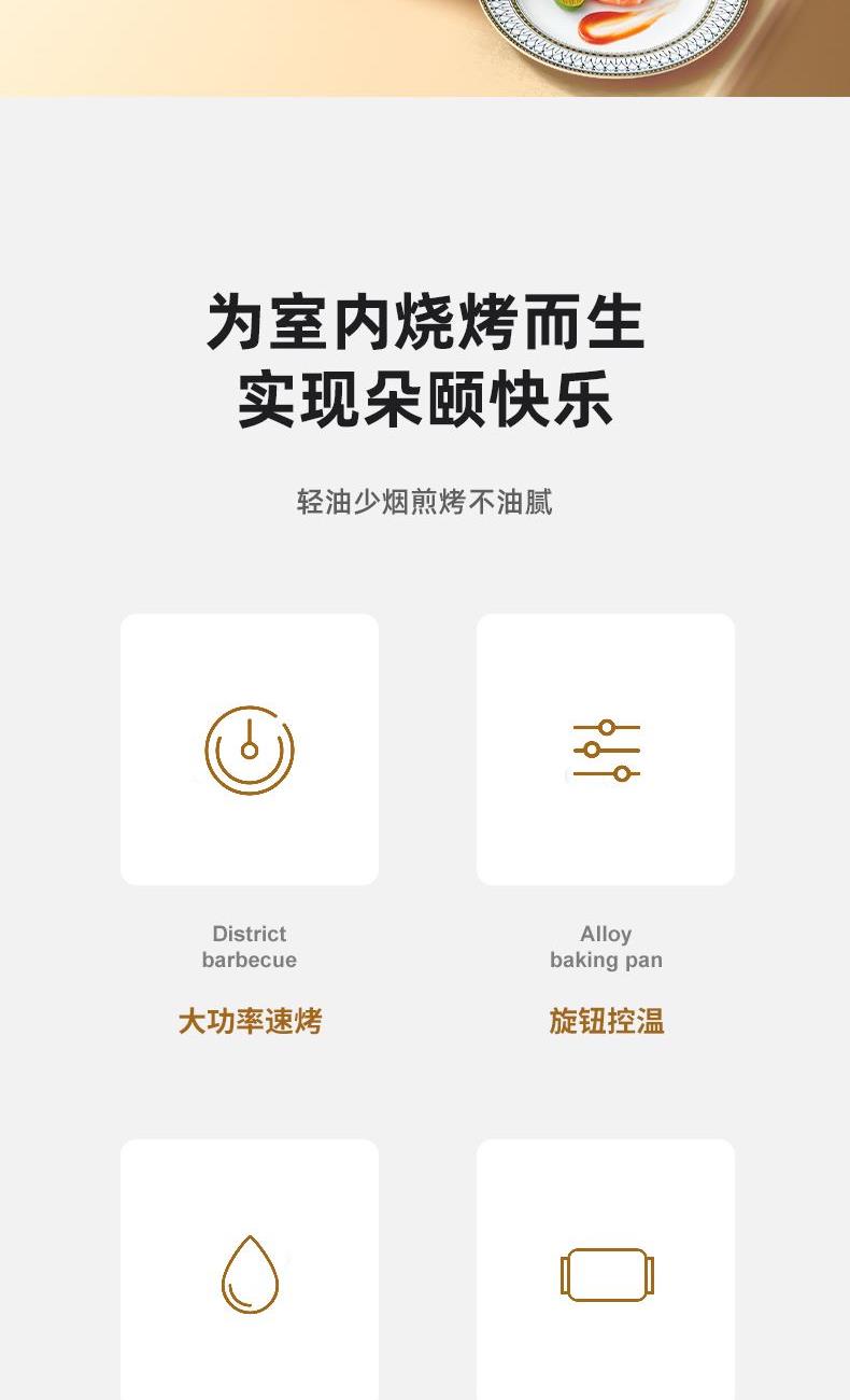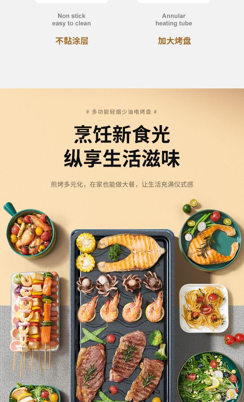 产品条码:6923046229652 彩包尺寸:487*130*255mm 黄包尺寸:490*135*265mm 外箱包装:585*500*550mm 包装材料: 彩包+黄包 额定电源:220V~ 额定频率:50Hz 额定功率:1600W 单台毛重:2.7kg 单台净重:2.5kg 煎烤两种模式自由转换 旋钮式调温,随心掌握火候 轻烟低油不粘不糊,轻松拆洗 1600W大功率,双U型导热管,防爆同时快速加热