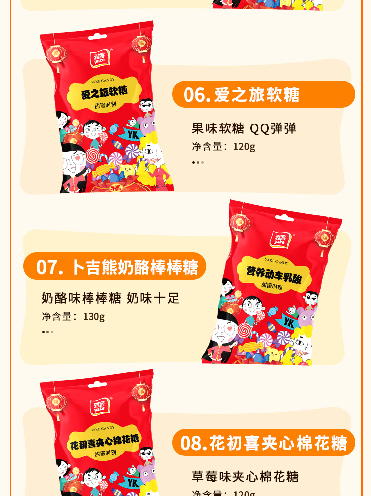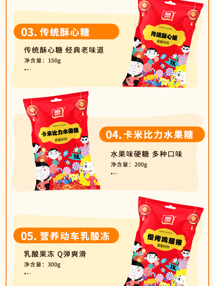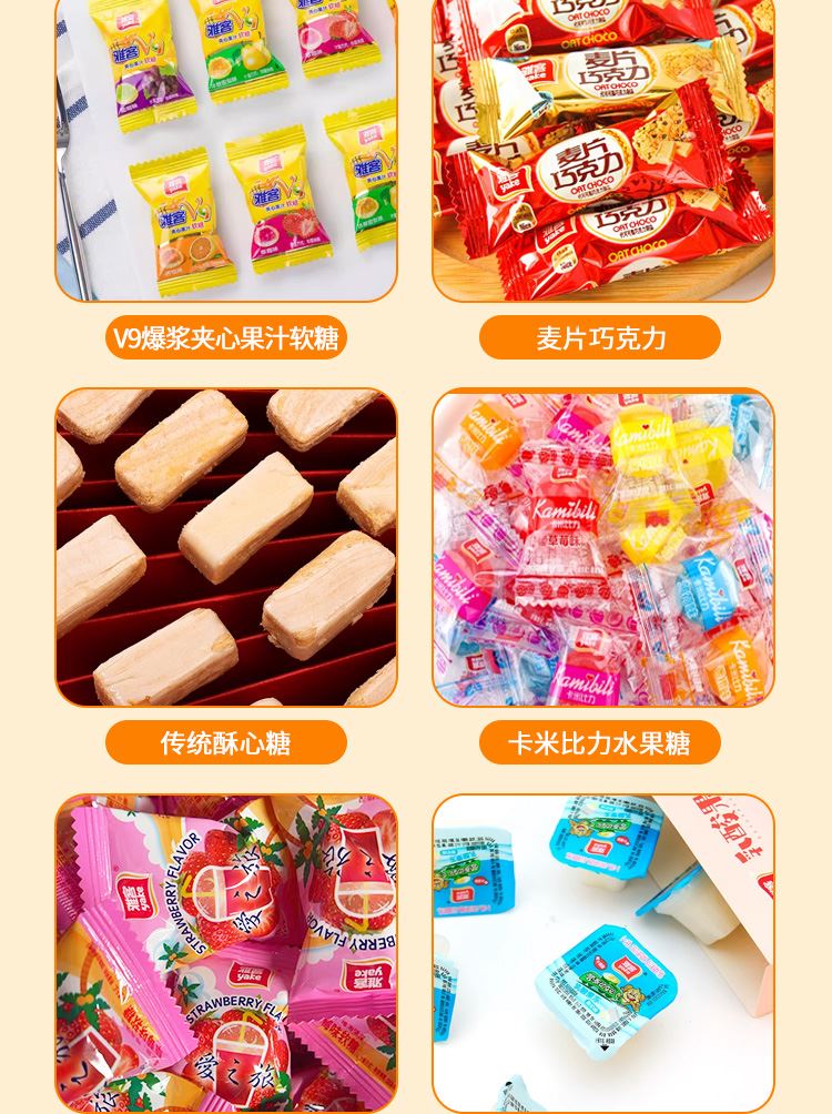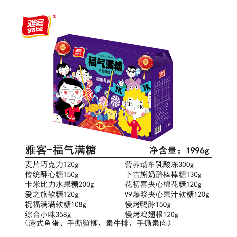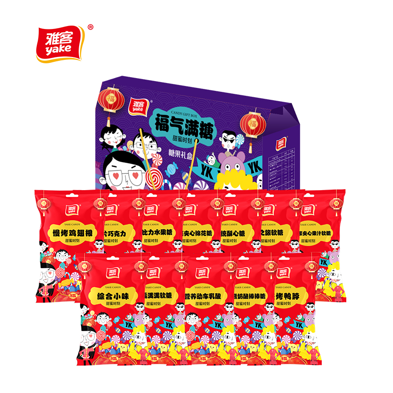 雅客麦片巧克力120g 雅客爆浆软糖120g 雅客大吉大利软糖120g 雅客财神到益生菌糖150g 雅客爱之旅软糖120g 雅客祝福满满软糖108g 雅客传统酥心糖150g 雅客卡米比力水果糖200g 雅客营养动车乳酸冻300g 雅客卜吉熊奶酪棒棒糖130g 雅客花初喜夹心棉花糖120g 雅客V9爆浆夹心果汁软糖120g