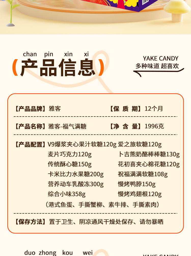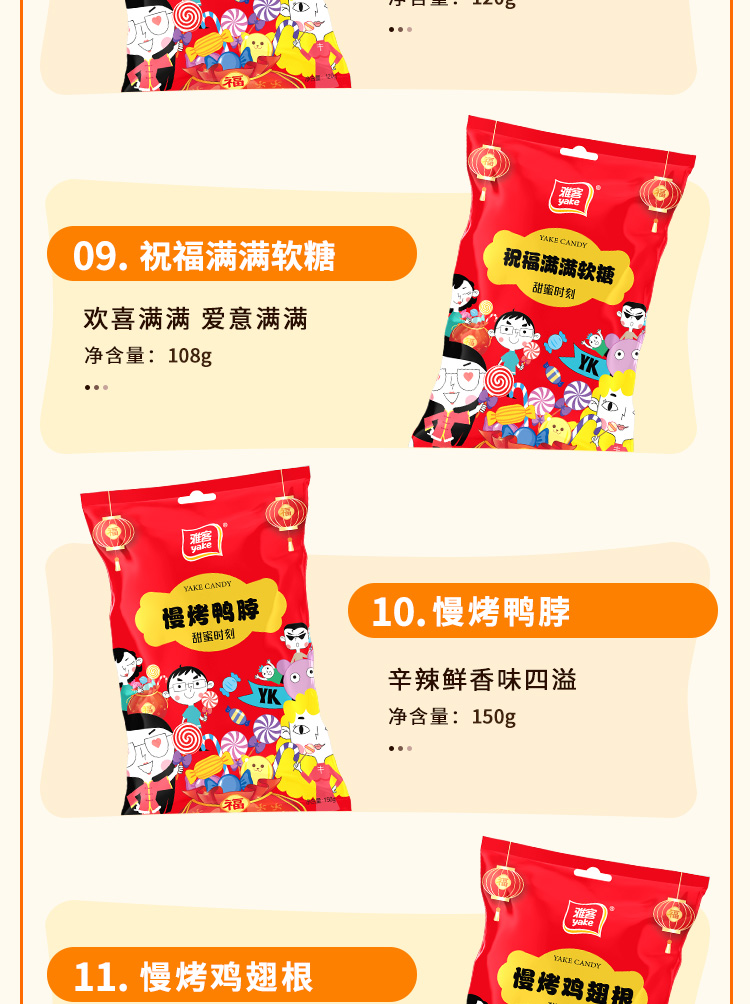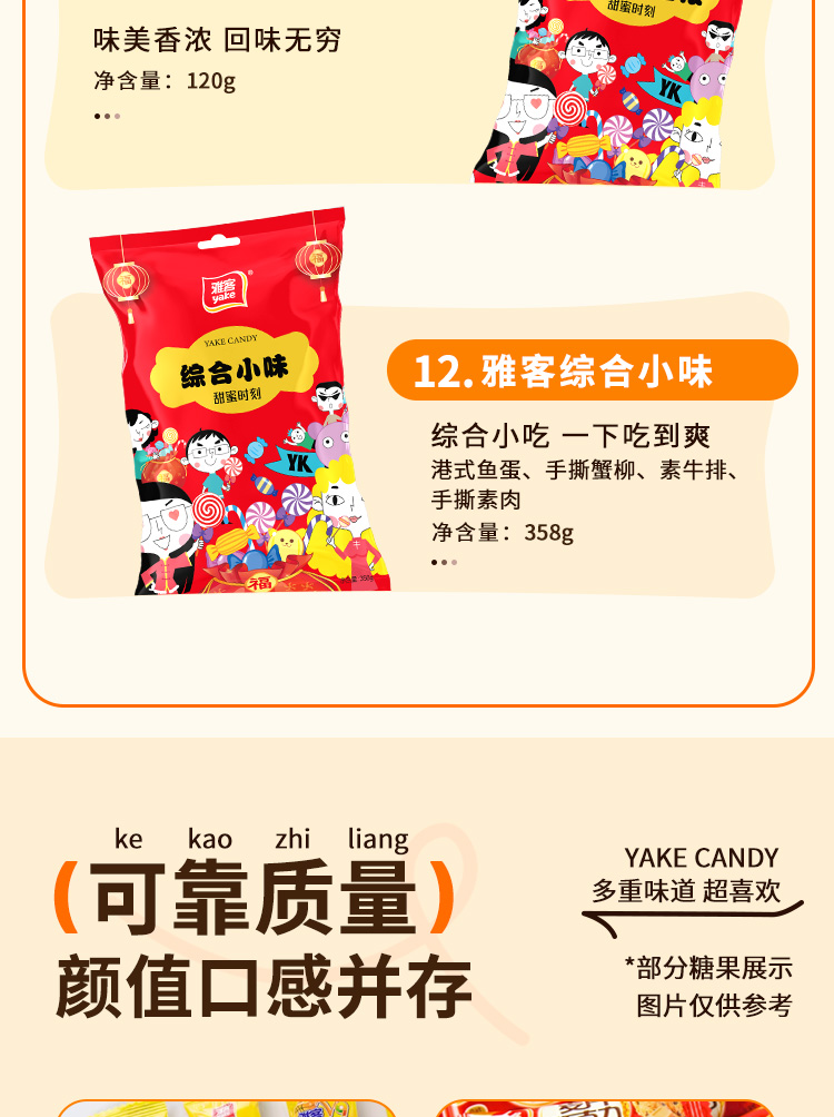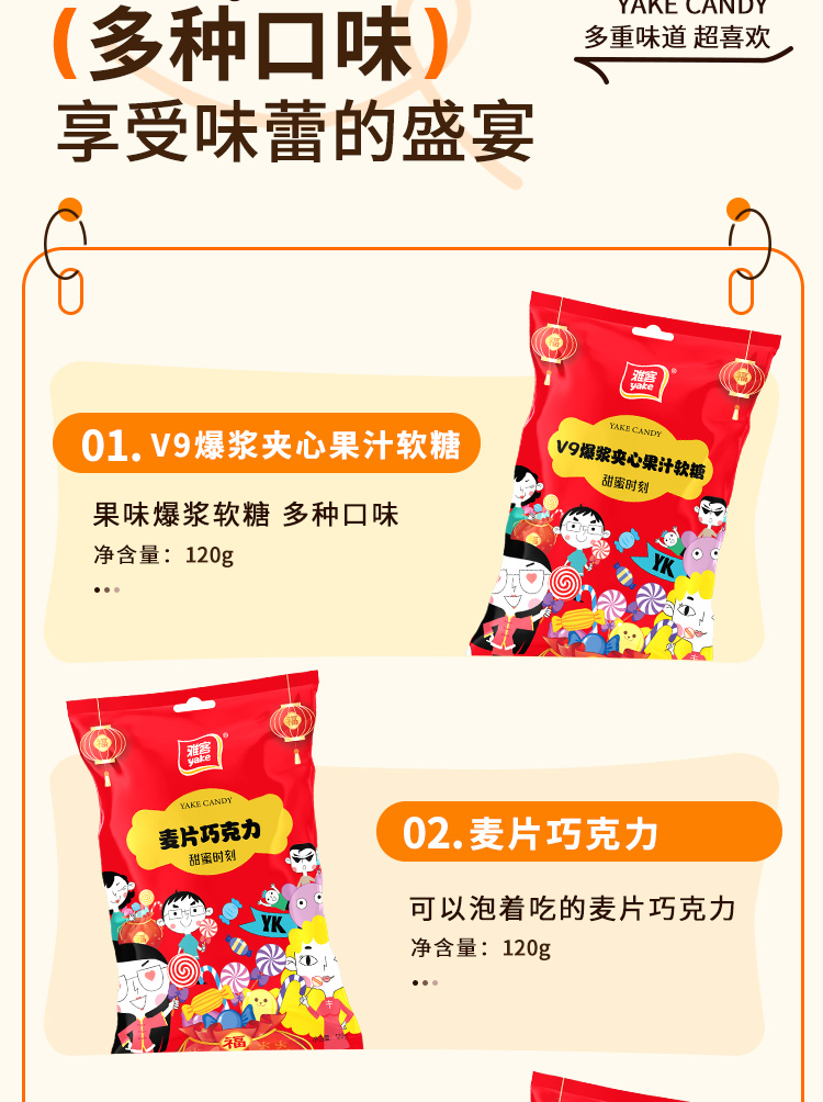 雅客麦片巧克力120g 雅客爆浆软糖120g 雅客大吉大利软糖120g 雅客财神到益生菌糖150g 雅客爱之旅软糖120g 雅客祝福满满软糖108g 雅客传统酥心糖150g 雅客卡米比力水果糖200g 雅客营养动车乳酸冻300g 雅客卜吉熊奶酪棒棒糖130g 雅客花初喜夹心棉花糖120g 雅客V9爆浆夹心果汁软糖120g