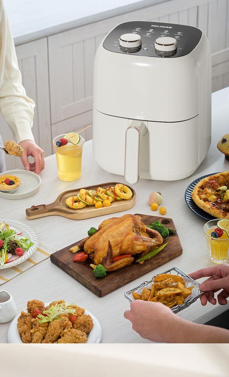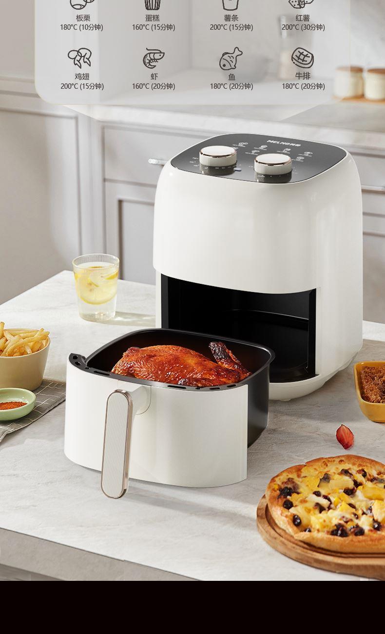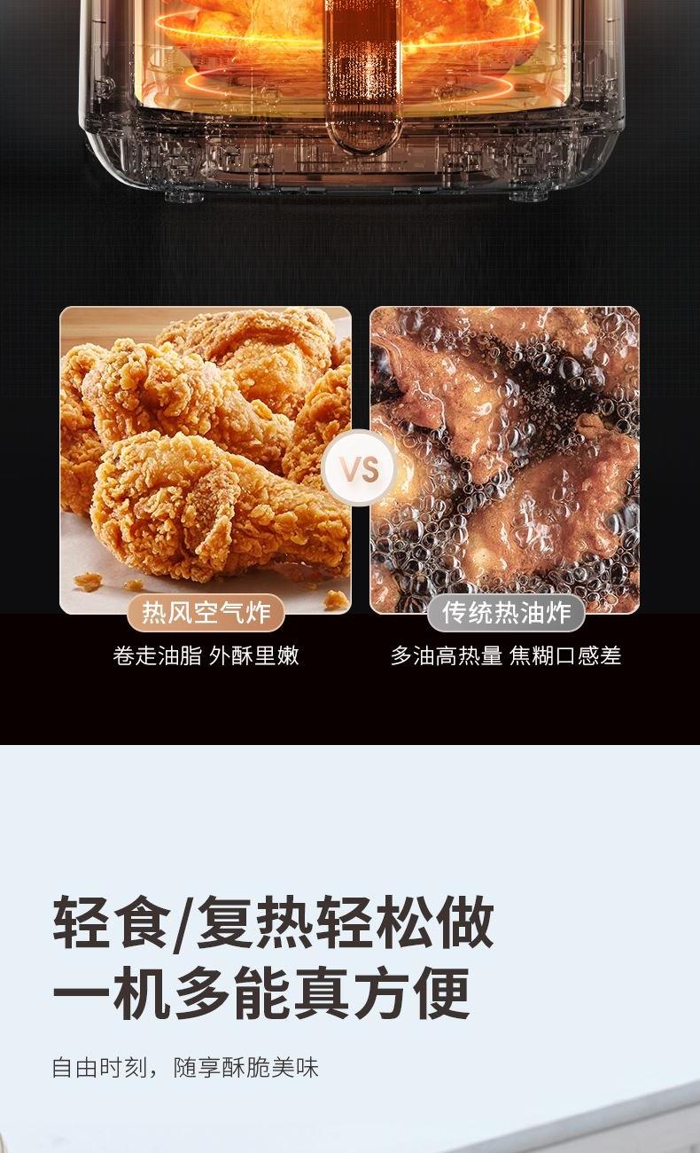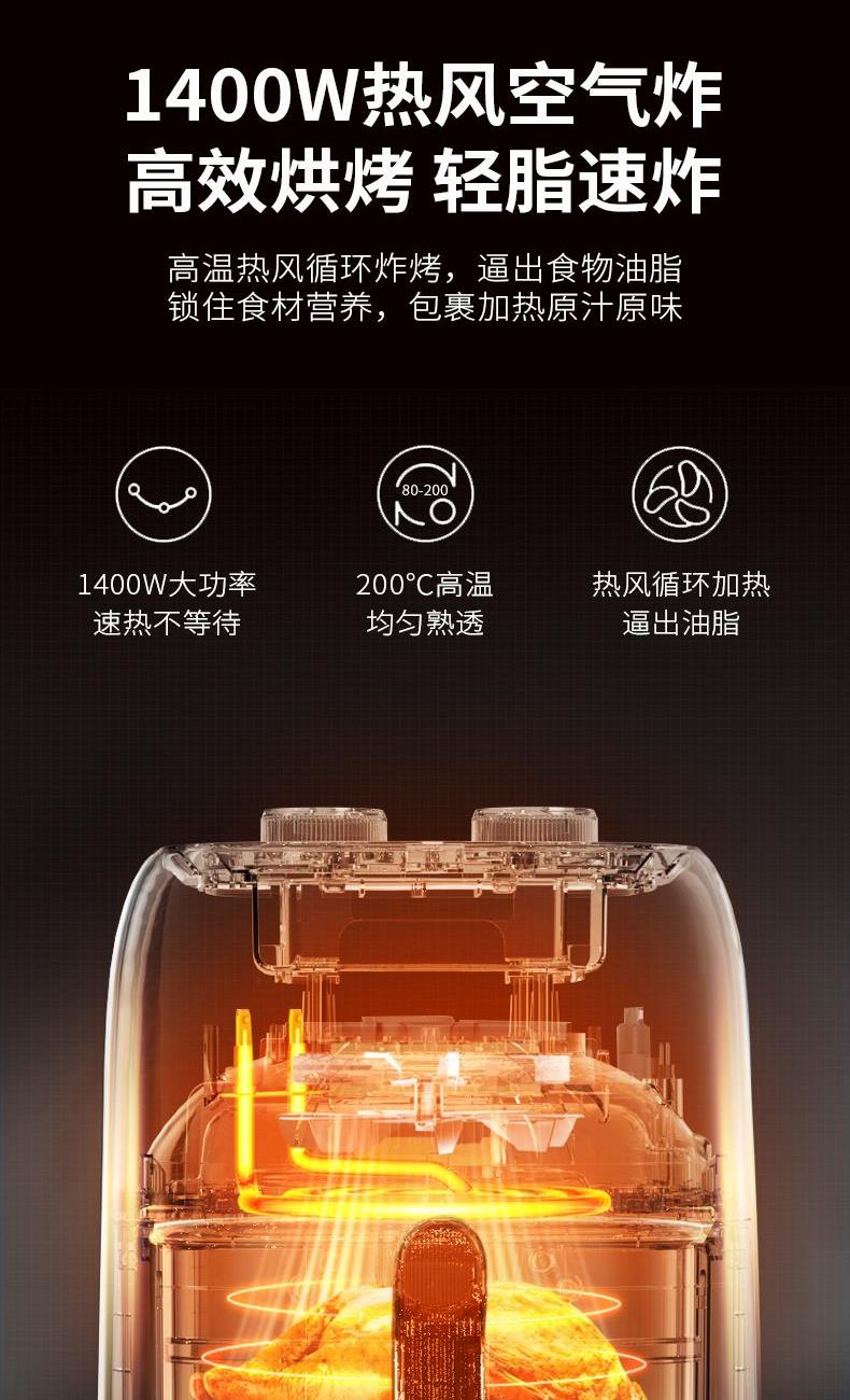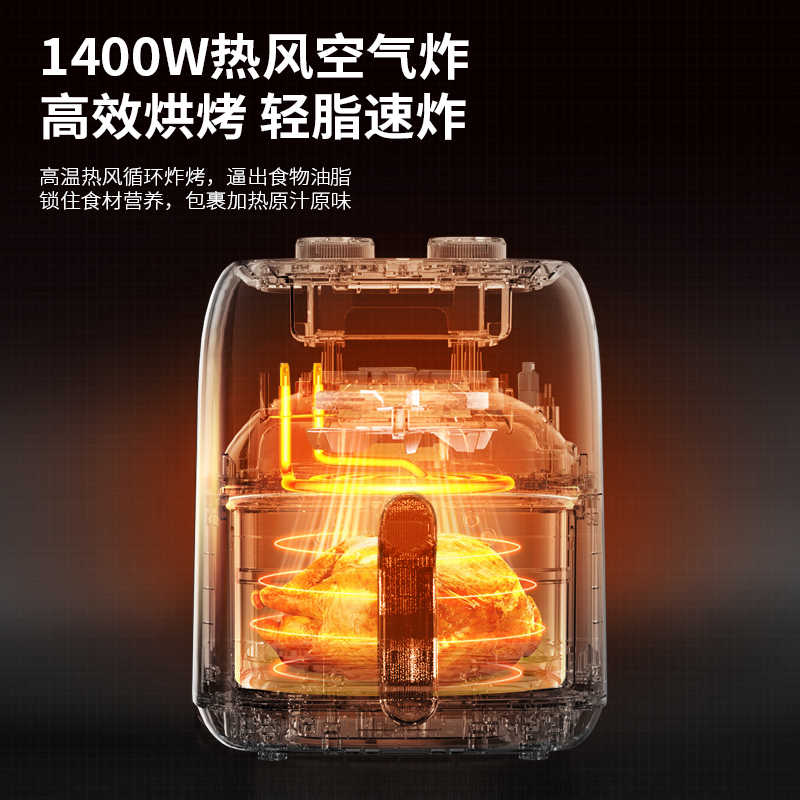 4.5L大容量,大小刚刚好 | 1400W大功率,热风立体循环 | 健康烹饪,可在不滴油的情况下进行烧烤,烘烤,煎烤,减少油脂摄入 | 360°热循环技术去除油脂,口感好,脂肪少 | 酥制,使食物外表酥脆,里面滑嫩。