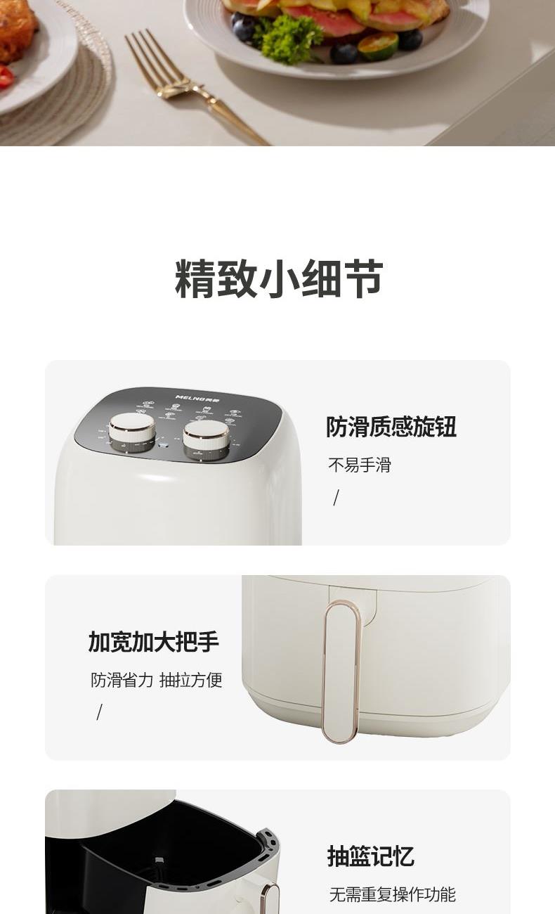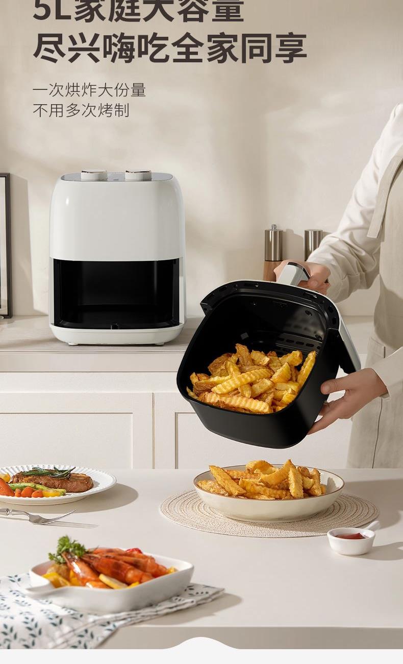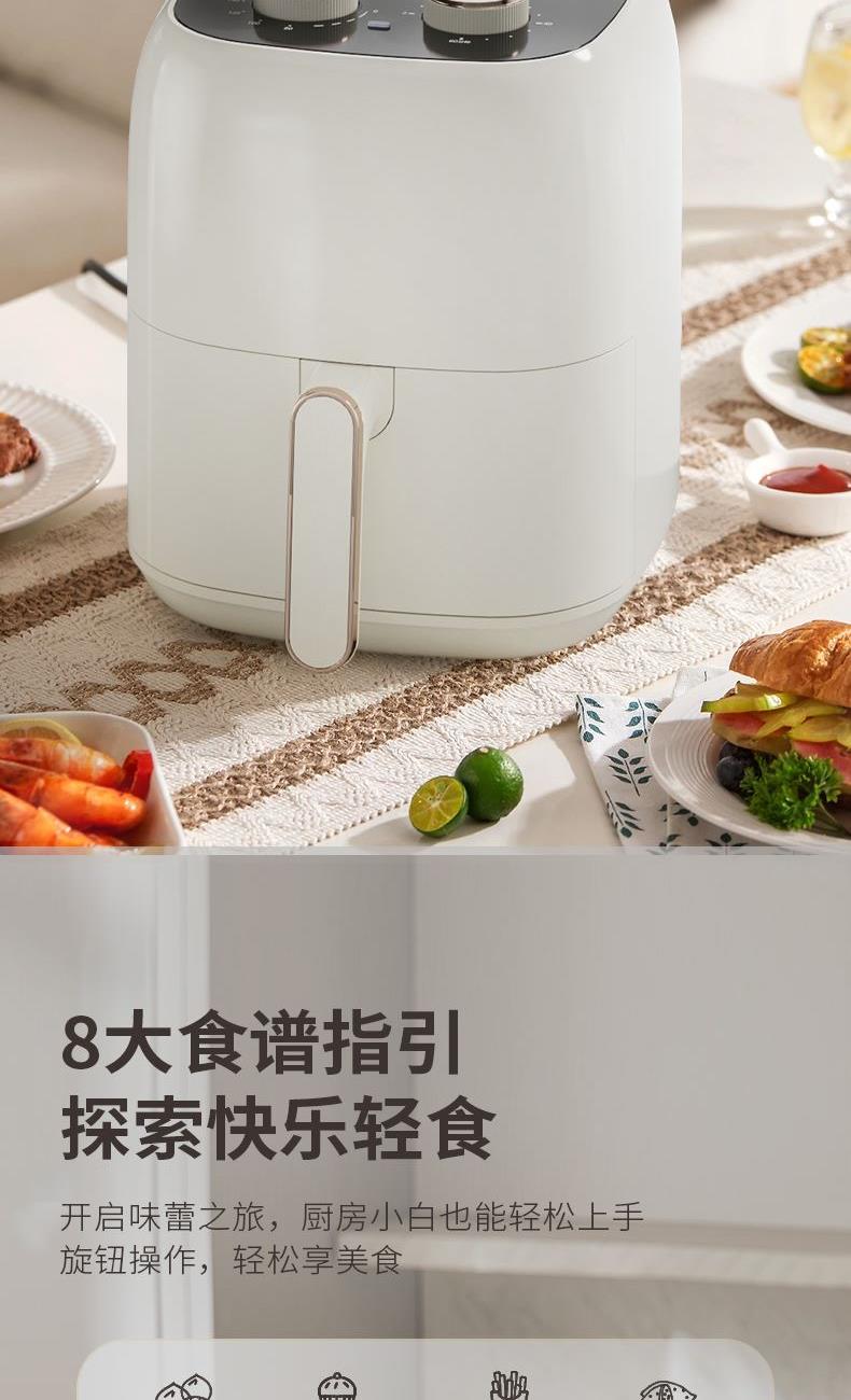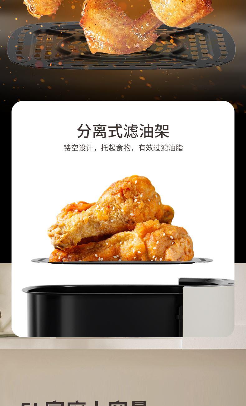 4.5L大容量,大小刚刚好 | 1400W大功率,热风立体循环 | 健康烹饪,可在不滴油的情况下进行烧烤,烘烤,煎烤,减少油脂摄入 | 360°热循环技术去除油脂,口感好,脂肪少 | 酥制,使食物外表酥脆,里面滑嫩。