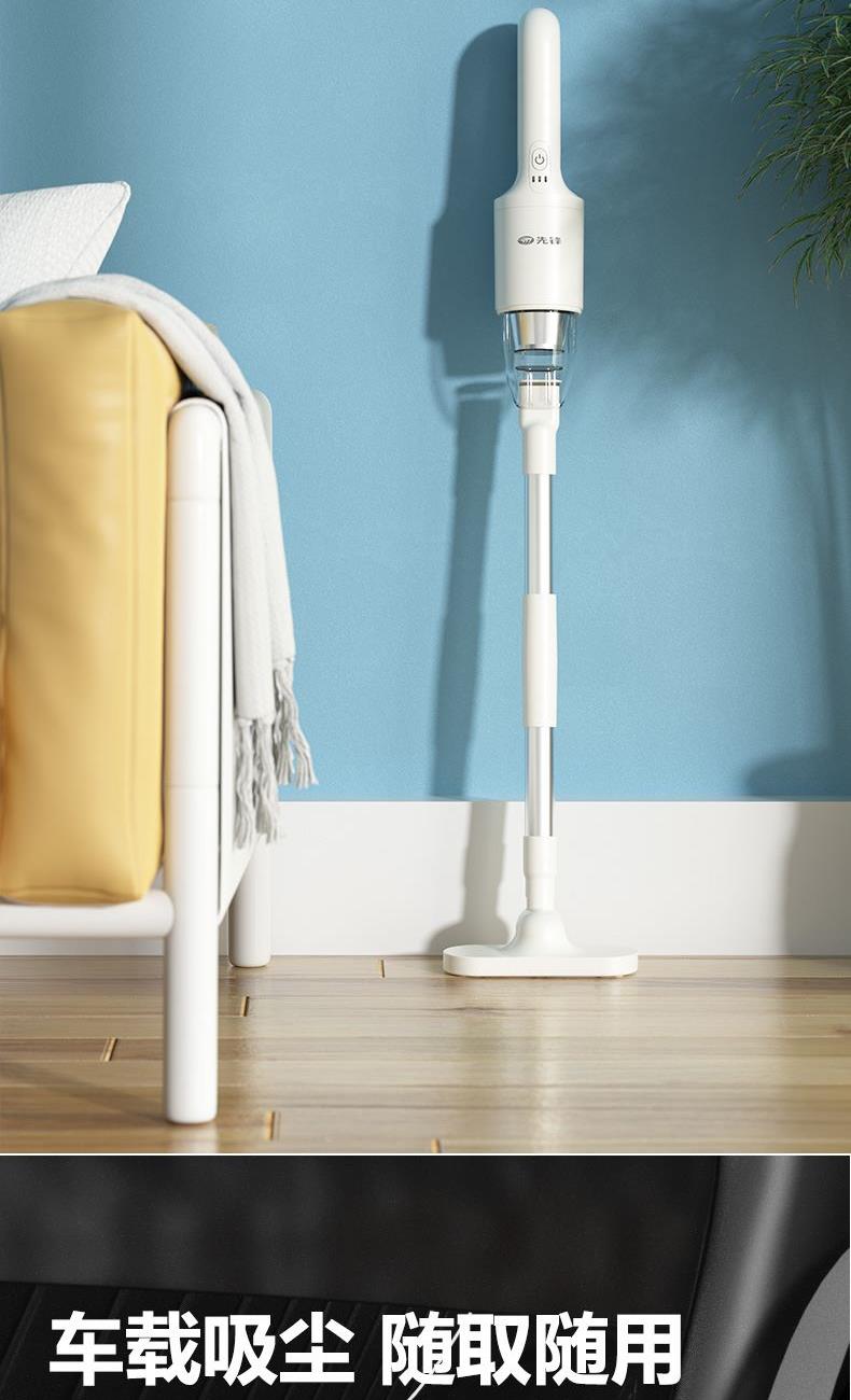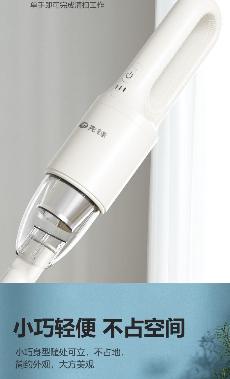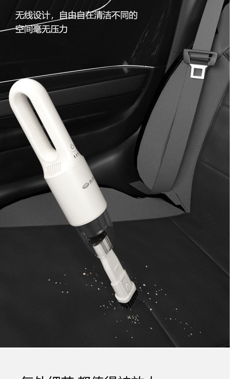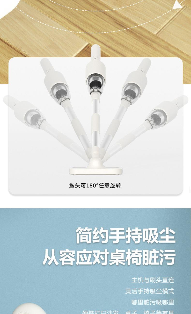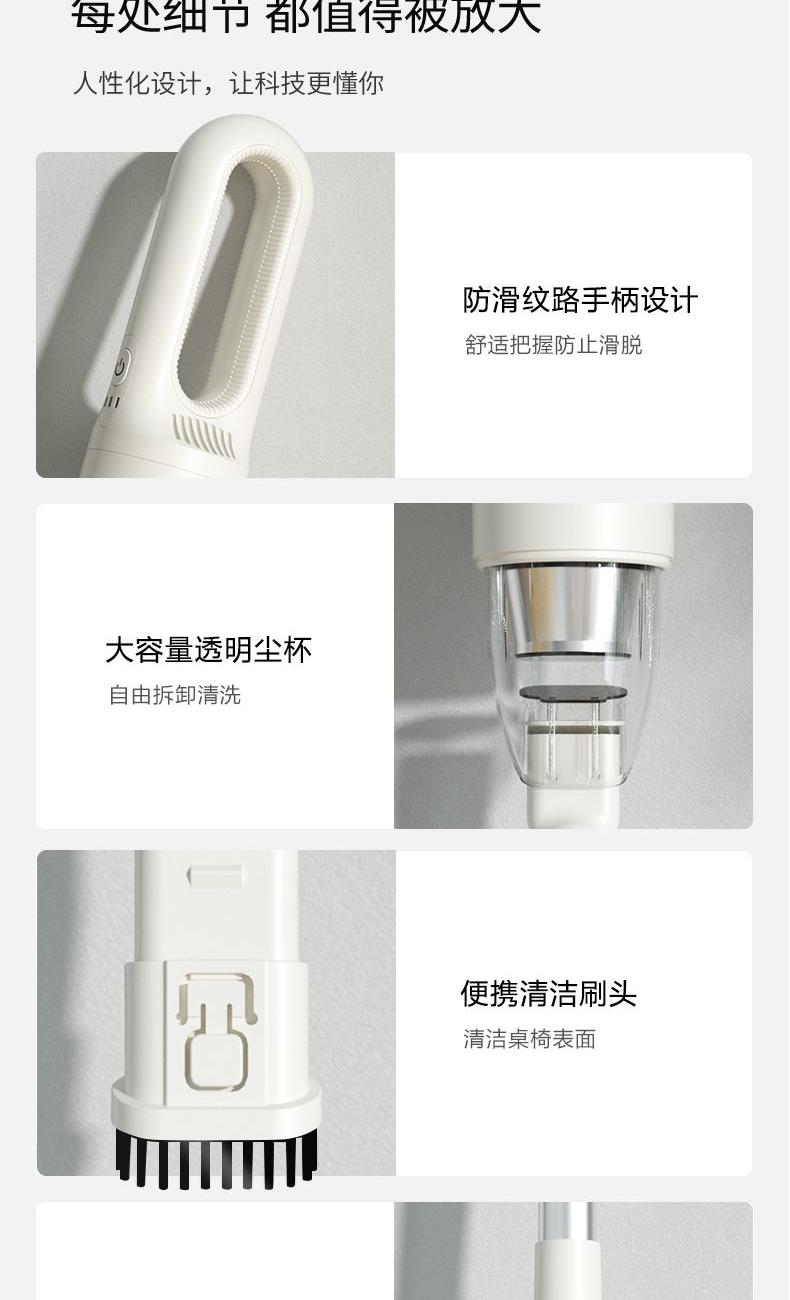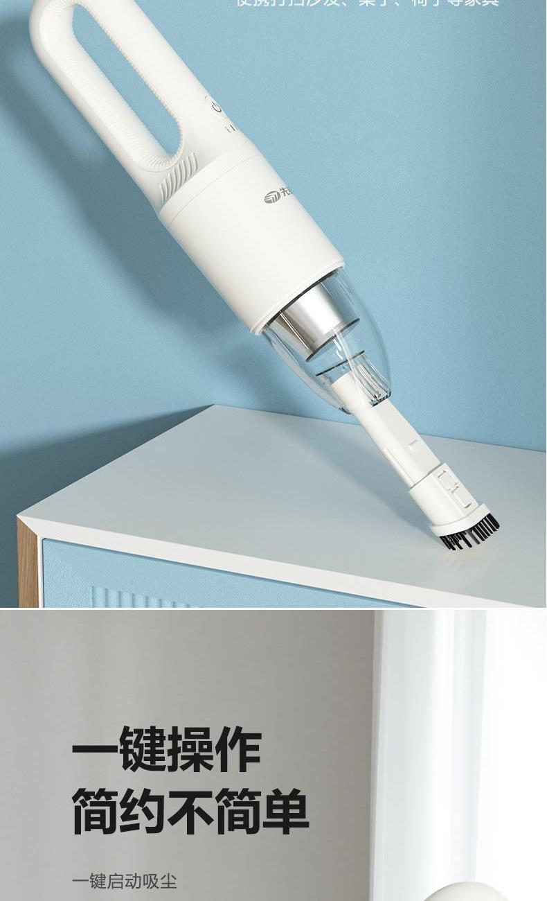 产品条码:6923046229591 彩包尺寸:390*160*124mm 黄包尺寸:395*130*165mm 外箱包装:575*410*530mm 包装材料:彩包+黄包 额定电源:220V~ 工作电压:7.4V~ 额定功率:45W 单台毛重:1.3kg 单台净重:1.01kg 180度转向拖头,清洁无死角 一机多用, 车载吸尘,随取随用,长时续航 一键操作,简约不简单,小巧轻便,不占空间