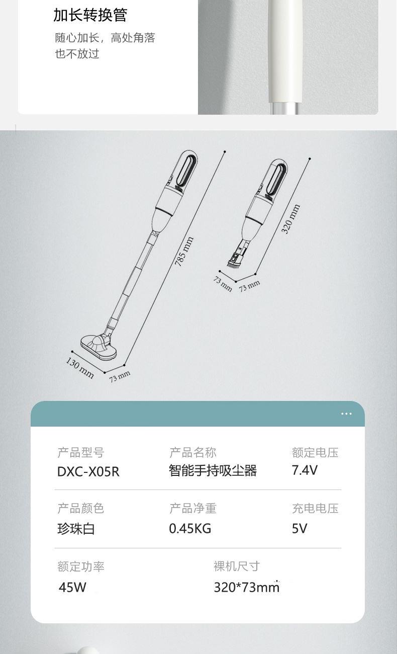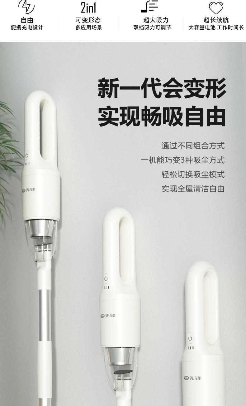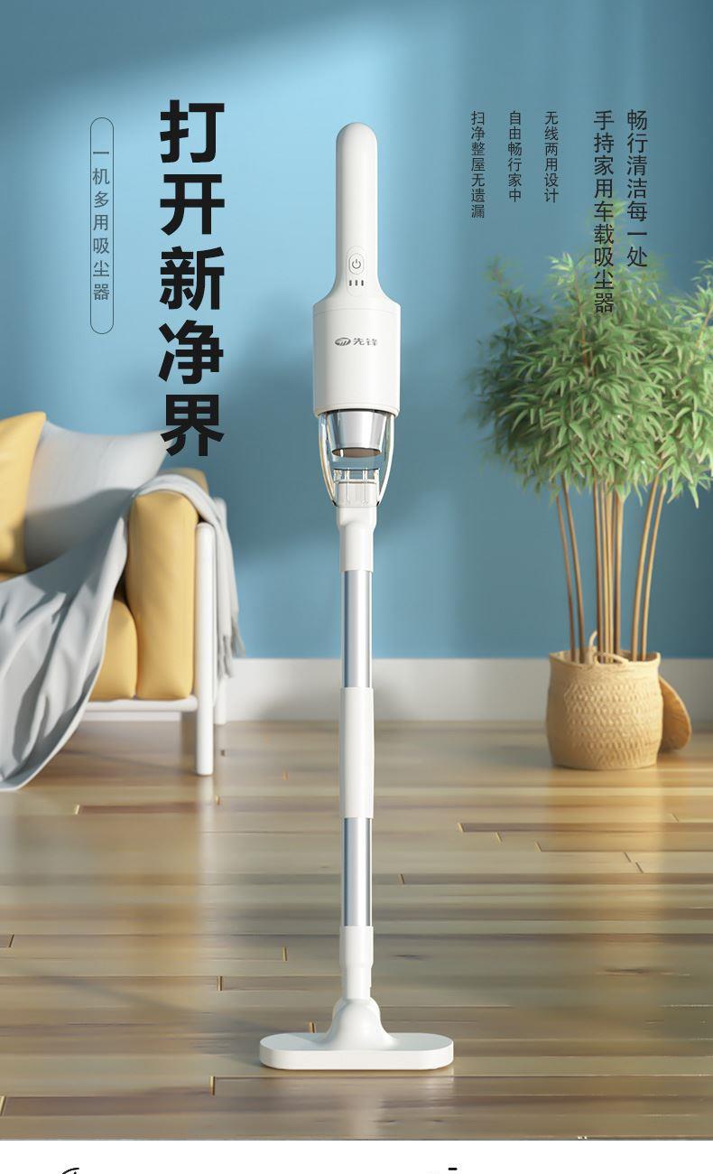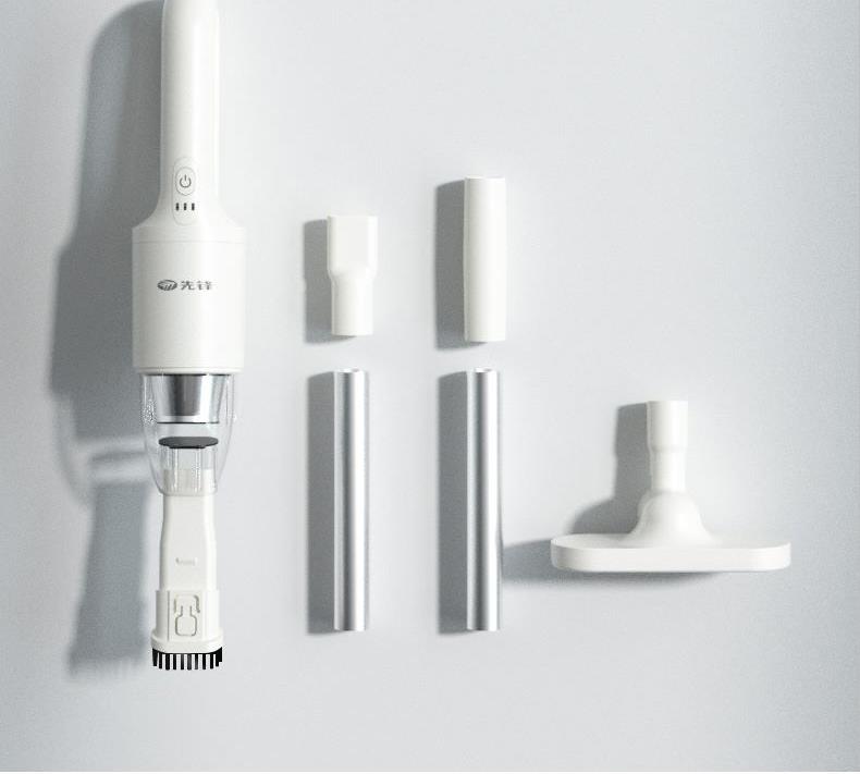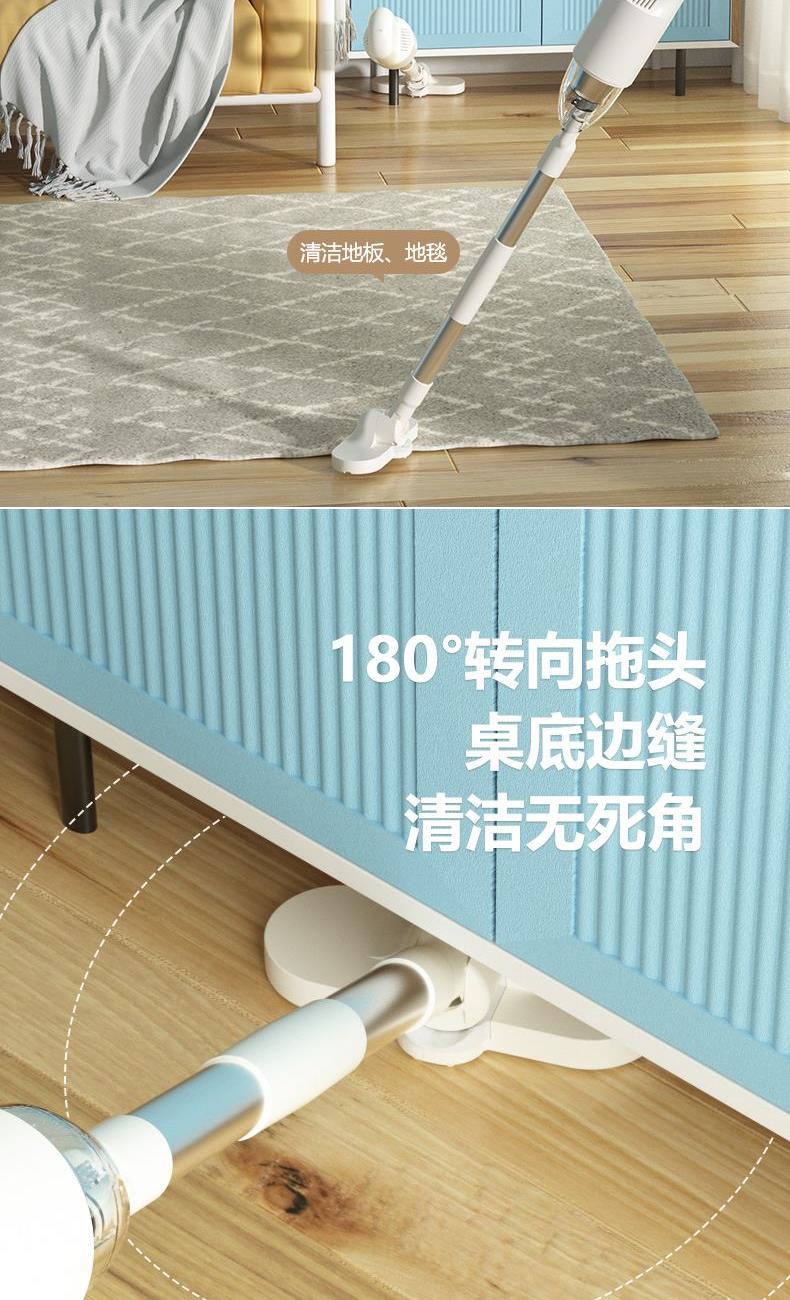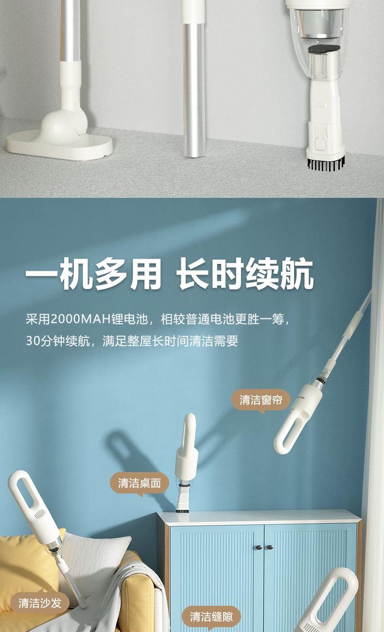 产品条码:6923046229591 彩包尺寸:390*160*124mm 黄包尺寸:395*130*165mm 外箱包装:575*410*530mm 包装材料:彩包+黄包 额定电源:220V~ 工作电压:7.4V~ 额定功率:45W 单台毛重:1.3kg 单台净重:1.01kg 180度转向拖头,清洁无死角 一机多用, 车载吸尘,随取随用,长时续航 一键操作,简约不简单,小巧轻便,不占空间