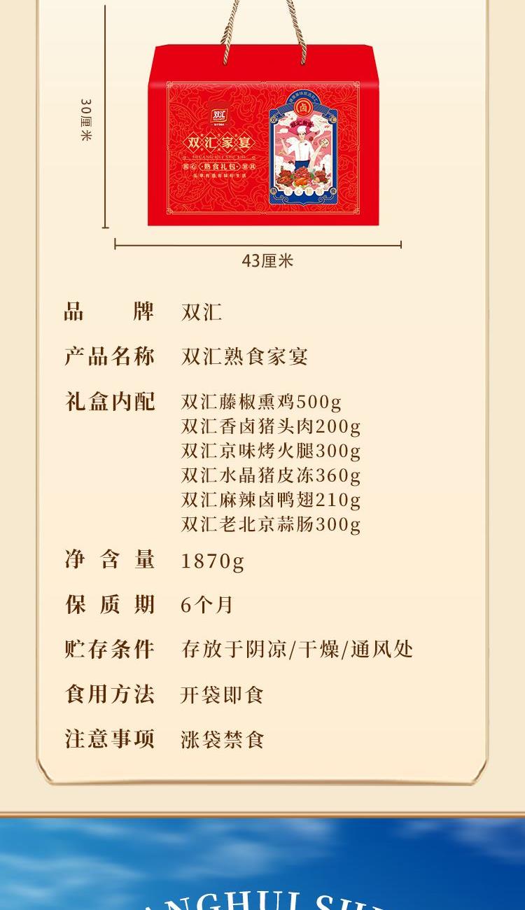 双汇藤椒熏鸡500g 双汇香辣烤肉排300g 双汇香辣烤鸭腿240g 双汇香卤猪头肉200g 双汇水晶猪皮冻360g 双汇京味烤火腿300g 双汇香嫩烤肉肠300g
