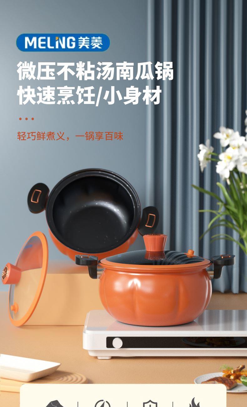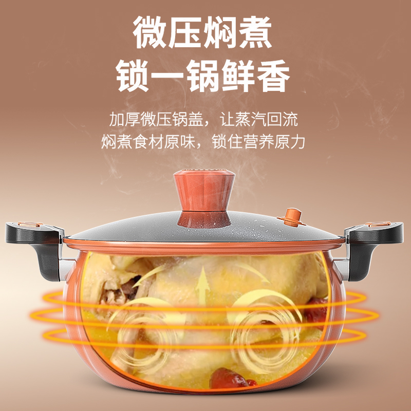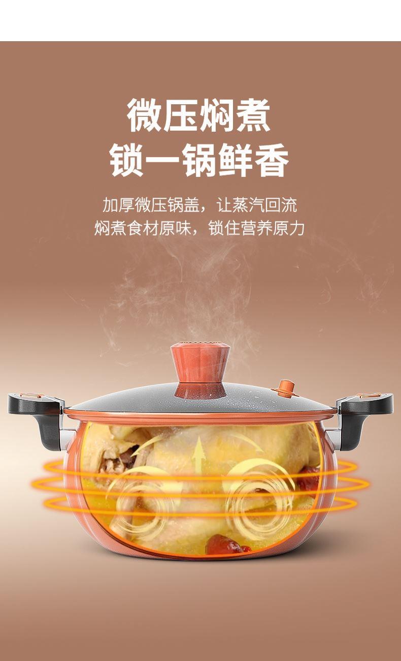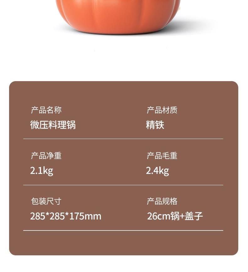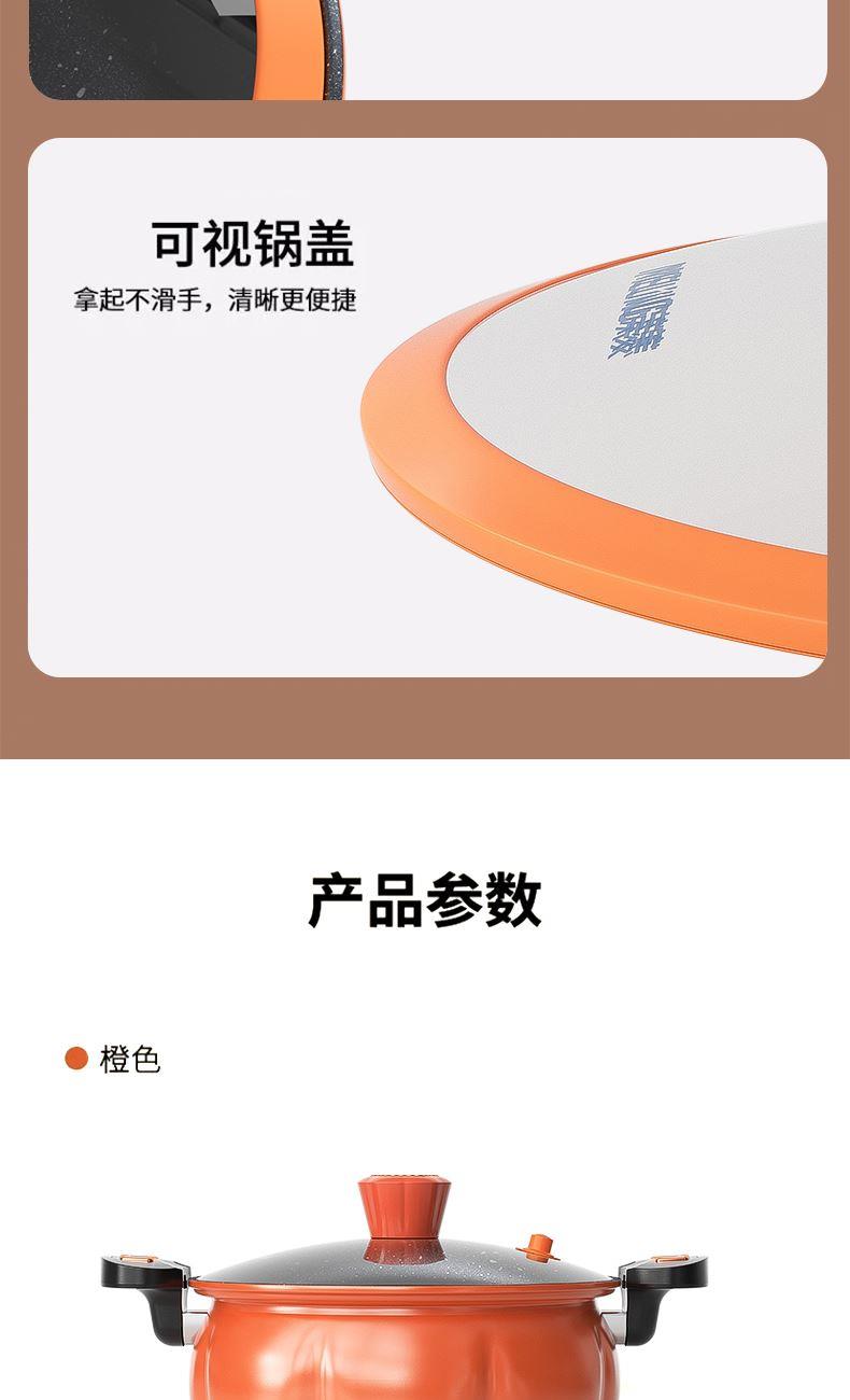 包装尺寸:285*285*175mm 单台毛重:2.4kg 单台净重:2.1kg 产品颜色:橙色 包装材料:电商包 产品条码:6936897528584 密封性强,微压聚能快炖 | 双耳防烫,防溢锅沿,稳定锅盖,气阀泄压保护设计 | 大容量,一锅多用