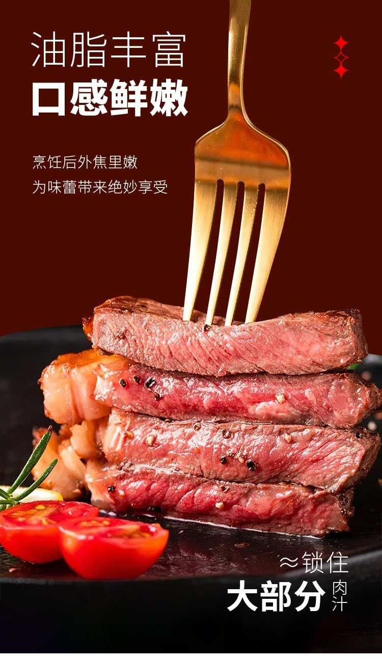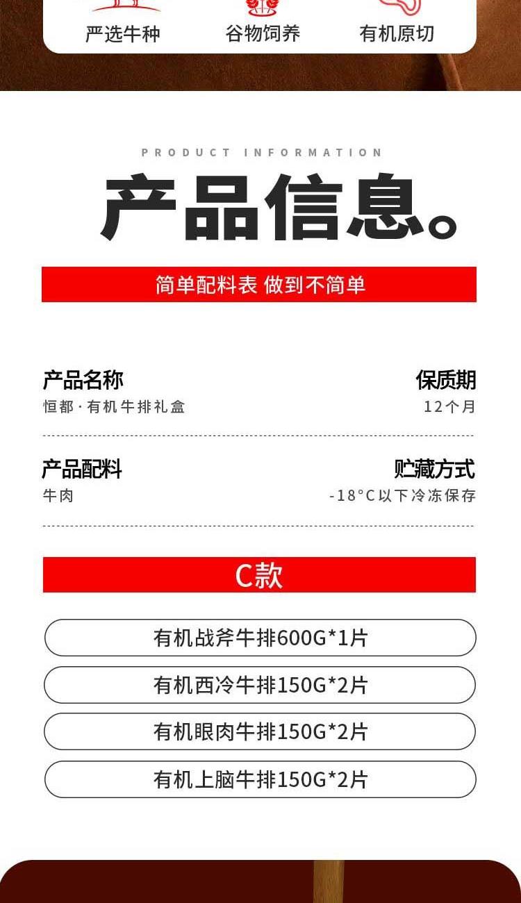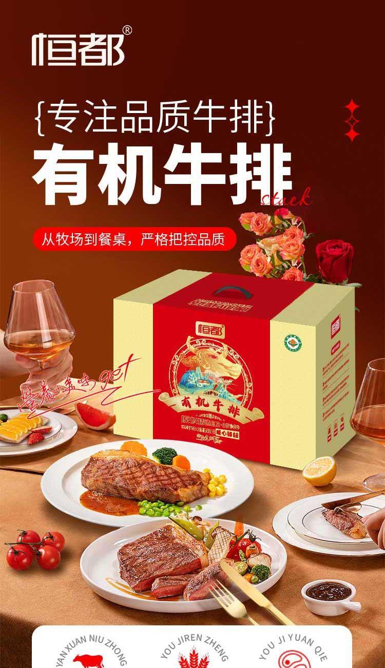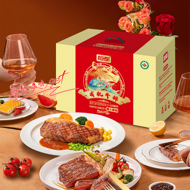 规格:1050g/盒 【内配】 恒都有机战斧牛排600g*1 恒都有机西冷牛排150g*2 恒都有机眼肉牛排150g*2 恒都有机上脑牛排150g*2