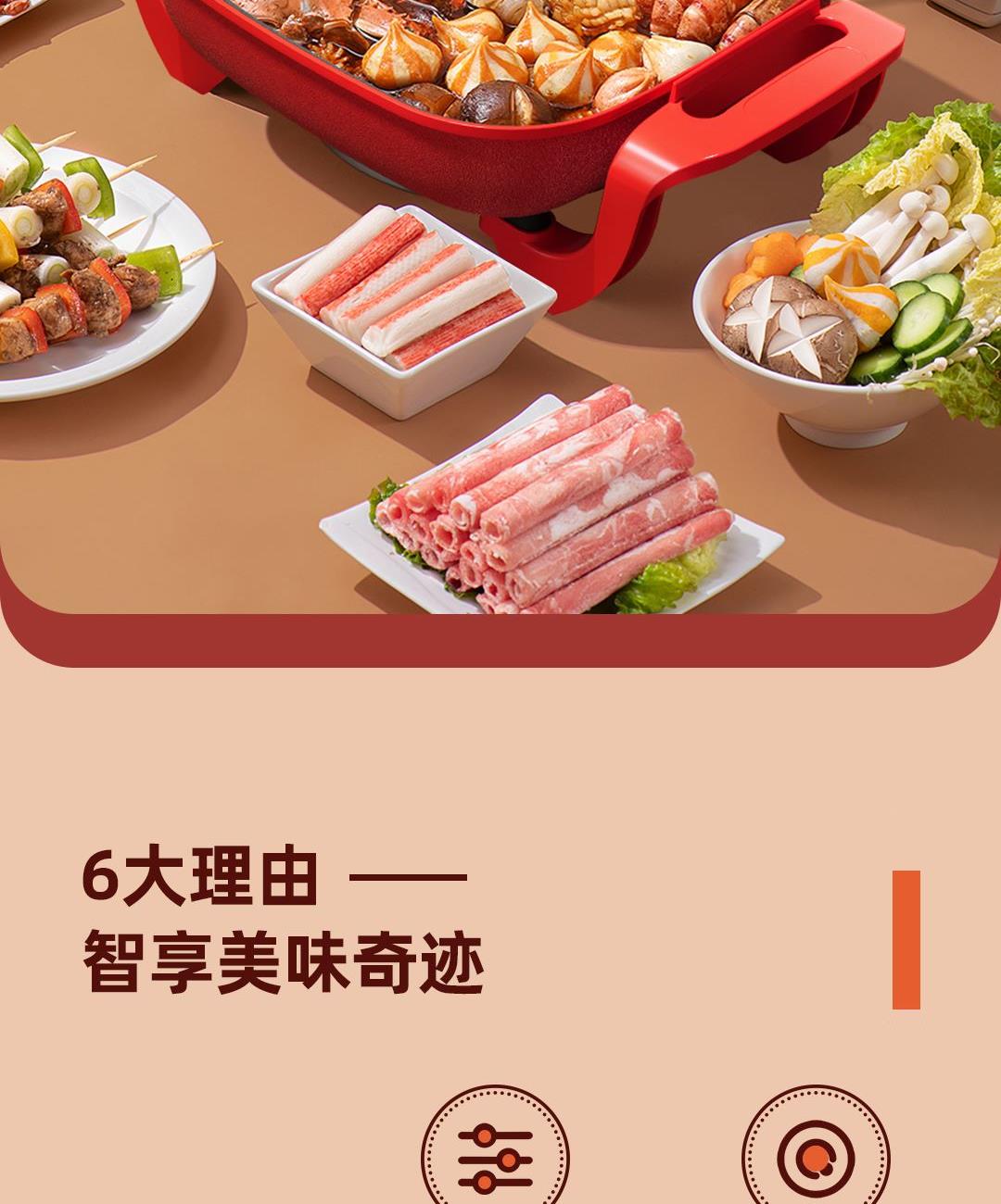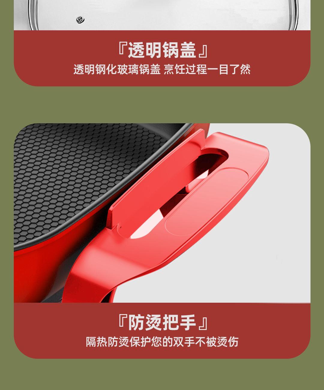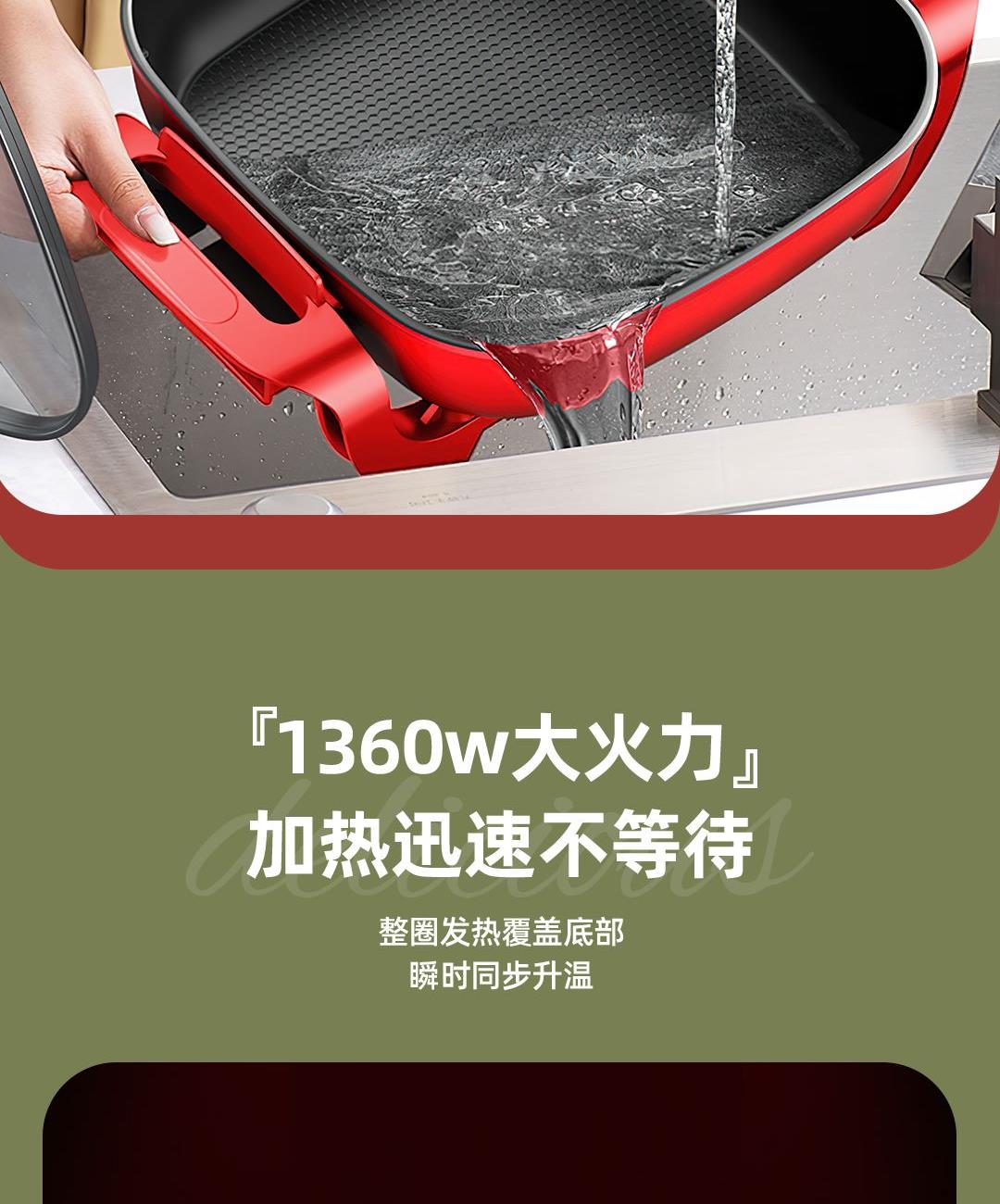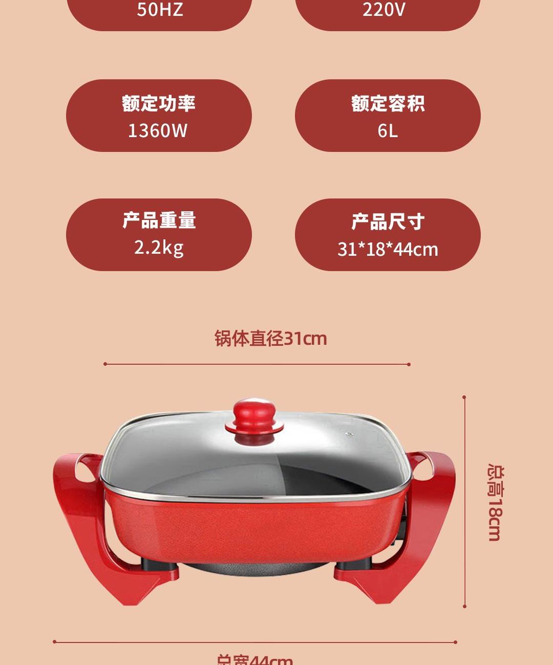 产品尺寸:440*310*180mm 彩箱包装尺寸:445*155*330mm 彩箱外箱尺寸:800*460*355mm 单台毛重:2.5kg 单台净重:2.2kg 颜色:红色 包装材料:彩包 额定电压:220V~ 额定频率:50Hz 额定功率:1360W 容 量:6L 产品材质:铝合金材质 产品颜色:红色 产品条码:6936897541859 加厚锅体不粘锅涂层 | 一体锅 | 分离插座