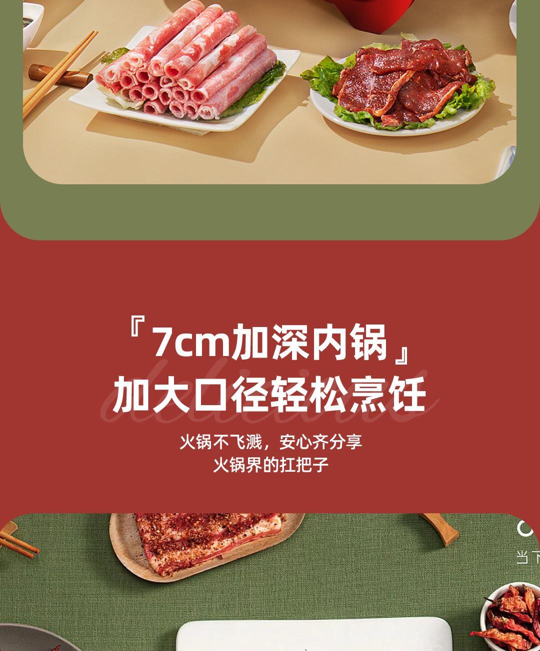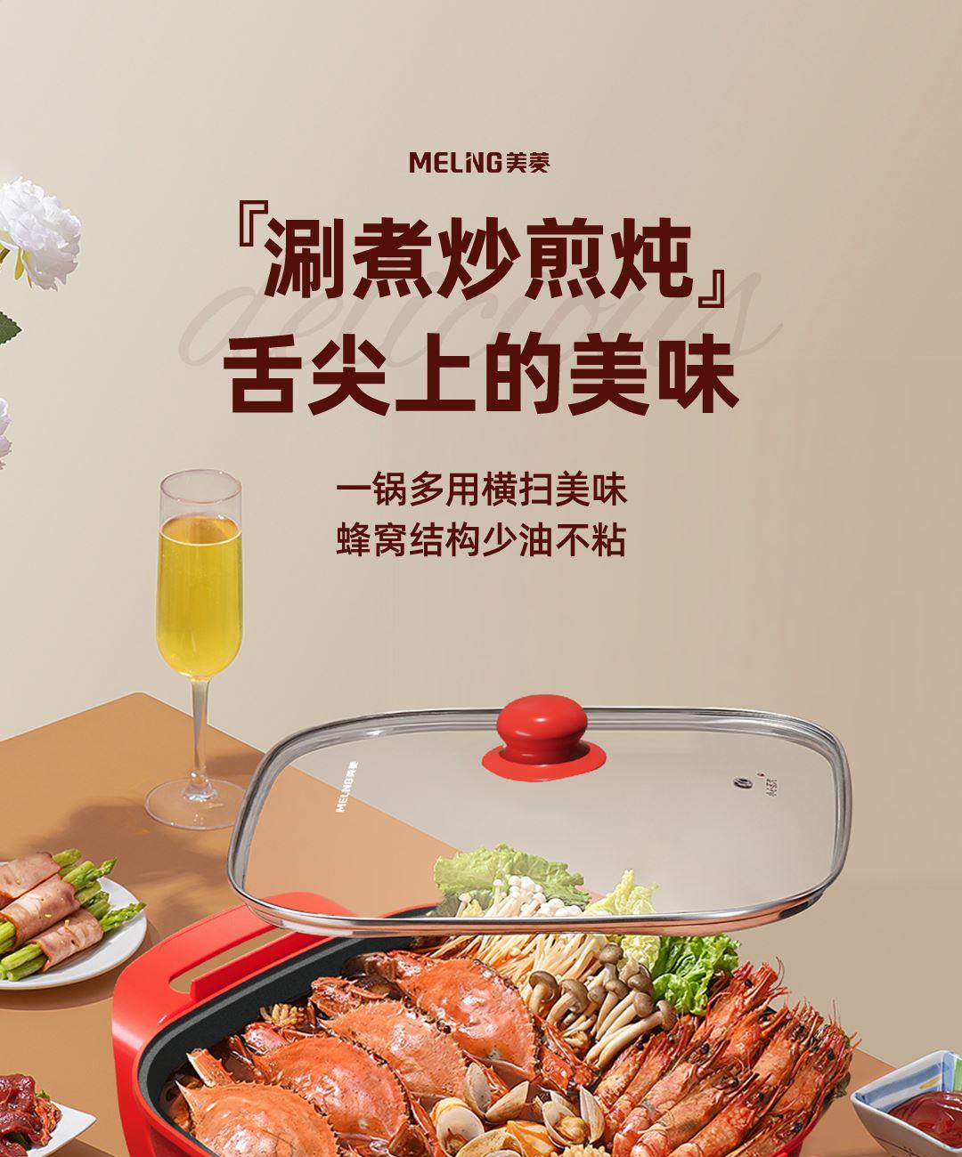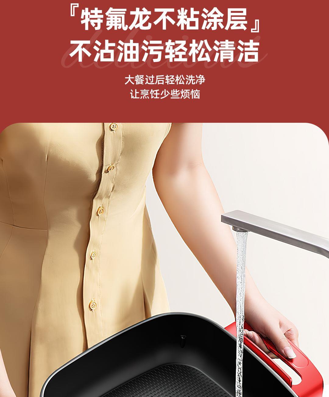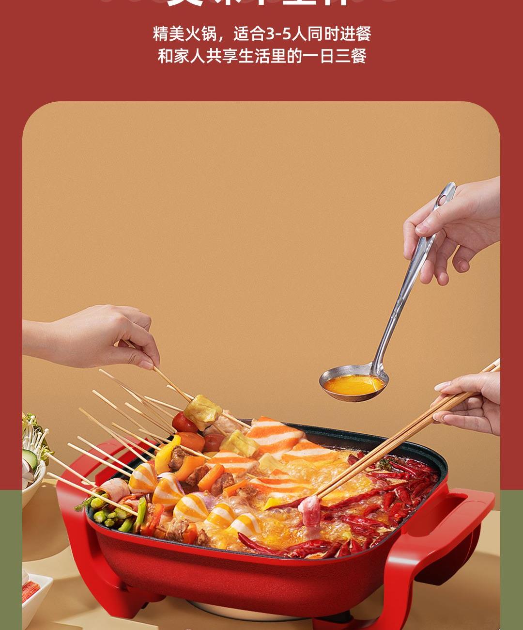 产品尺寸:440*310*180mm 彩箱包装尺寸:445*155*330mm 彩箱外箱尺寸:800*460*355mm 单台毛重:2.5kg 单台净重:2.2kg 颜色:红色 包装材料:彩包 额定电压:220V~ 额定频率:50Hz 额定功率:1360W 容 量:6L 产品材质:铝合金材质 产品颜色:红色 产品条码:6936897541859 加厚锅体不粘锅涂层 | 一体锅 | 分离插座