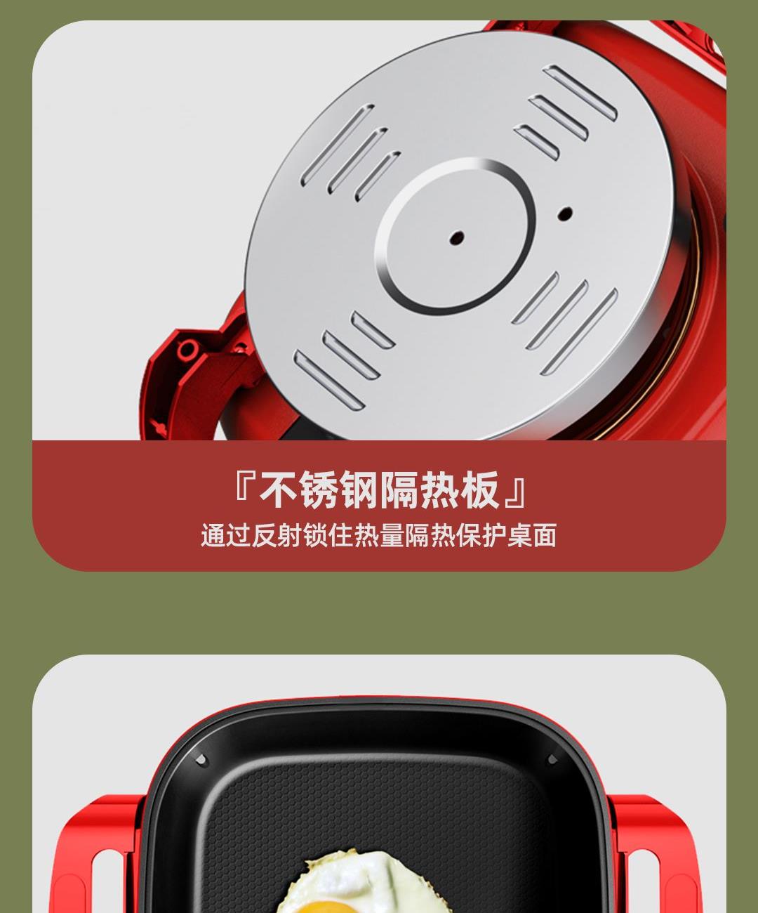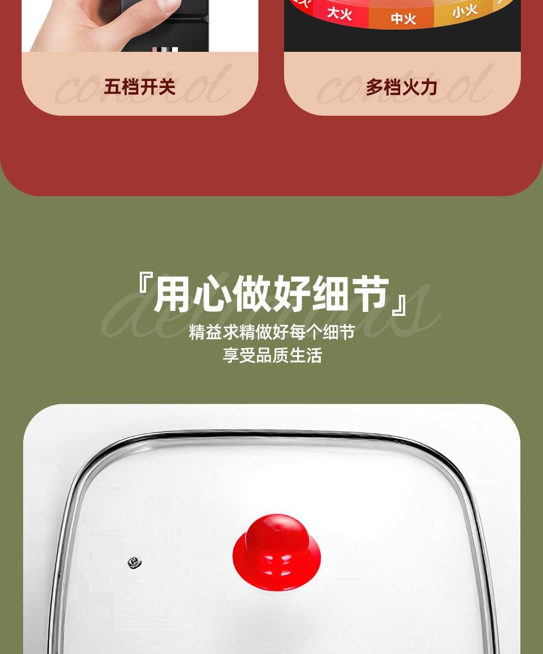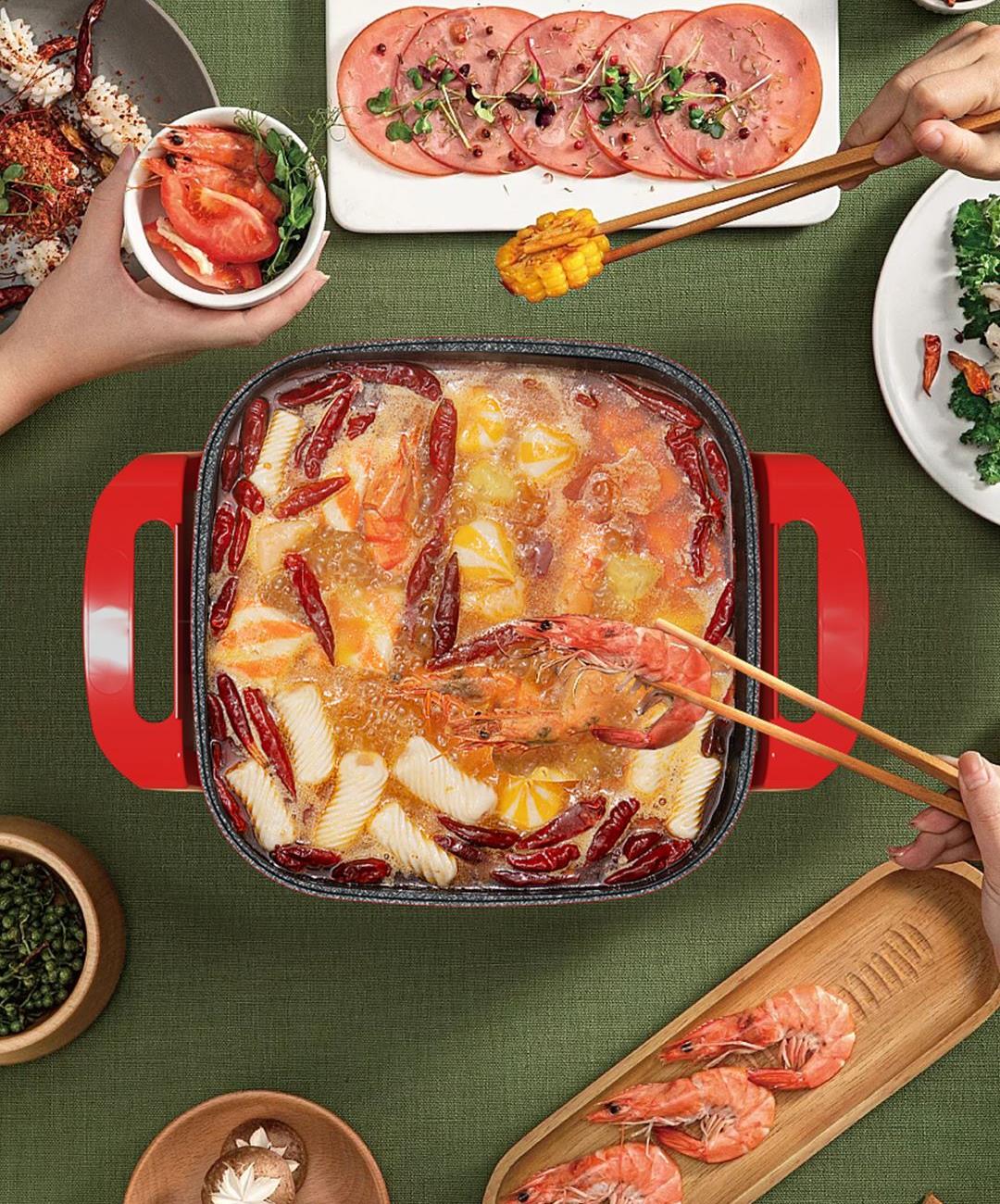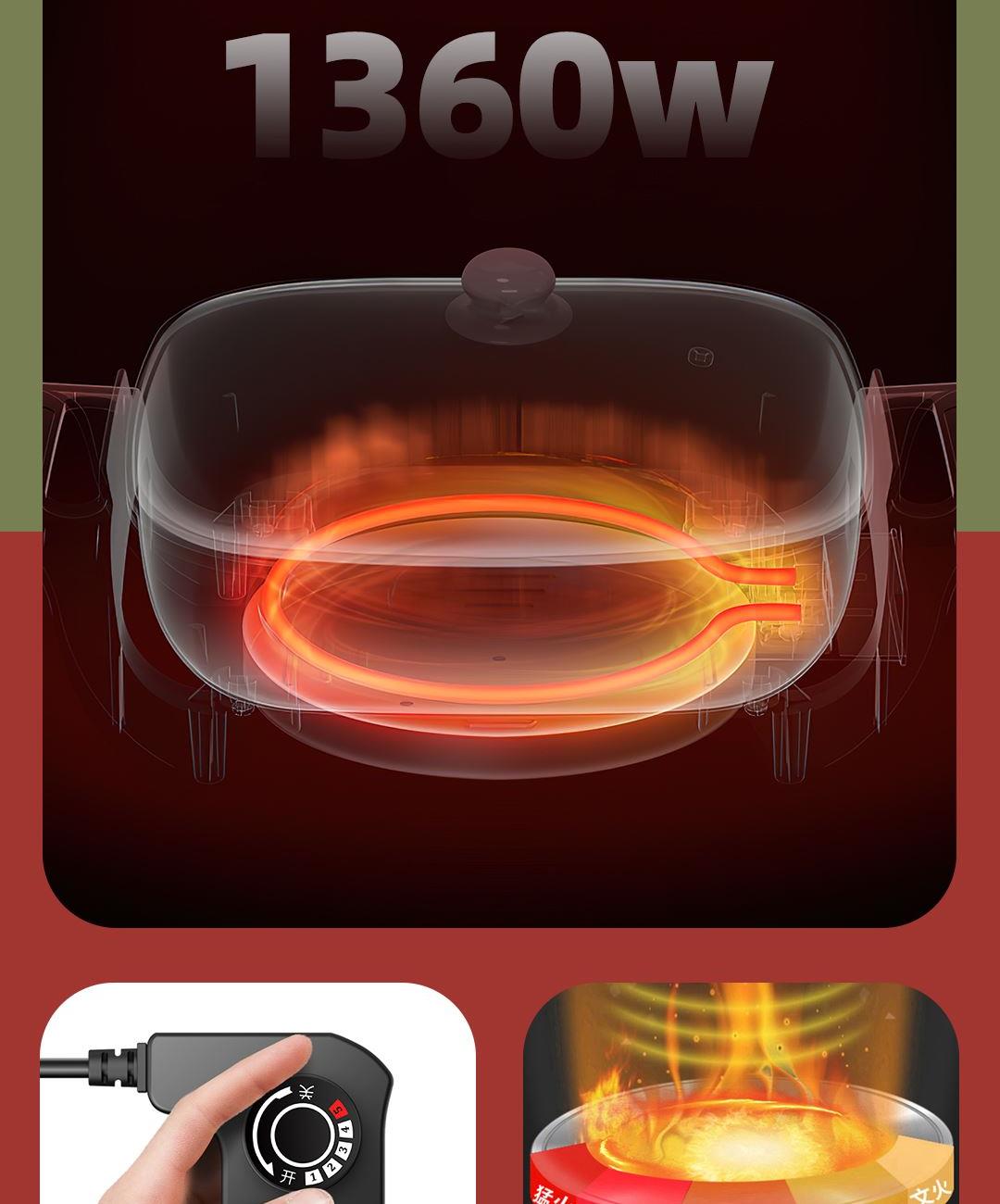 产品尺寸:440*310*180mm 彩箱包装尺寸:445*155*330mm 彩箱外箱尺寸:800*460*355mm 单台毛重:2.5kg 单台净重:2.2kg 颜色:红色 包装材料:彩包 额定电压:220V~ 额定频率:50Hz 额定功率:1360W 容 量:6L 产品材质:铝合金材质 产品颜色:红色 产品条码:6936897541859 加厚锅体不粘锅涂层 | 一体锅 | 分离插座