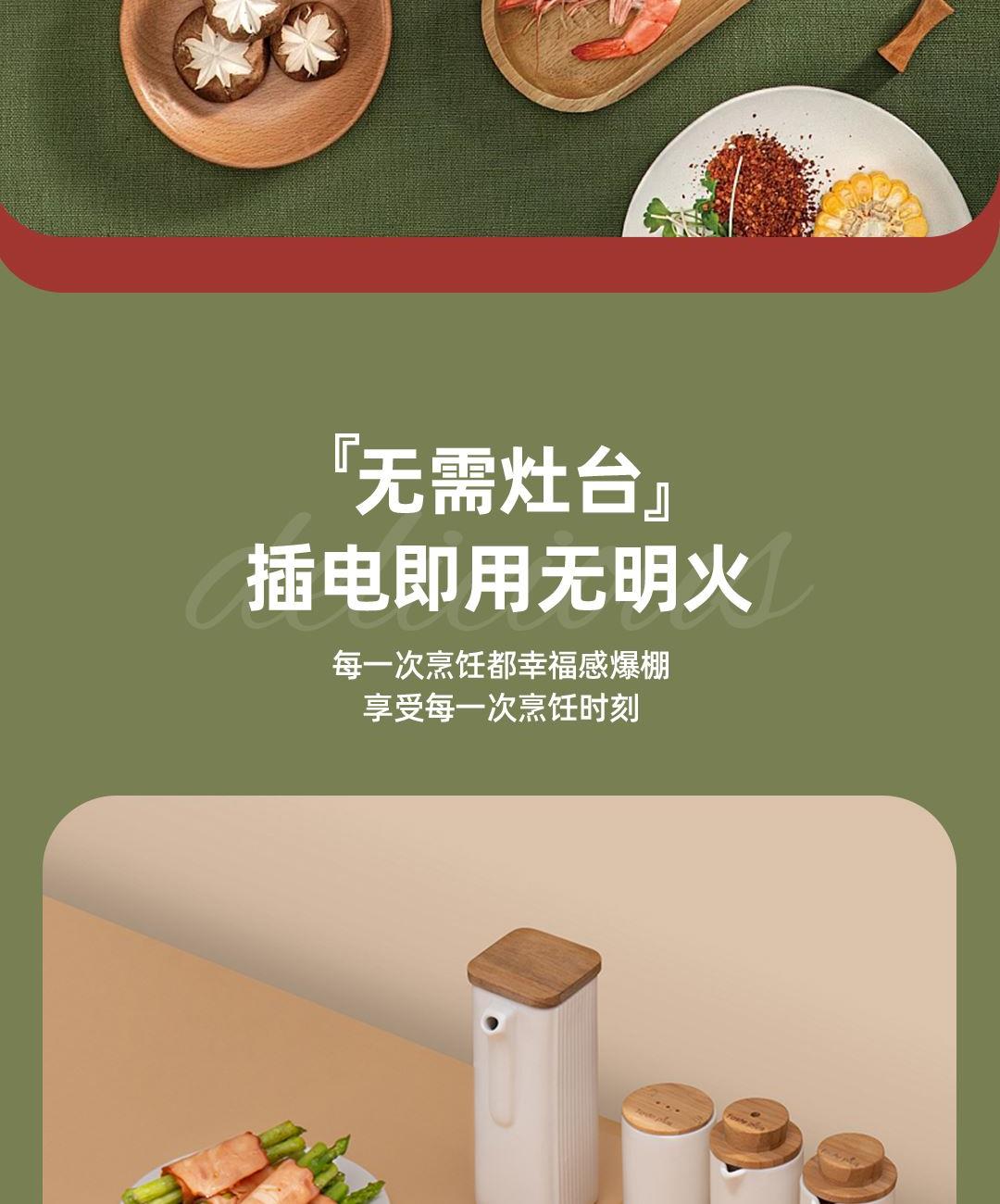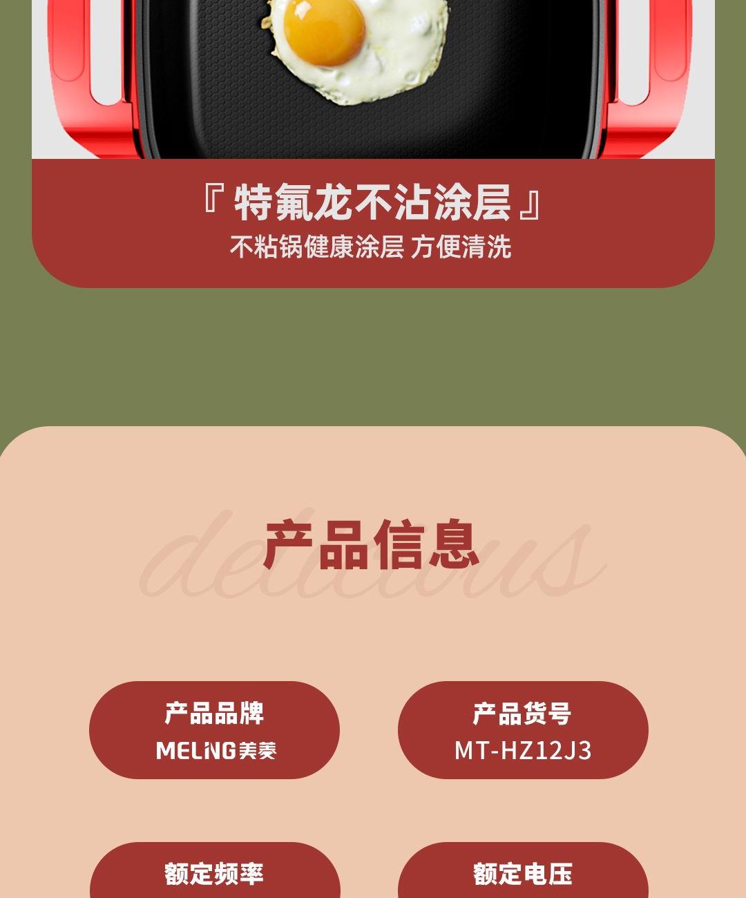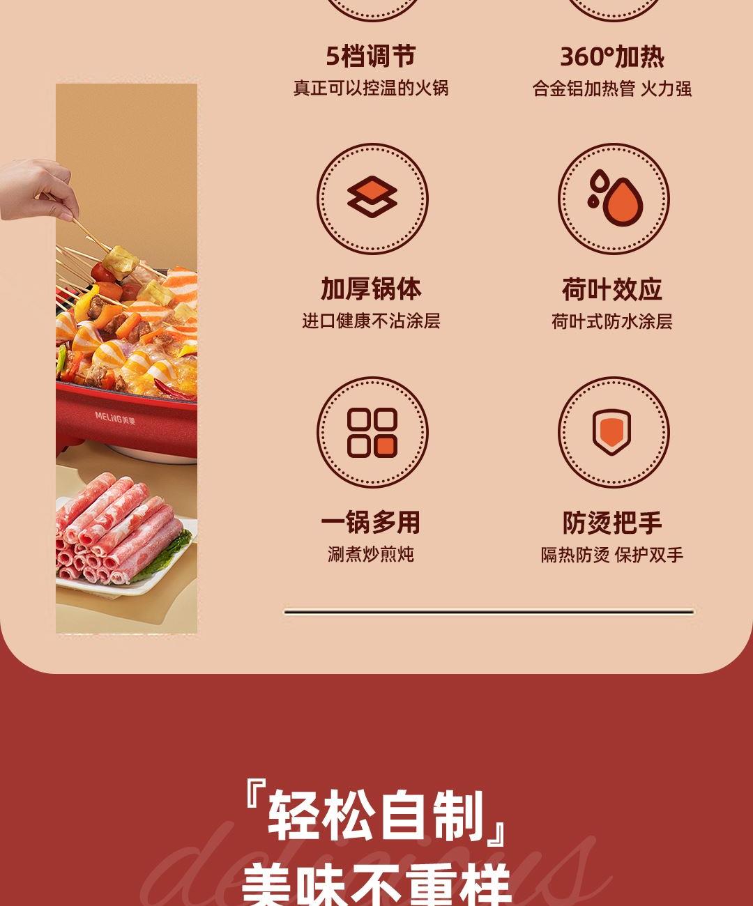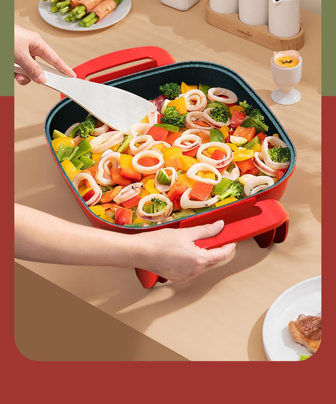 产品尺寸:440*310*180mm 彩箱包装尺寸:445*155*330mm 彩箱外箱尺寸:800*460*355mm 单台毛重:2.5kg 单台净重:2.2kg 颜色:红色 包装材料:彩包 额定电压:220V~ 额定频率:50Hz 额定功率:1360W 容 量:6L 产品材质:铝合金材质 产品颜色:红色 产品条码:6936897541859 加厚锅体不粘锅涂层 | 一体锅 | 分离插座