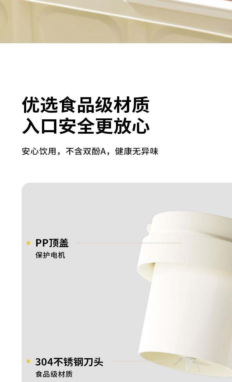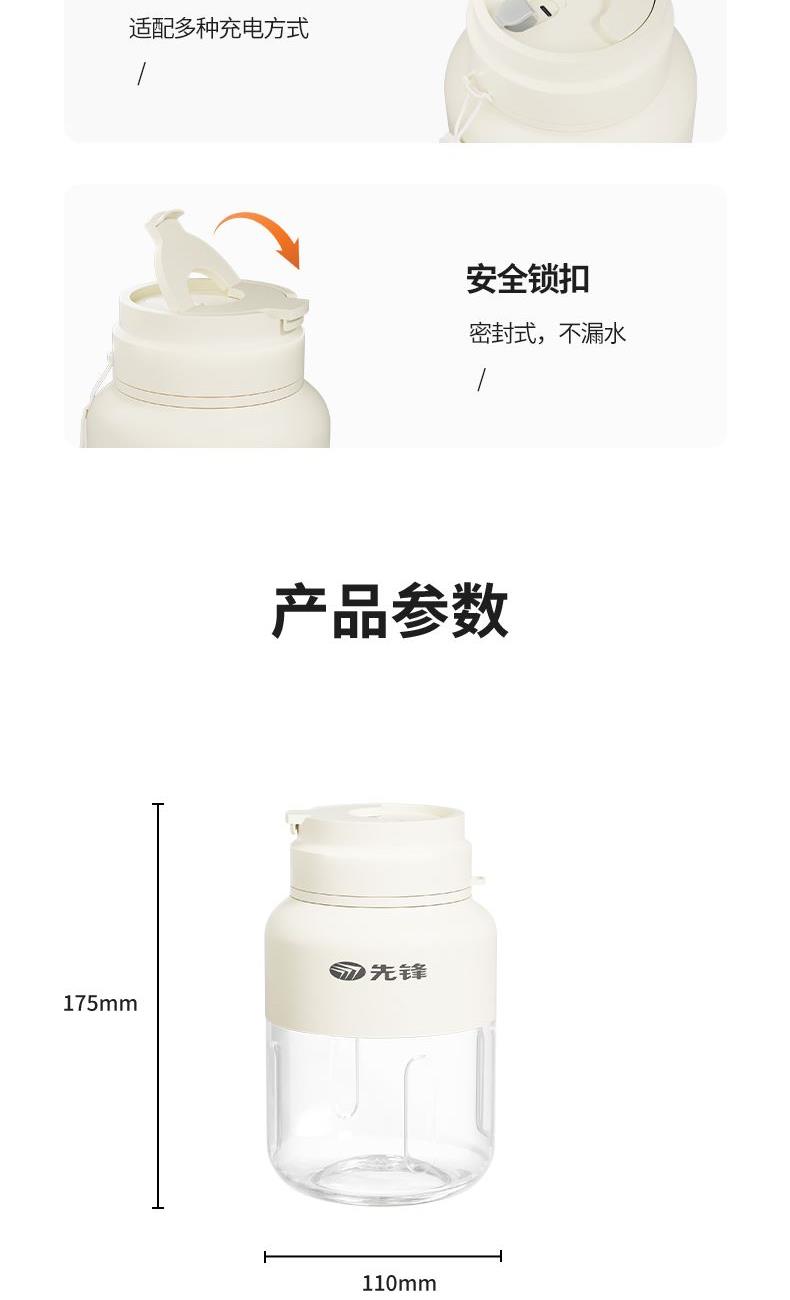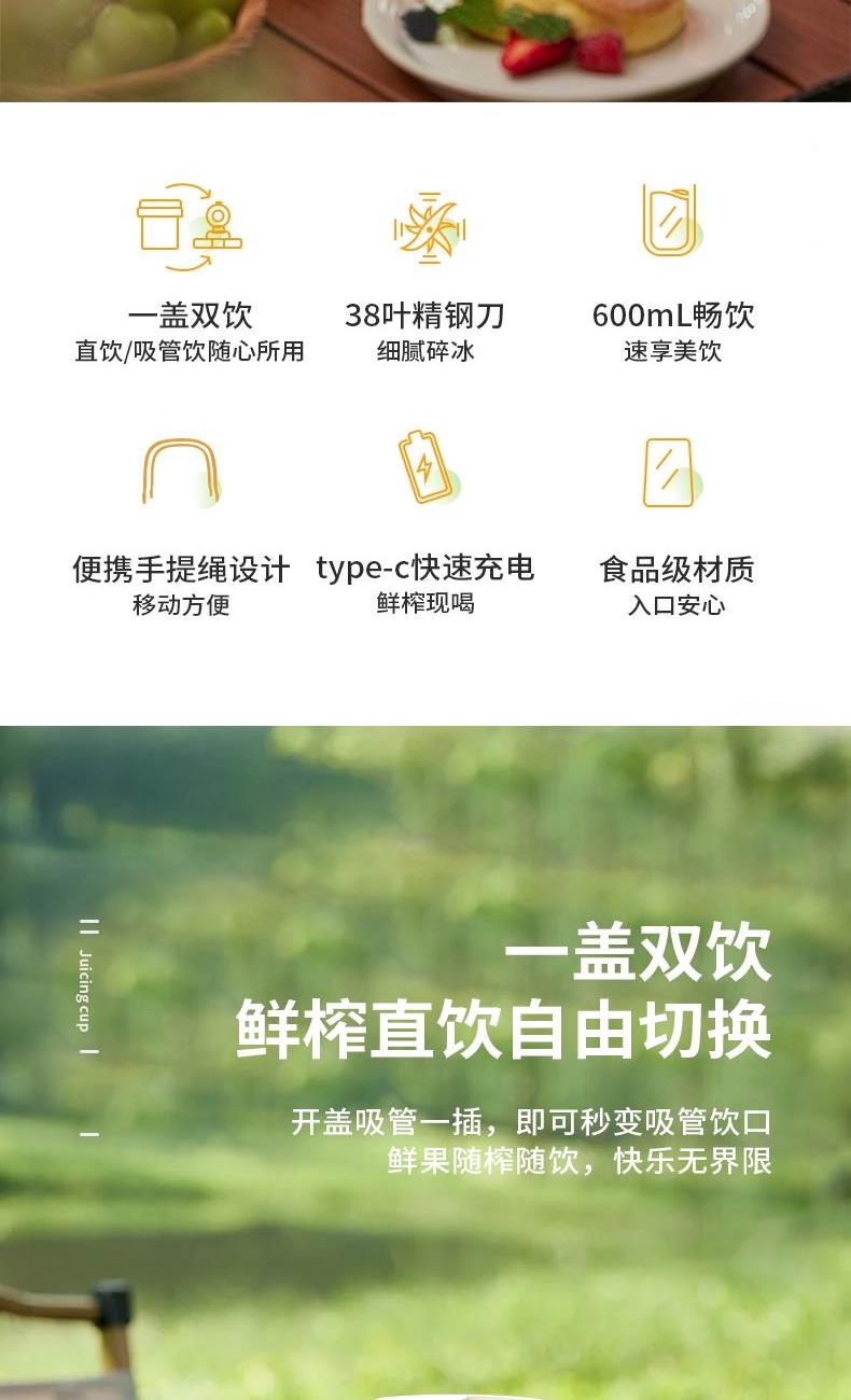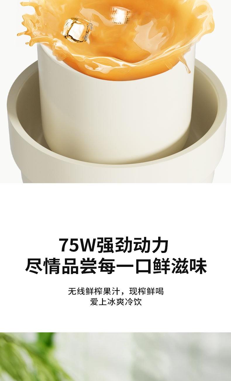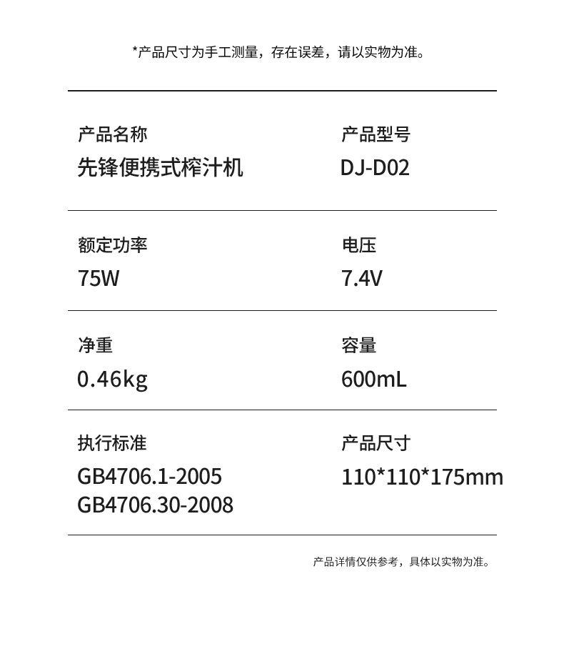 彩盒尺寸:115*115*240mm 大外箱尺寸:480*355*500mm 单台净重:0.46kg 单台毛重:0.56kg 容量:600ml 额定电压:7.4V 额定功率:75W 包装方式:彩盒+大外箱 600ml容量,户外便携榨汁 | 双击启动,操作简单 | 鲜榨直饮二合一,配带吸管,开盖即享用 | 75W强劲动力,快速破碎食材,随地补充能量