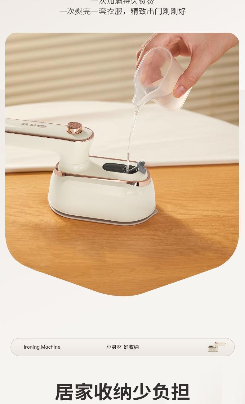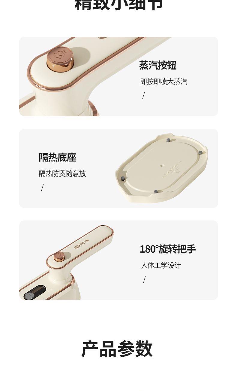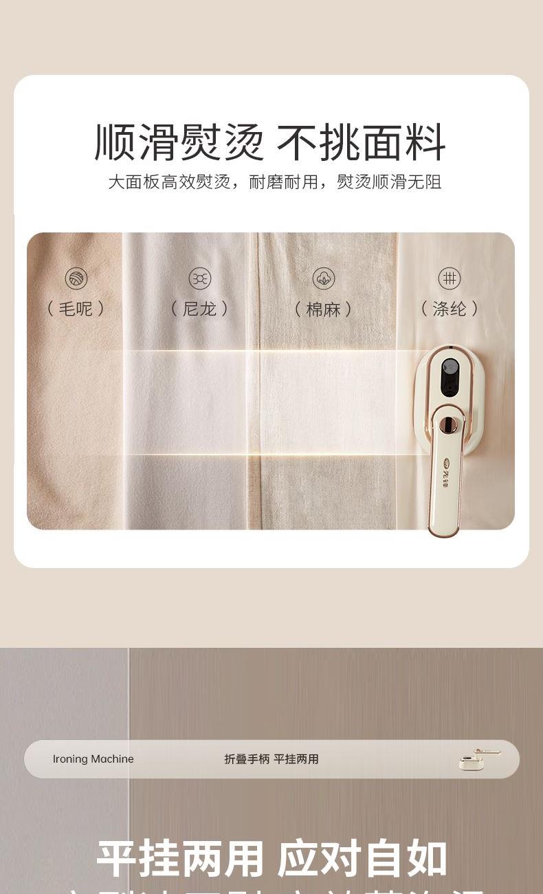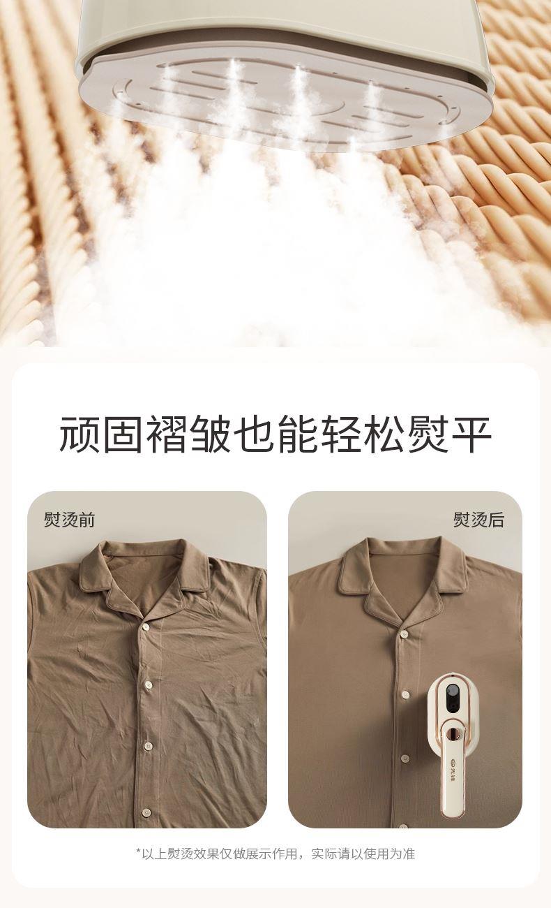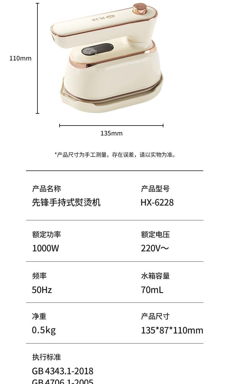 彩包尺寸:170*110*110mm 外包尺寸:460*355*580mm 单台毛重:0.52kg单台净重:0.5kg 额定电压:220V 额定功率:1000W 产品条码:6977197070380 包装材料:彩盒+大外箱 产品尺寸:200*80*120mm 1000W精控大蒸汽,深层穿透快速抚平,不伤衣熨烫效果肉眼见,不挑面料快速熨平,小巧体积易收纳差旅便携倍轻松