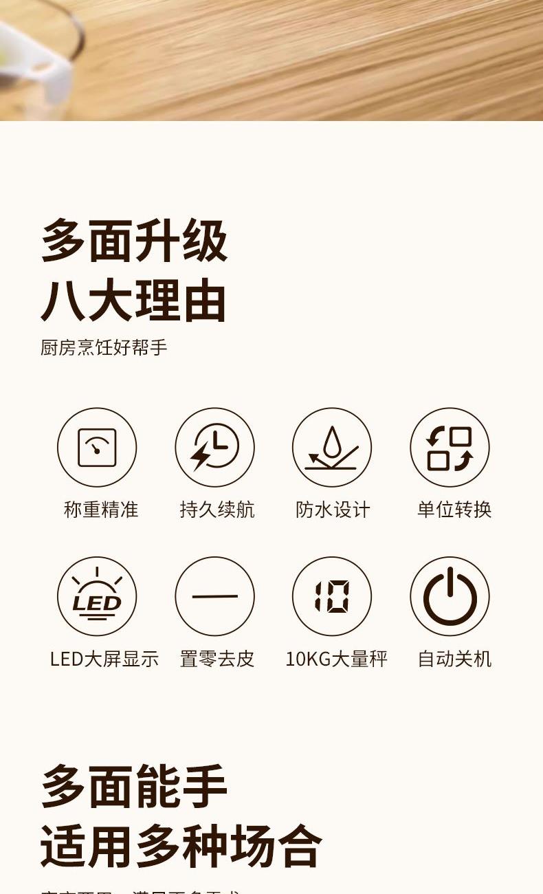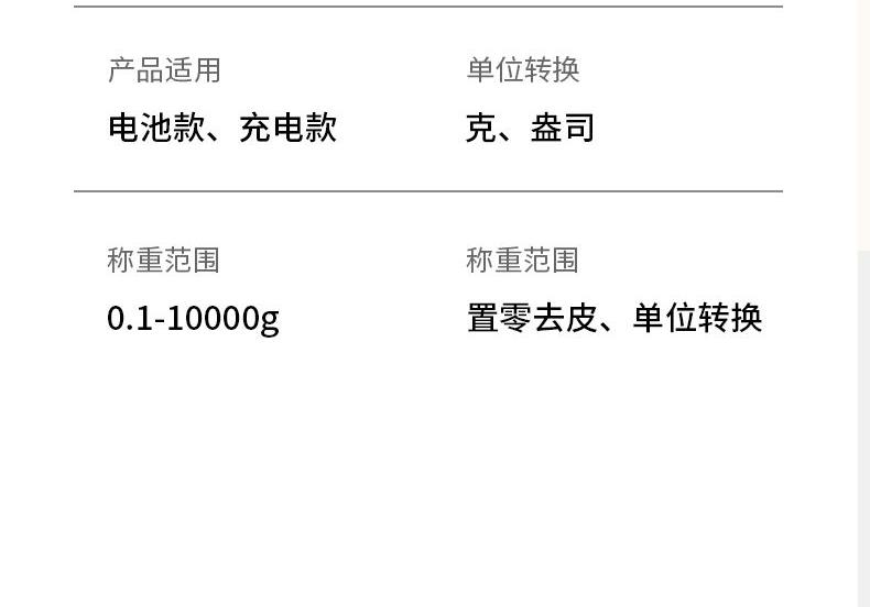 包装尺寸:160*48*220mm 外箱尺寸:525*440*360mm 单台净重:0.26kg 单台毛重:0.38kg 充电电压:5V 充电电流:1A 产品条码:6977197070311 包装方式:黄包+大外箱 不锈钢面板易清洁 | 一件去皮 单位随意切换 | LCD背光显示 USB充电 秤面放水设计