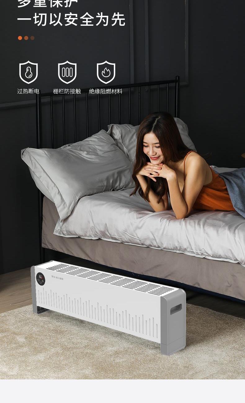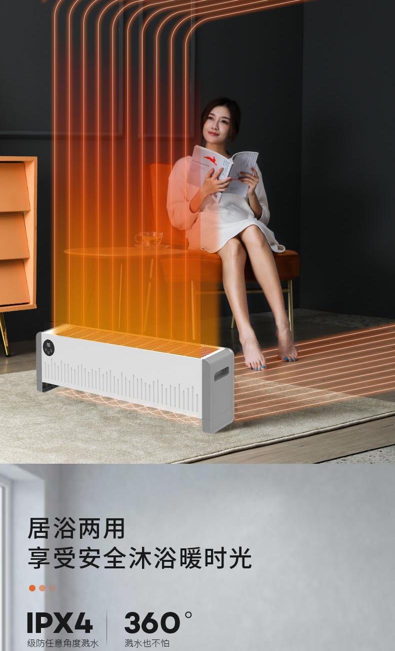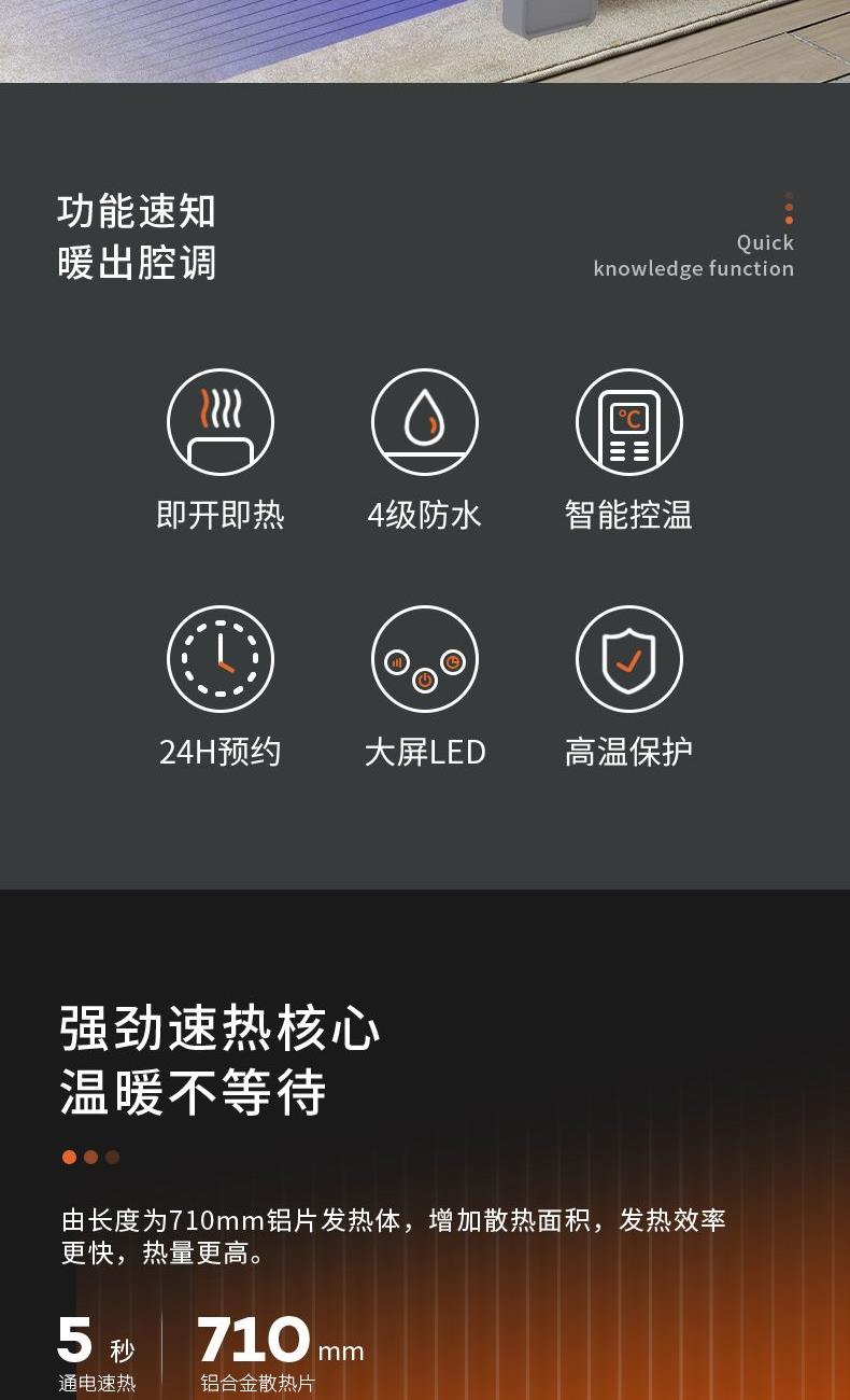 IPX4级防水,居浴两用 360°防溅水、浴室用完卧室用 | 铝片发热体,热效高、全面提升加热速度与效果 | 超大三位8显示屏,显示更清晰,操作更方便 | 0.8米人性化设计,不在让你担心无处安放 | 0.8mm宽/60mm长,一共80个超大散热孔,散热面积大,对流速度更快、更均匀 | 高温断电保护,安全更安心 | 24H预约开关机,为你私人订制你的需求时间。