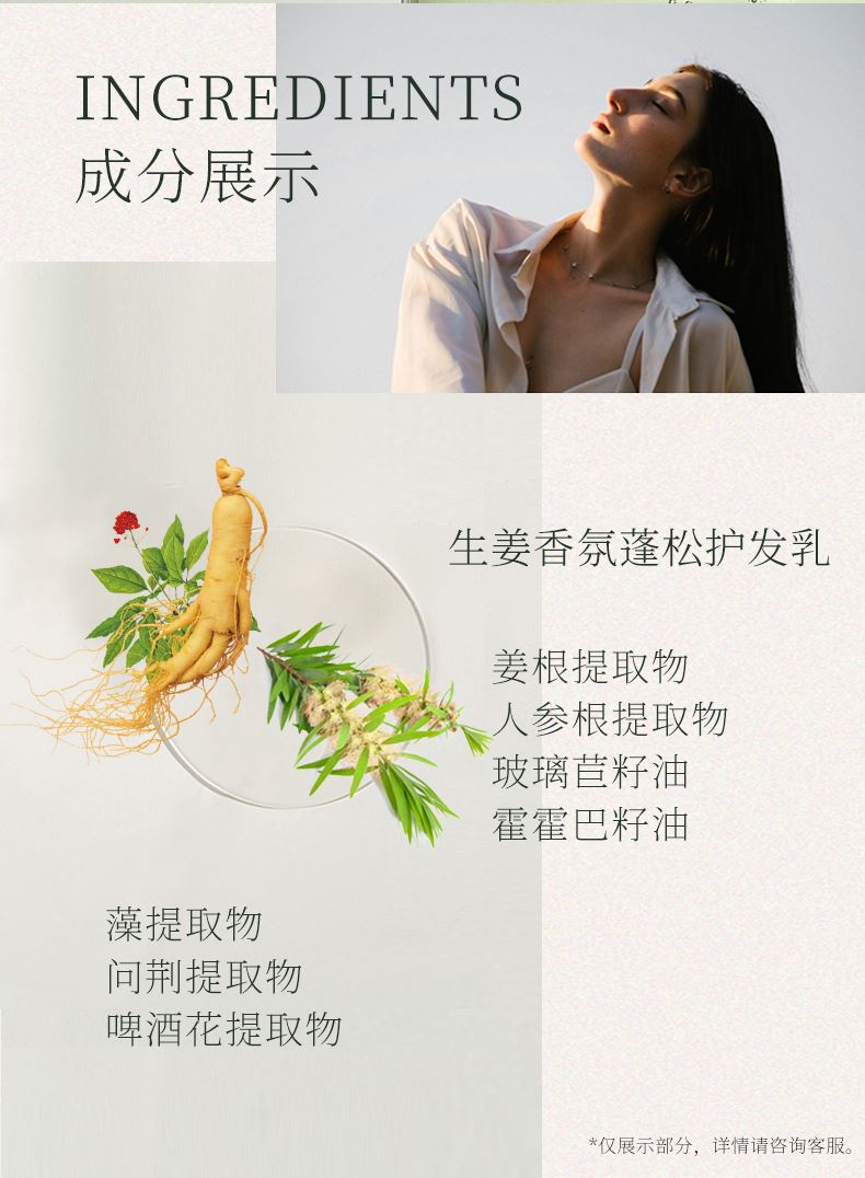 天然之房生姜香宗缝松护发乳集取姜棂提取物、坡靖苣好油、霍里巴籽油等相萃成分。洗感轻盈不粕腻,抚顺发丝毛课、维结,使秀发沁香优距,柔光闪理,使用方法:取话显本品,均匀涂于清洁后的湿发,用清水冲洗干净,配合天然之席洗发露放果更好。