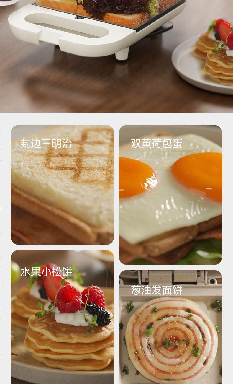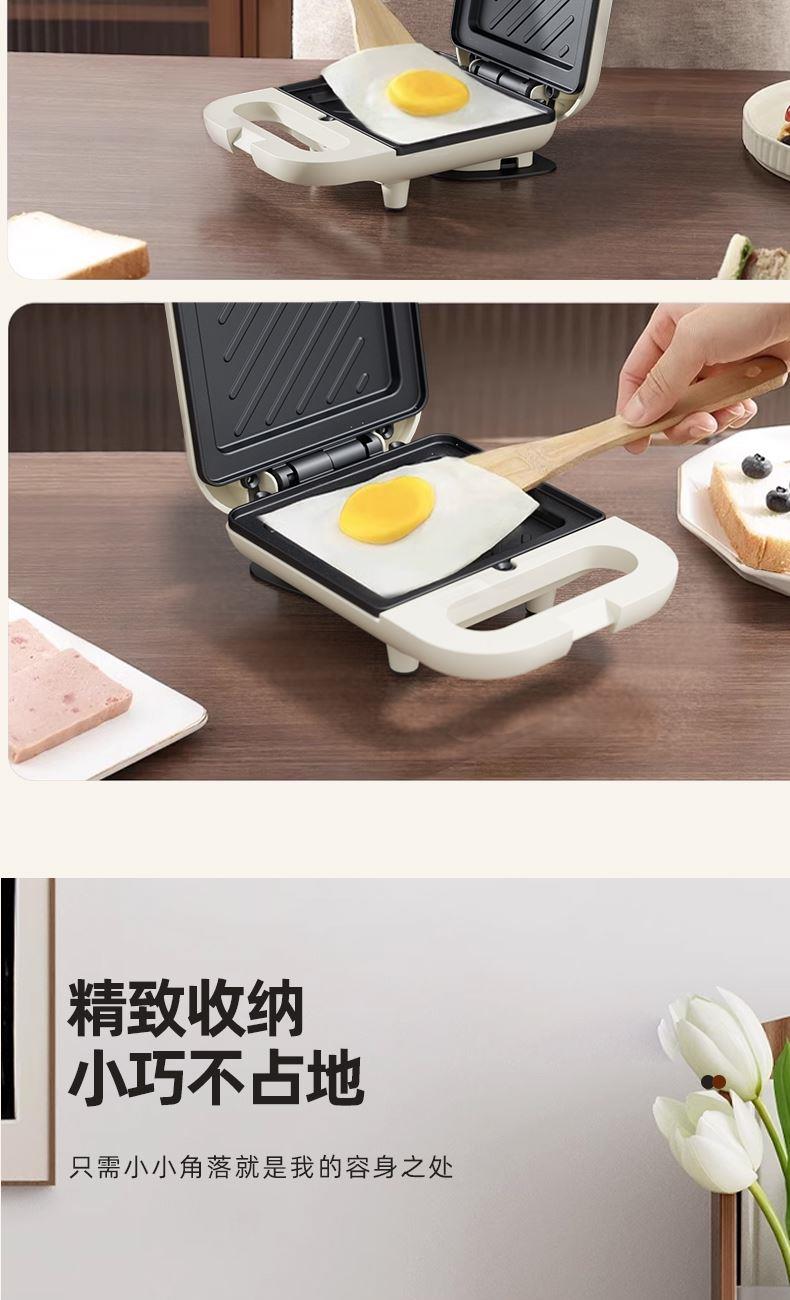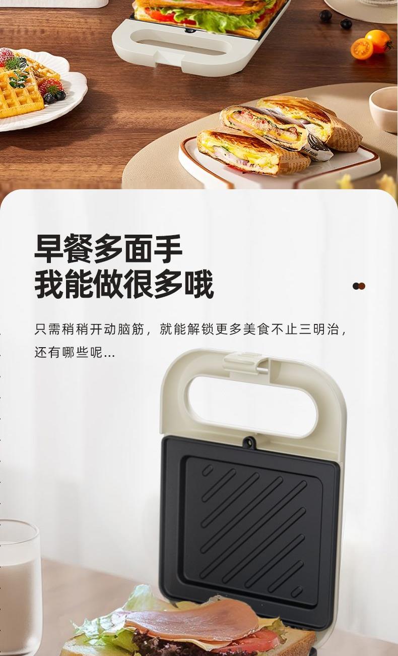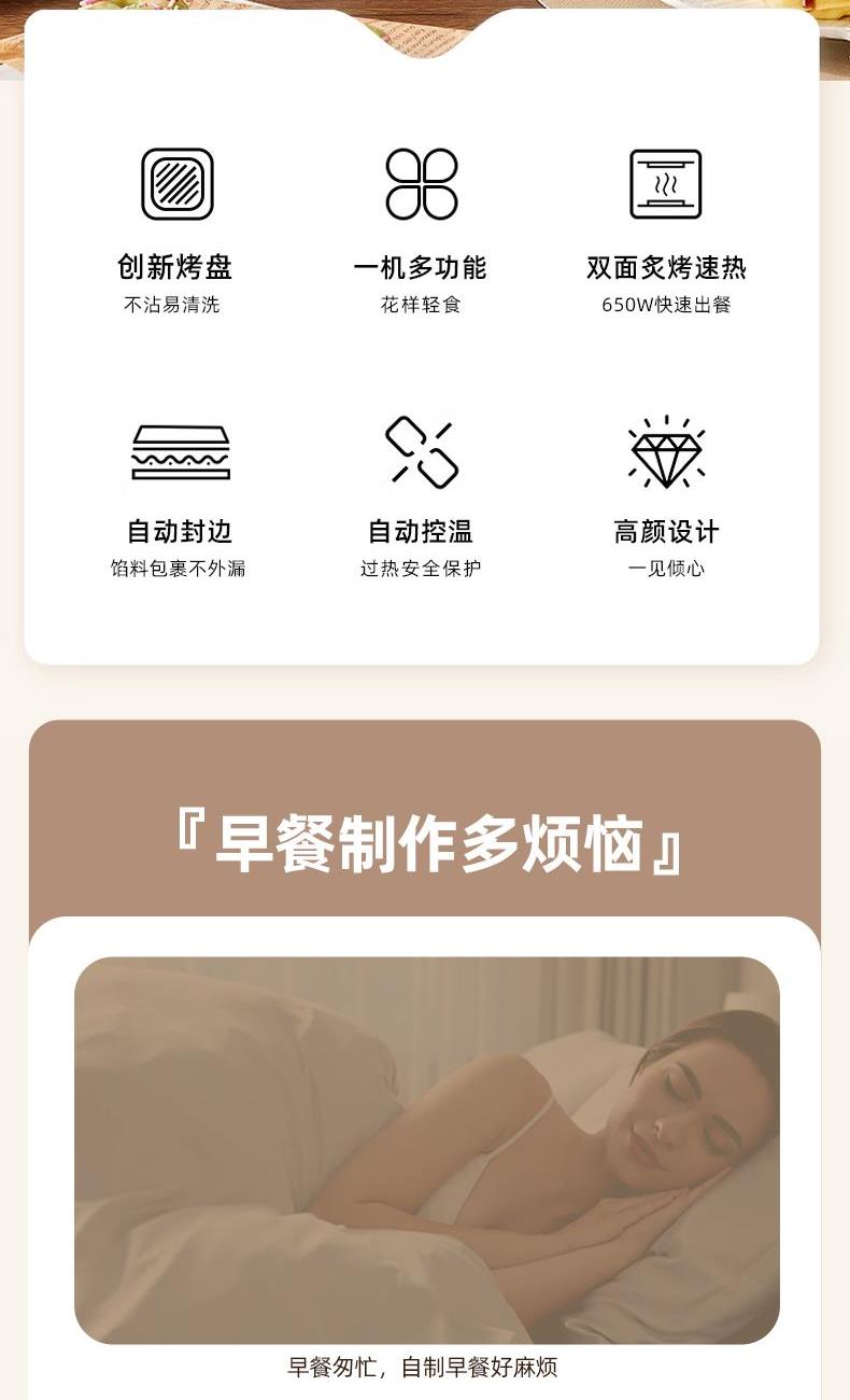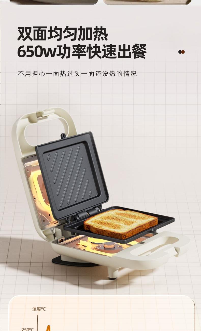 彩包尺寸:163*96*220mm 外包尺寸:505*455*515mm 单台毛重:0.7kg 单台净重:0.6kg 额定电压:220V 额定频率:50HZ 产品条码:6977197070663 包装材料:彩盒+外箱 功率:650W 多功能早餐机,每天早餐不重样,双面加热快速升温,外酥里嫩,防烫手柄方便开合,防止烫伤,小巧便携收纳方便,不占地方