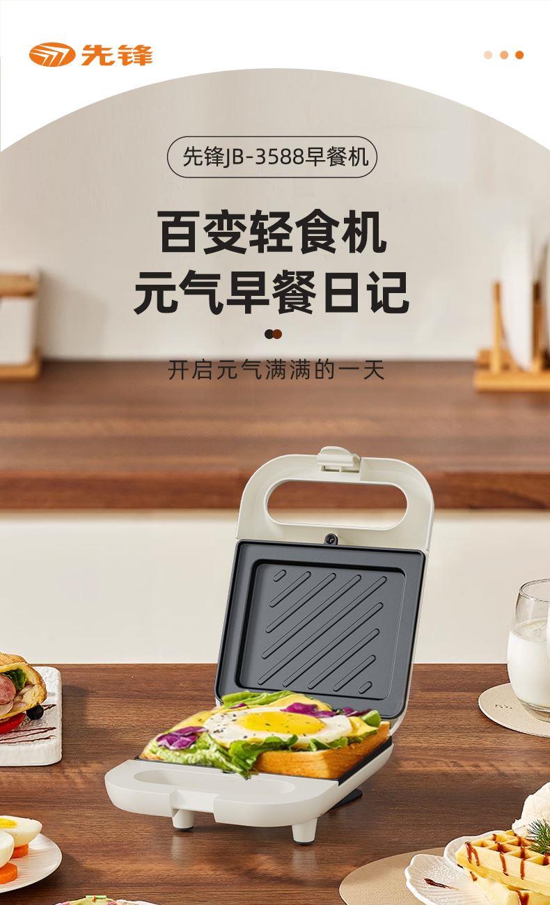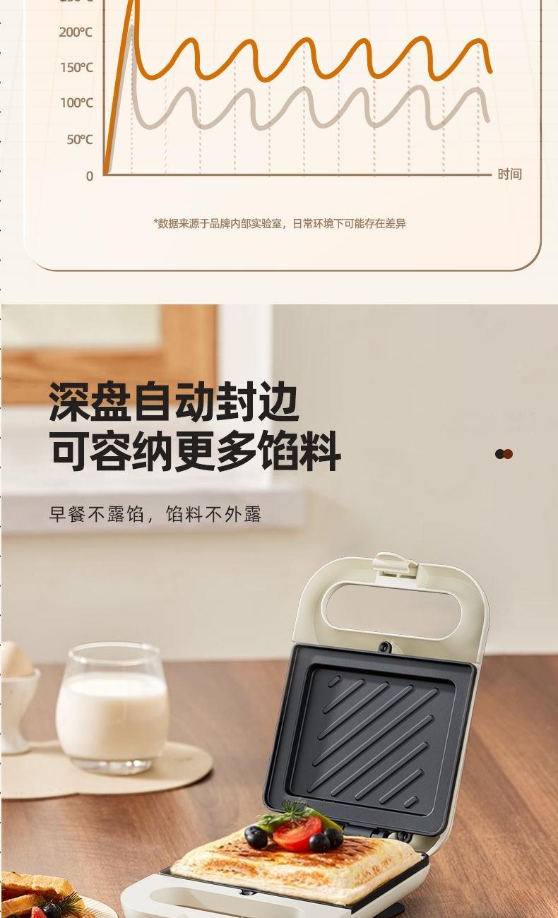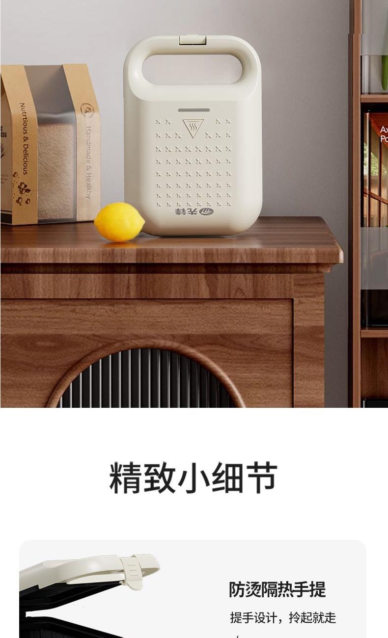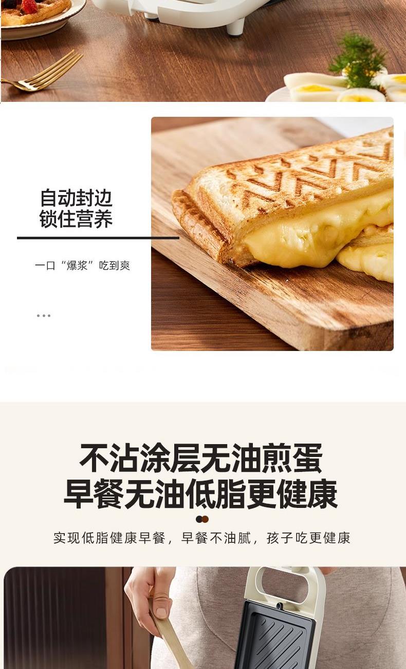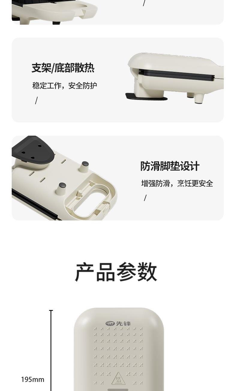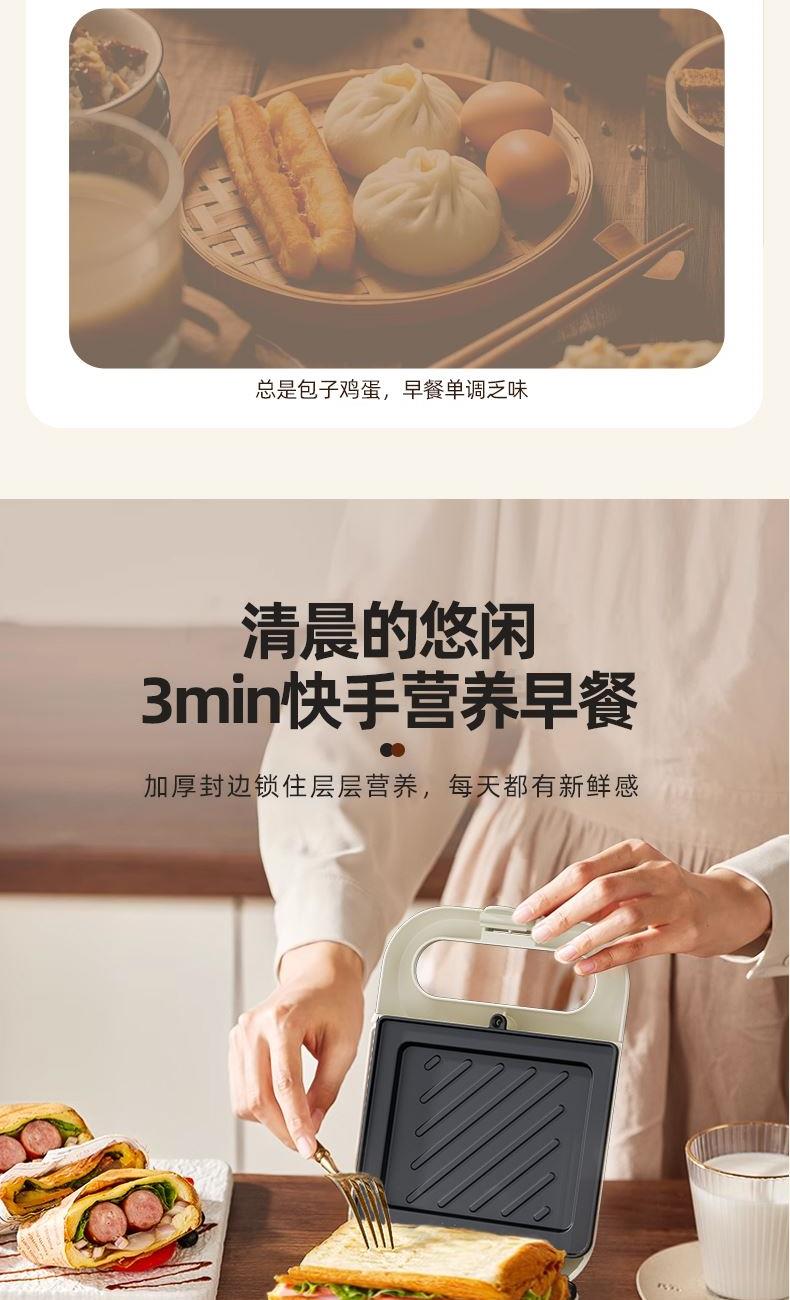 彩包尺寸:163*96*220mm 外包尺寸:505*455*515mm 单台毛重:0.7kg 单台净重:0.6kg 额定电压:220V 额定频率:50HZ 产品条码:6977197070663 包装材料:彩盒+外箱 功率:650W 多功能早餐机,每天早餐不重样,双面加热快速升温,外酥里嫩,防烫手柄方便开合,防止烫伤,小巧便携收纳方便,不占地方