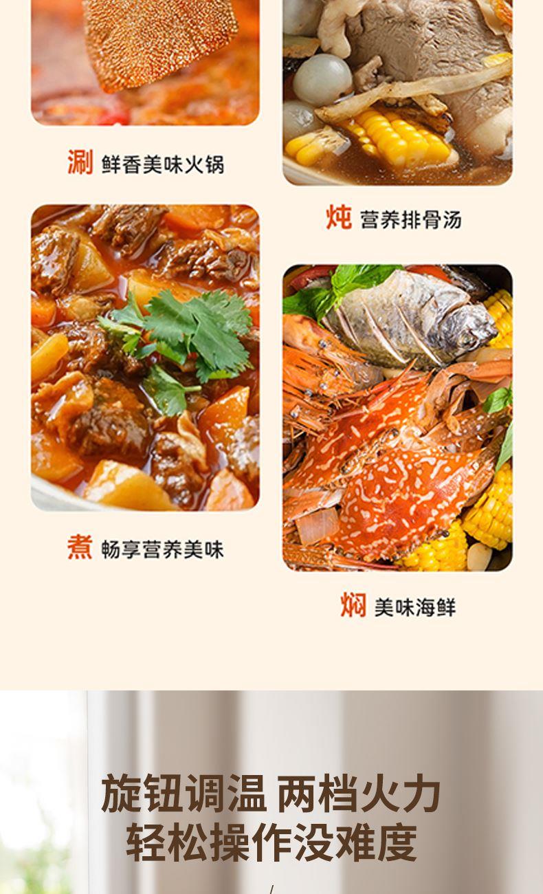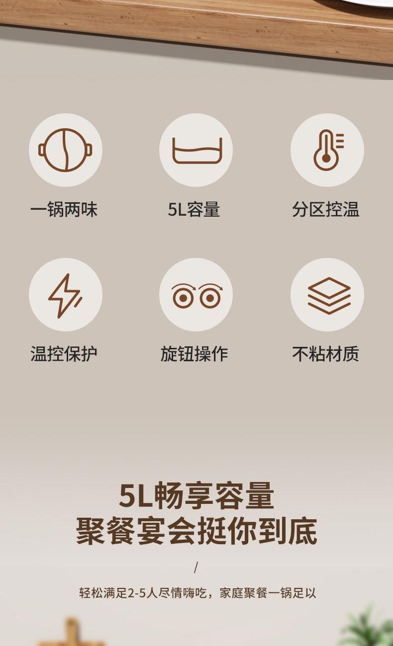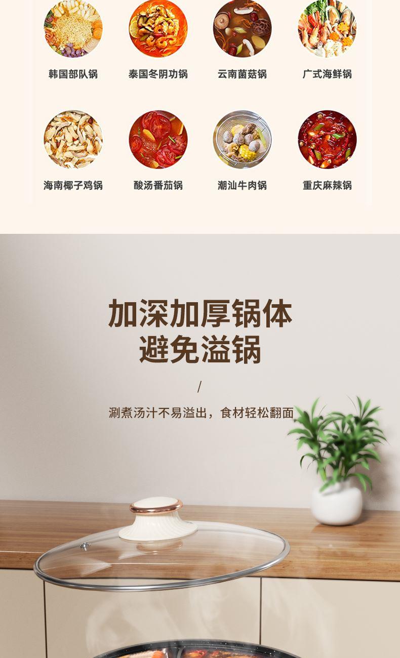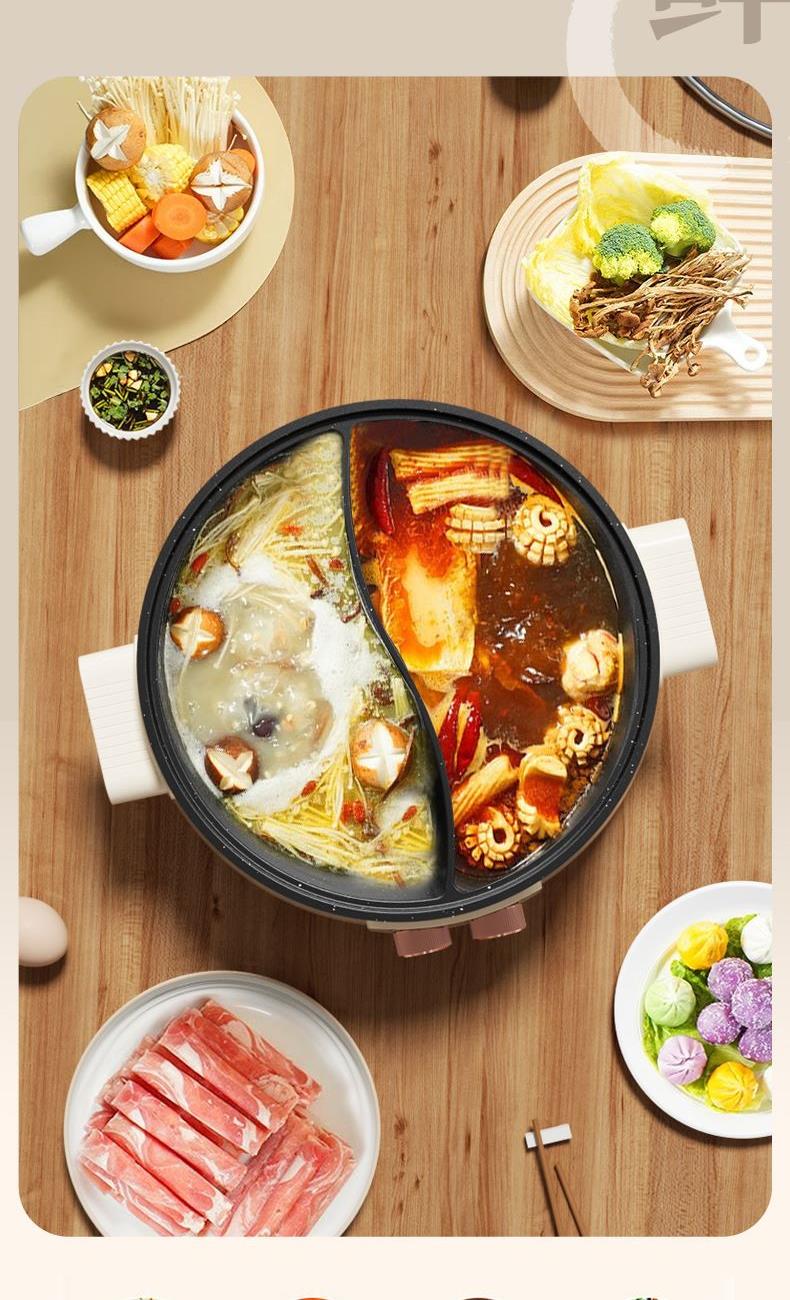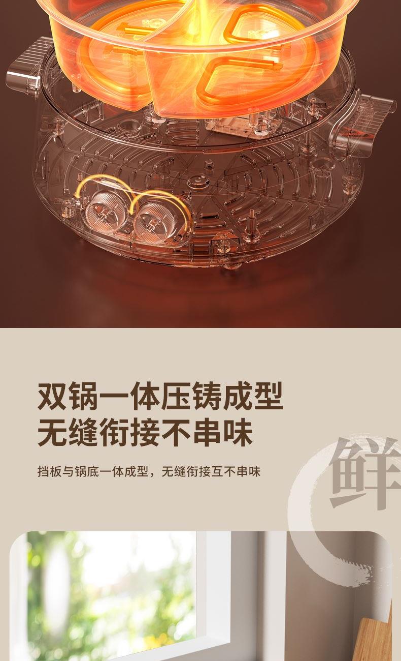 鸳鸯双拼大容量火锅,一锅两味 | 双旋钮独立温控,机械旋钮简单控制,两档调节,1600W大功率 | 双重隔热防烫 | 压铸厚实锅身,导热迅速均匀 | 精雕蜂窝网纹,涮煮不易粘锅 。