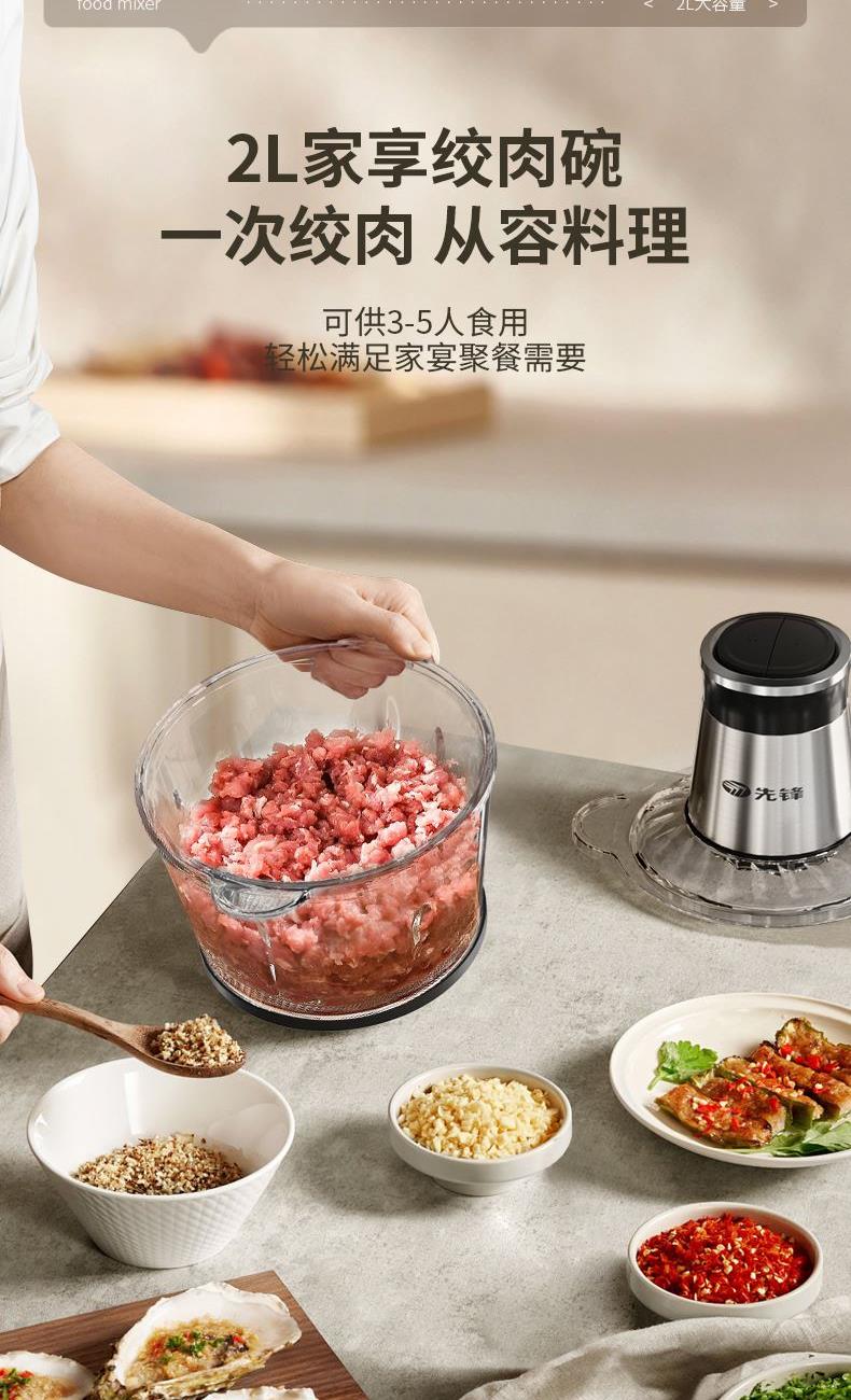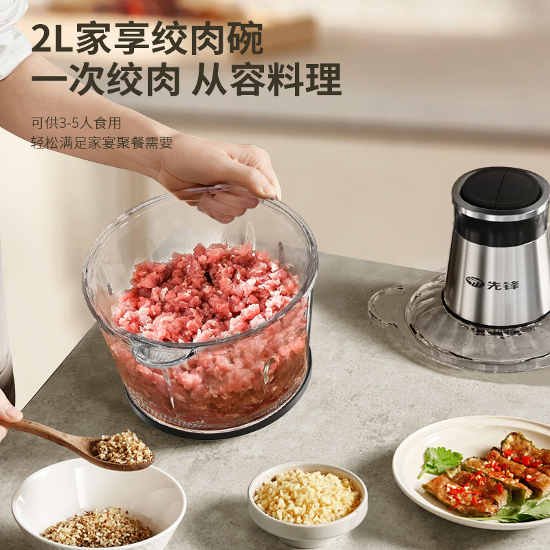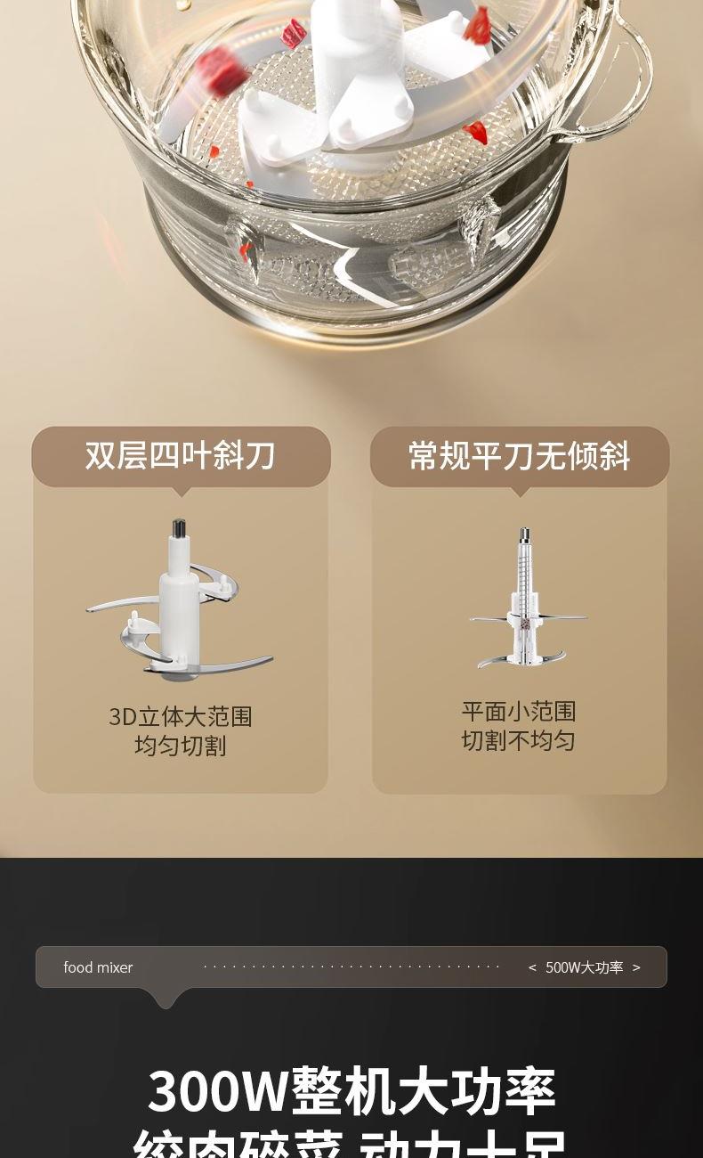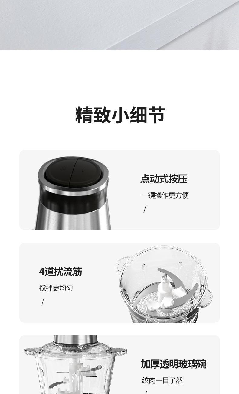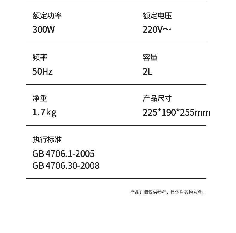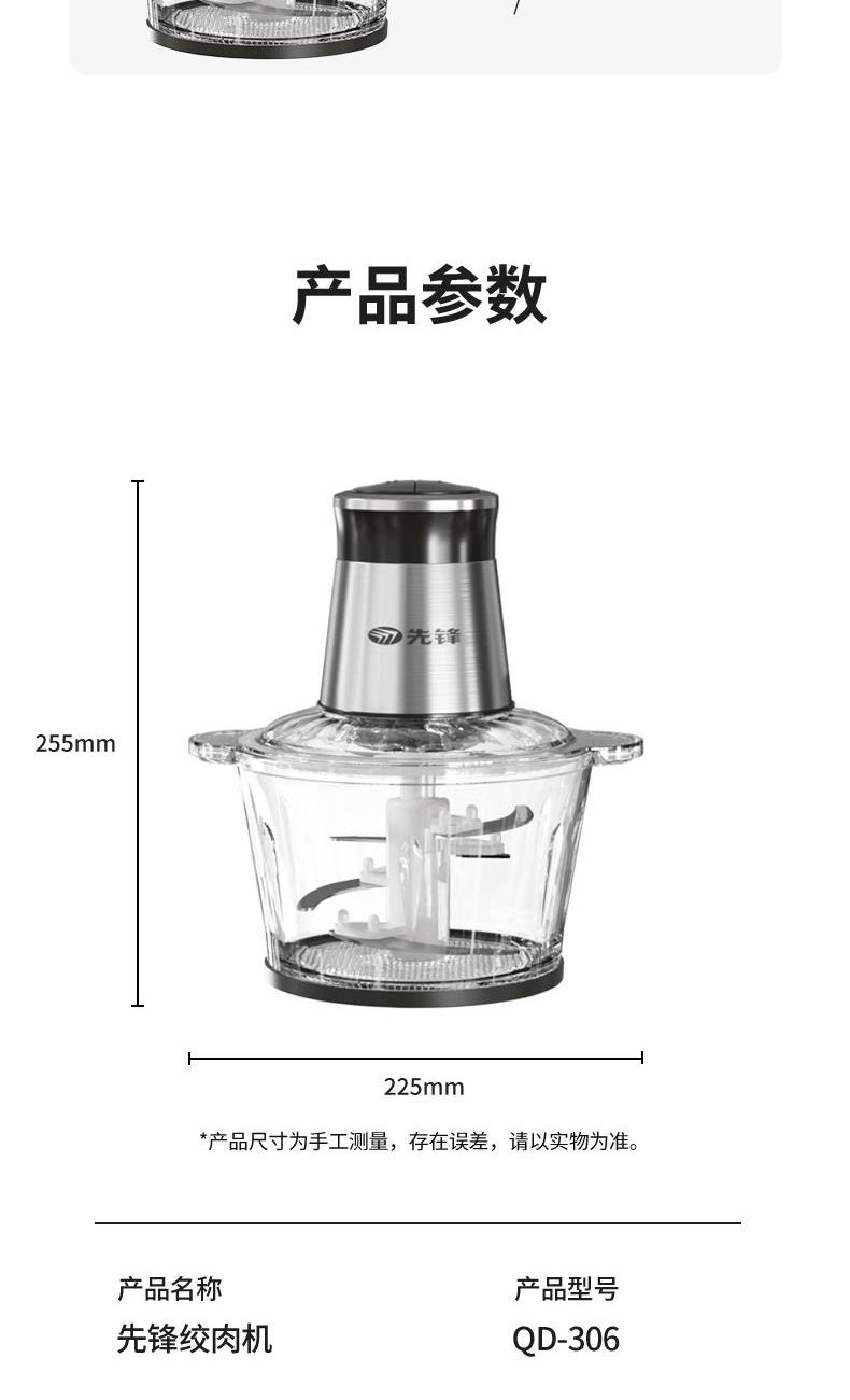 彩包尺寸:190*190*285mm 黄包尺寸:192*192*287mm 单台毛重:2.1kg 单台净重:1.7kg 额定电压:220V 额定功率:300W 产品条码:6923046249766 包装材料:彩盒+邮购盒 容量:2L产品尺寸:190*225*255mm 配合立体四层刀片,快慢两档任你选择,查看绞碎状态密封保护洁净,绞碎快速细腻,无需等待