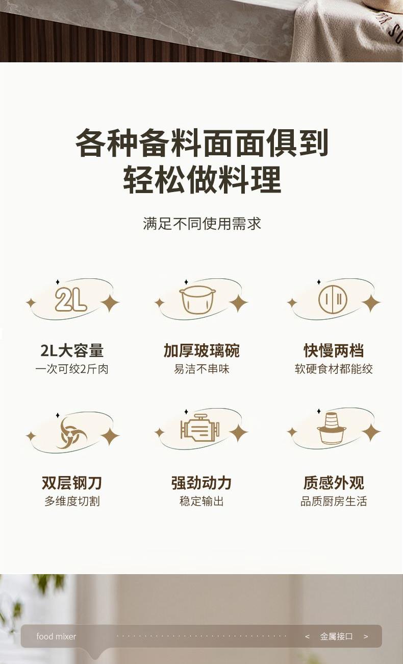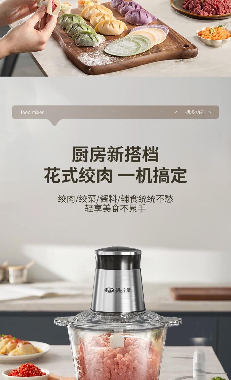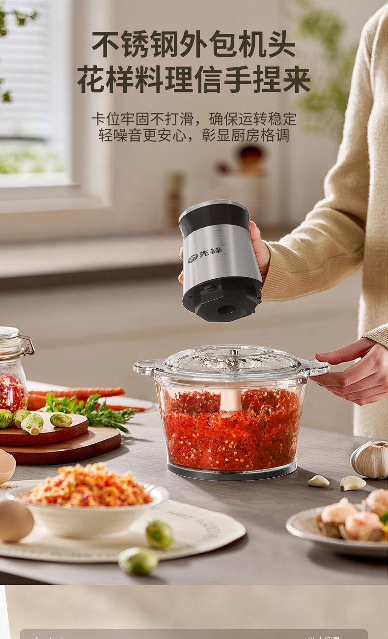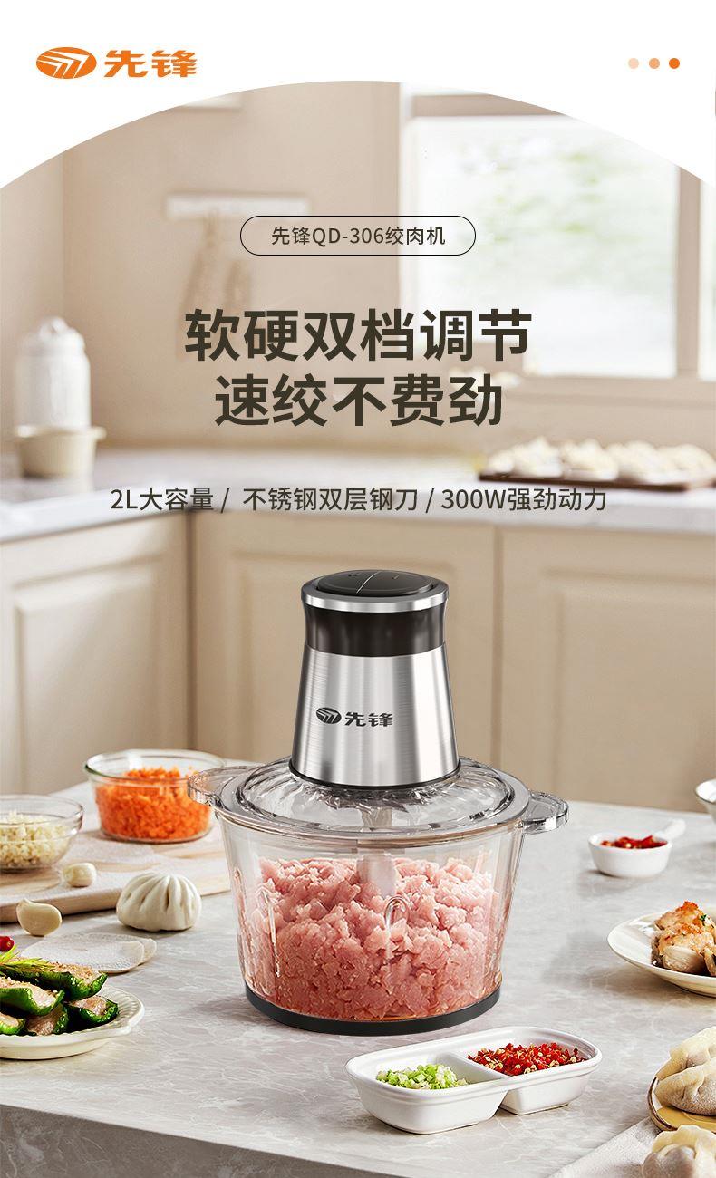 彩包尺寸:190*190*285mm 黄包尺寸:192*192*287mm 单台毛重:2.1kg 单台净重:1.7kg 额定电压:220V 额定功率:300W 产品条码:6923046249766 包装材料:彩盒+邮购盒 容量:2L产品尺寸:190*225*255mm 配合立体四层刀片,快慢两档任你选择,查看绞碎状态密封保护洁净,绞碎快速细腻,无需等待