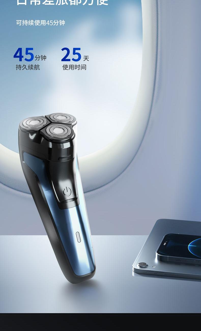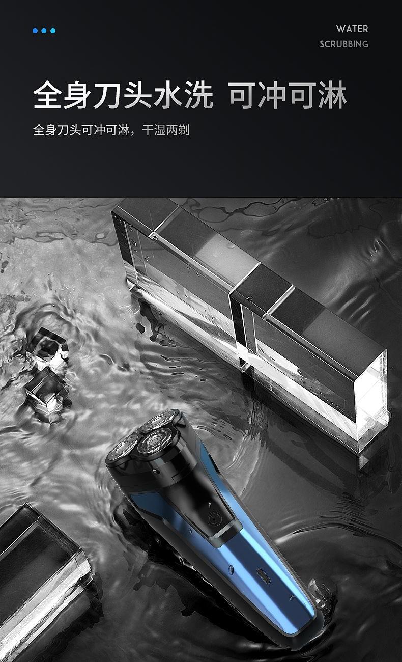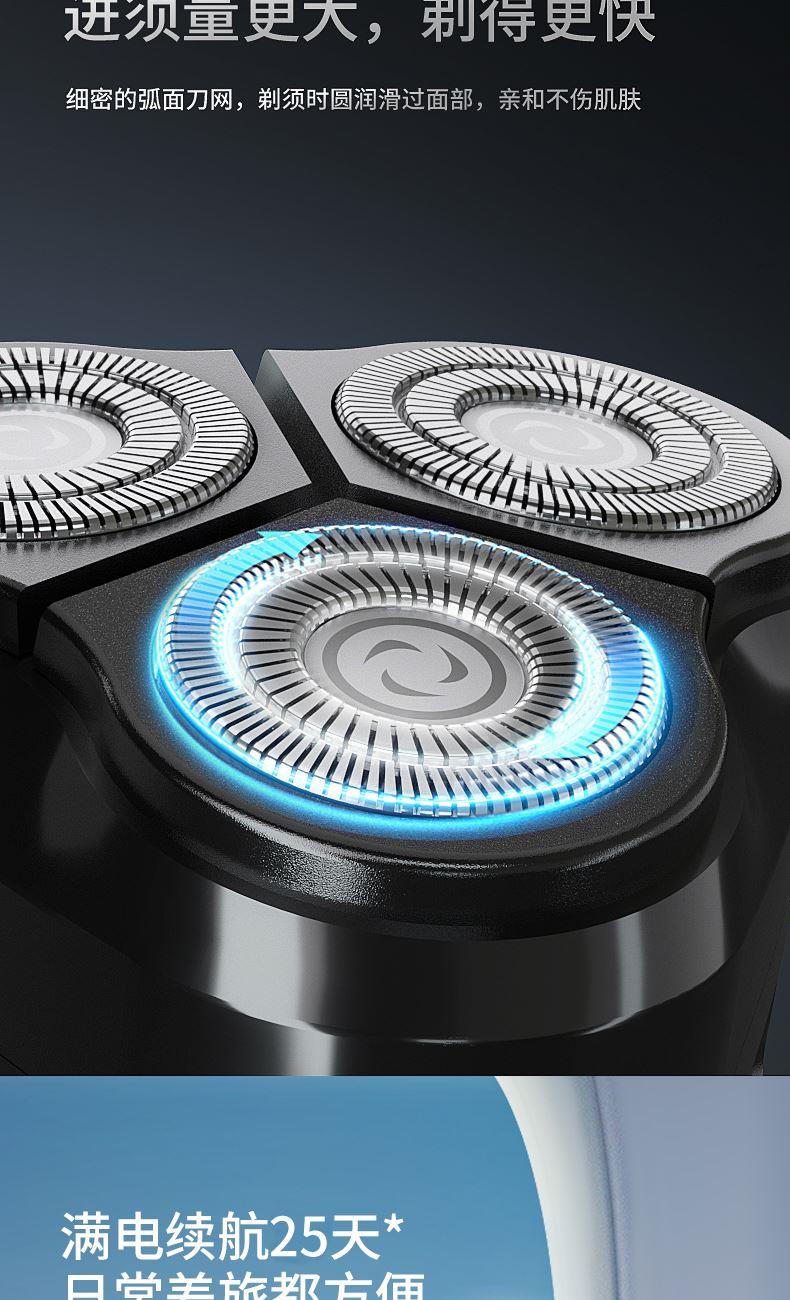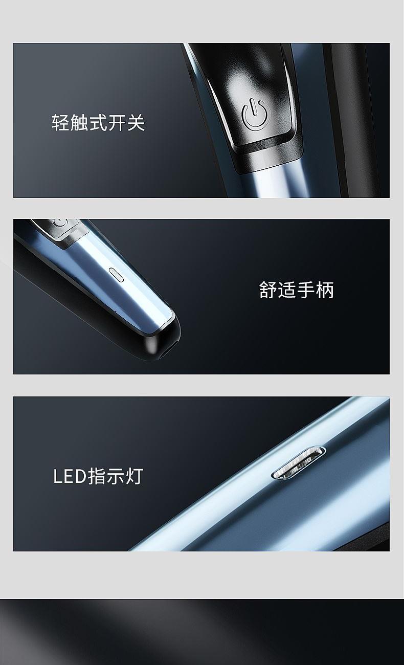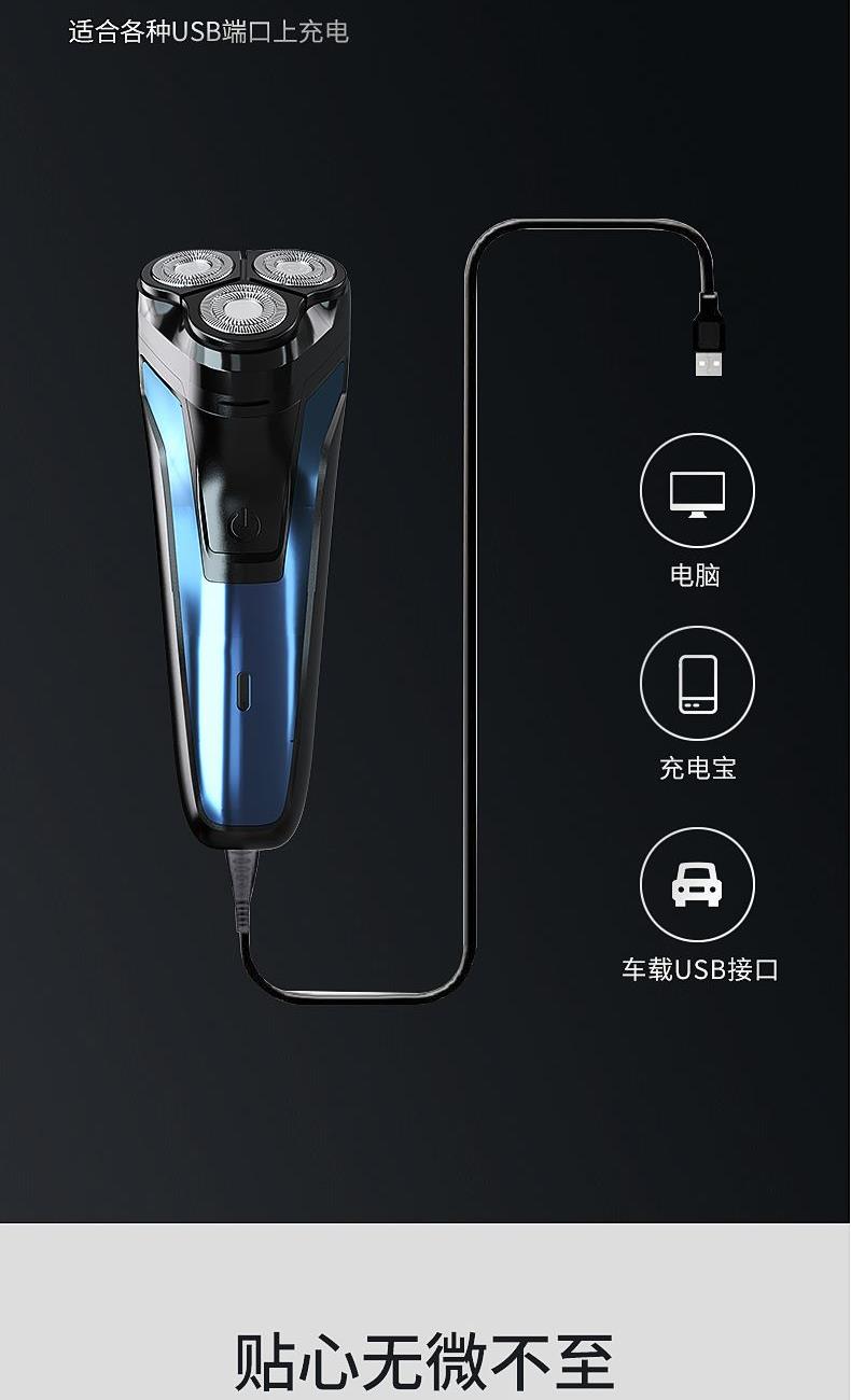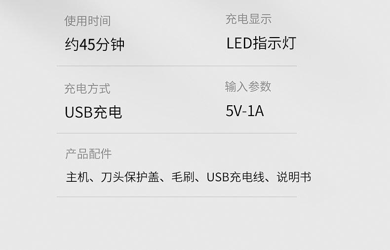 包装尺寸:170*80*100mm 外箱包装:800*350*510mm 包装材料:彩包 额定电压:5V~ 额定功率:5W 单台毛重:0.2kg 单台净重:0.13kg 独立浮动三刀头,亲密贴合轮廓无残留 一件启动,60分钟超长续航 一键开关 操作简单,双环贴面刀网 ,智能高效随身携带