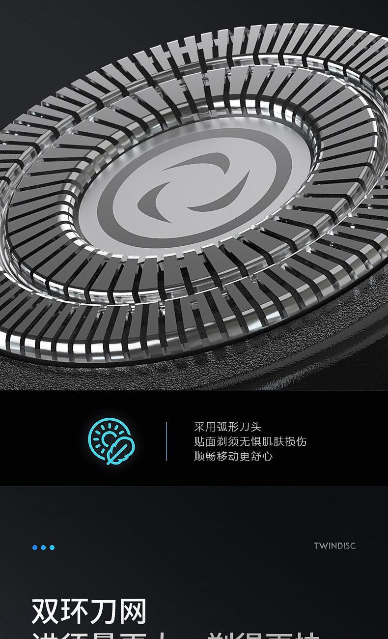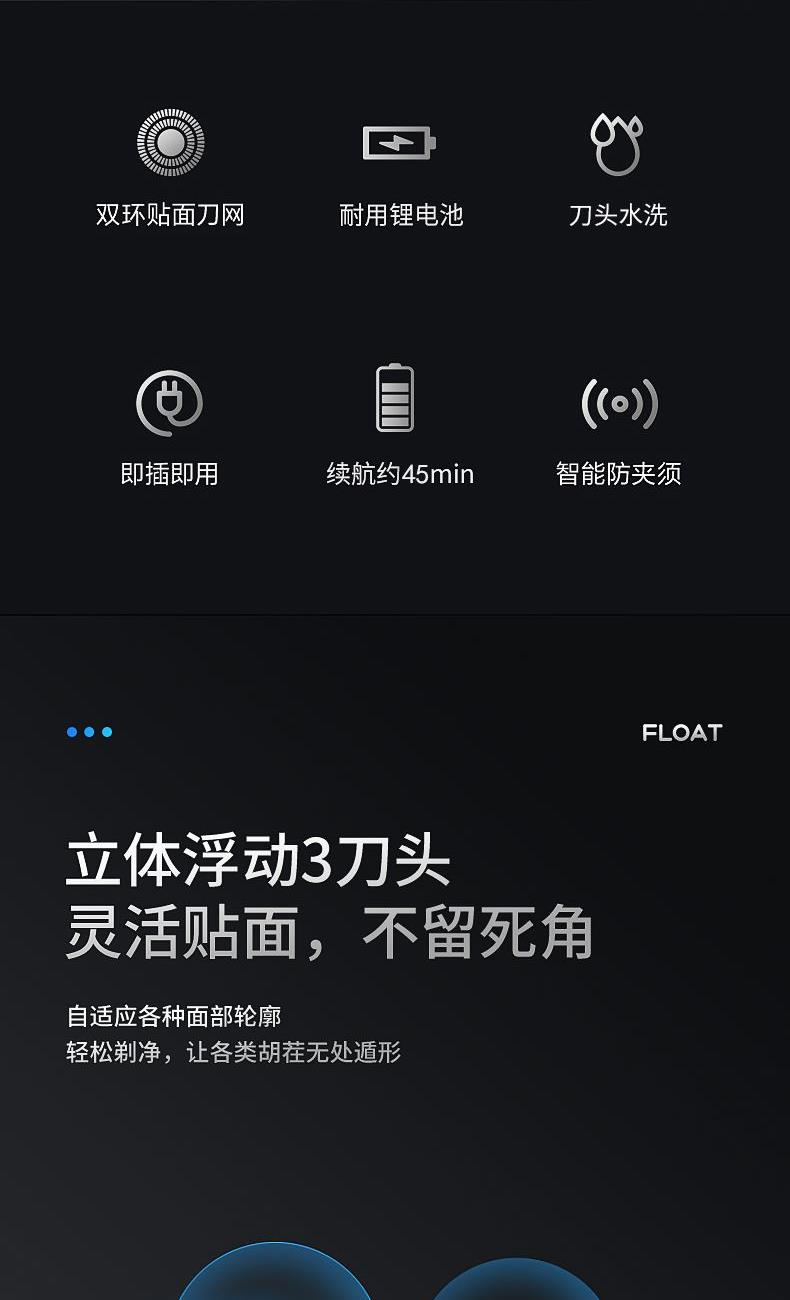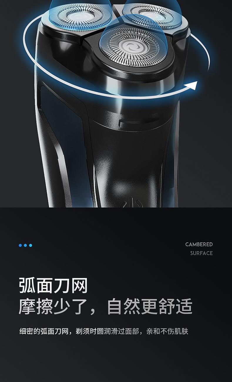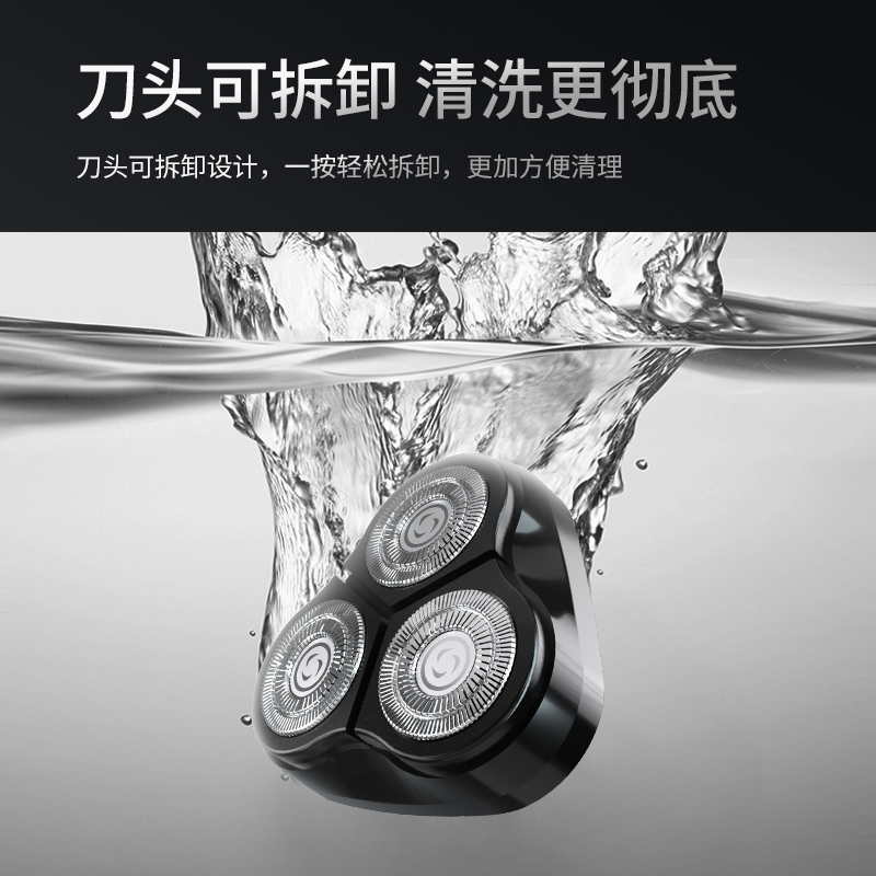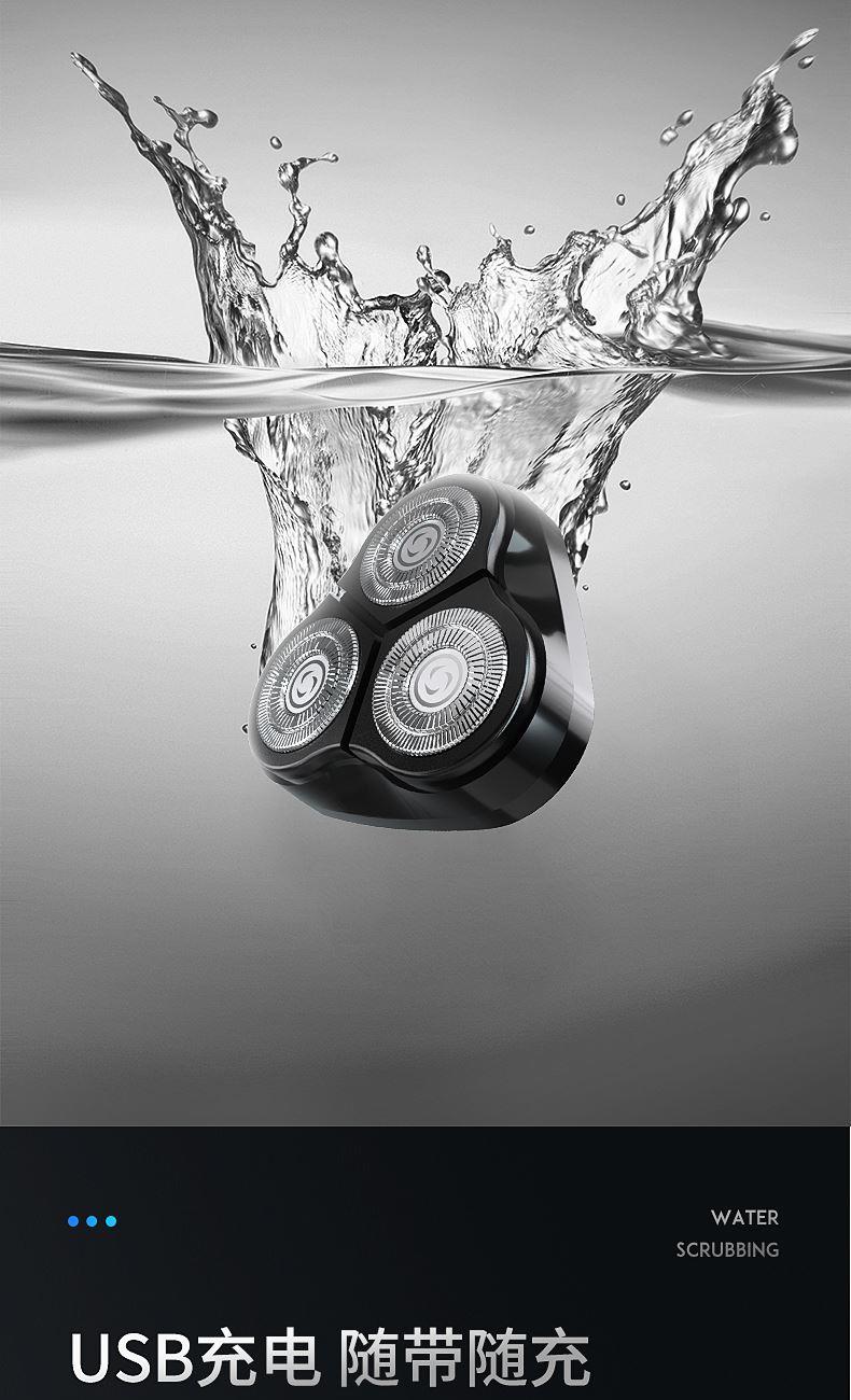 包装尺寸:170*80*100mm 外箱包装:800*350*510mm 包装材料:彩包 额定电压:5V~ 额定功率:5W 单台毛重:0.2kg 单台净重:0.13kg 独立浮动三刀头,亲密贴合轮廓无残留 一件启动,60分钟超长续航 一键开关 操作简单,双环贴面刀网 ,智能高效随身携带