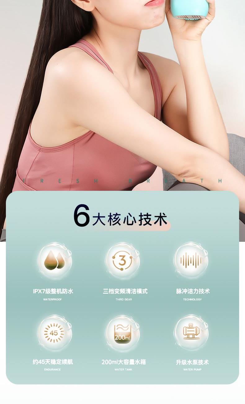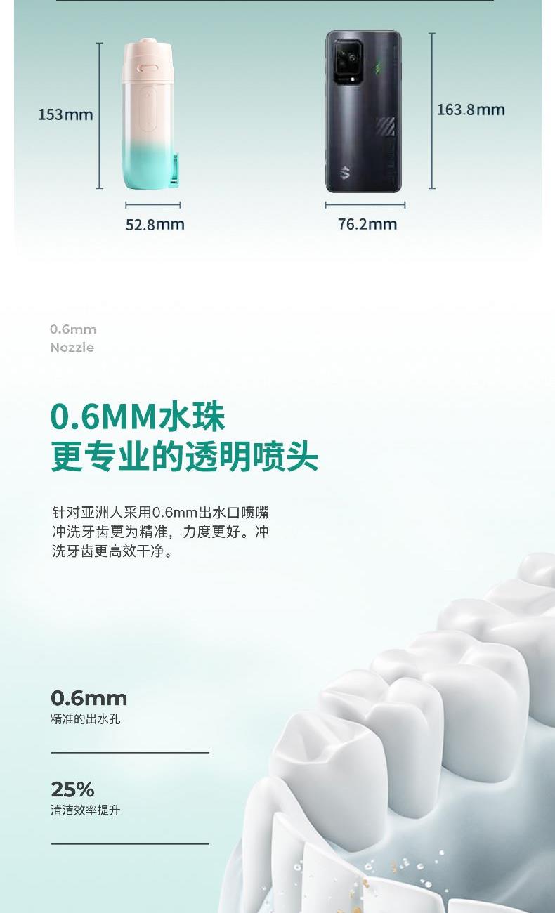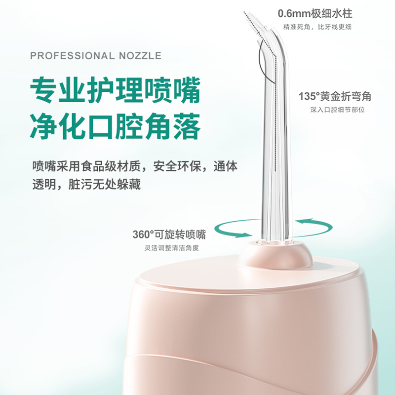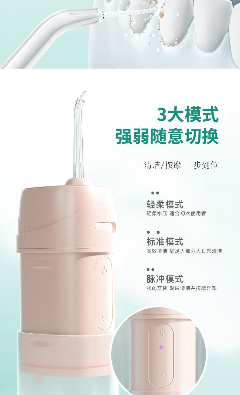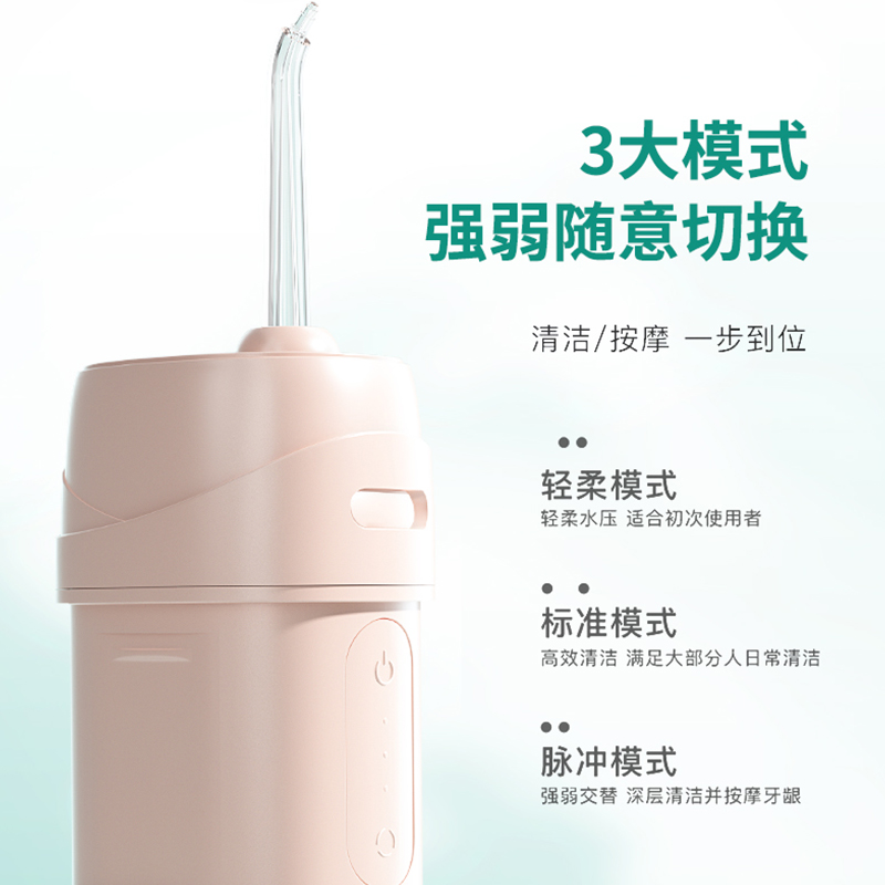 产品尺寸:67.5*52.8*153mm 外箱尺寸:410*410*555mm 水箱容量:200mL 包装材料:彩包 额定电源:3.5V~ 额定功率:5W 产品条码:6923473114347 三种模式: 轻柔 、强劲、 脉冲 | 200ml大容量,使用/拆洗方便 | 1400次/分钟强大脉冲科技 | 伸缩便捷,方便清洁 | 无死角清洁口腔保护牙龈健康。