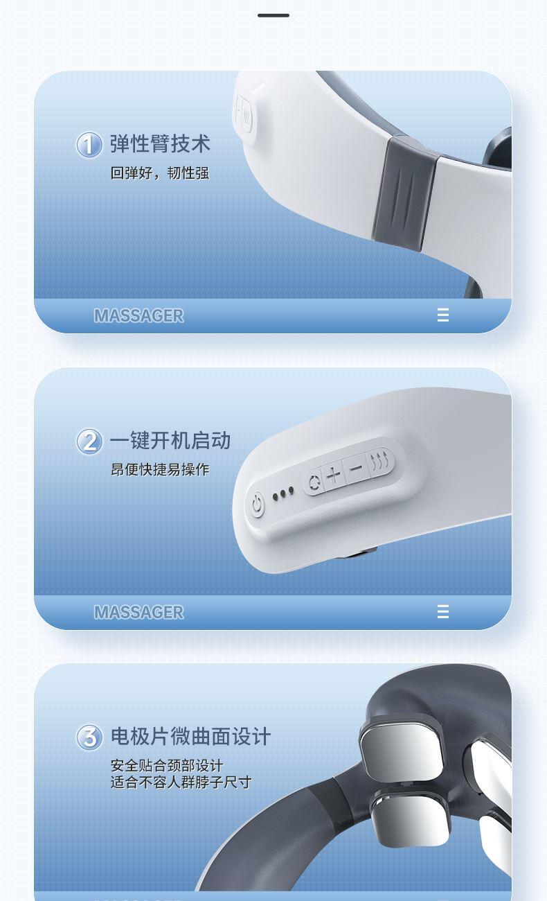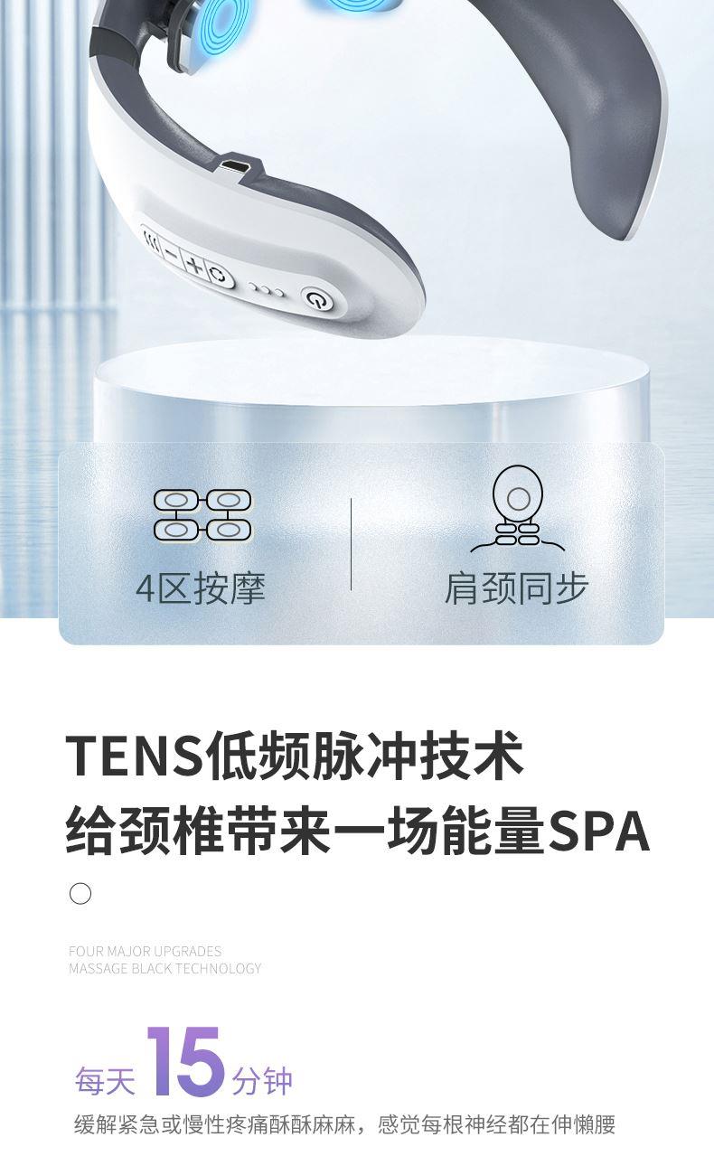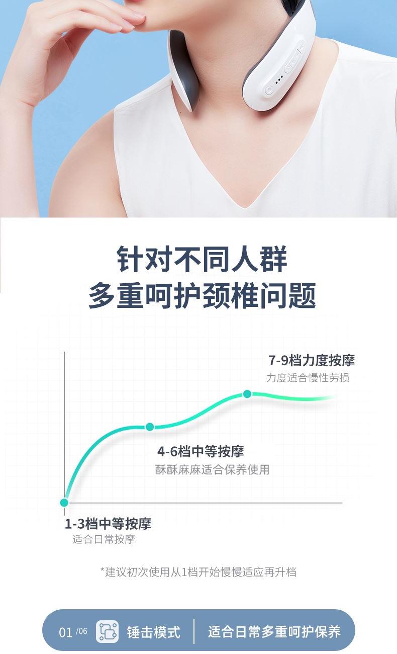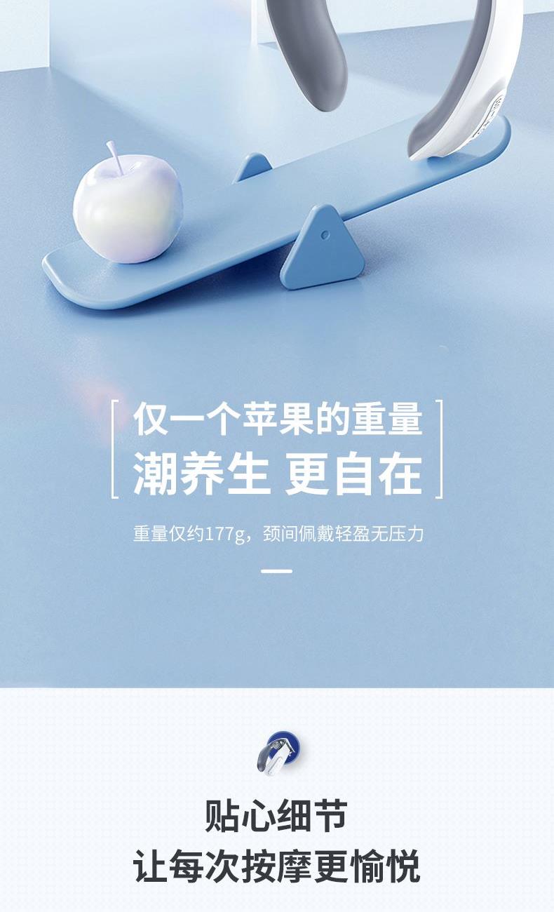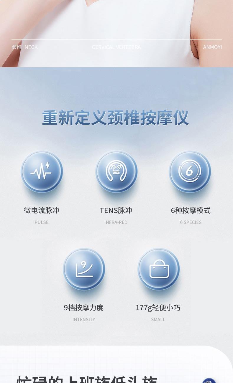 彩包尺寸:185*94*190mm 外箱尺寸:465*395*580mm 单台毛重:0.51Kg 单台净重:0.176Kg 产品颜色:白色 包装材料:彩盒 额定电压:3.7V~ 充电电压:5V 额定功率:4W 充电电流:2A 产品条码:6923473117454 6种按摩模式,9种按摩力度 | 微电流脉冲,4大电极片,肩颈同步按摩 | 轻巧又便捷。