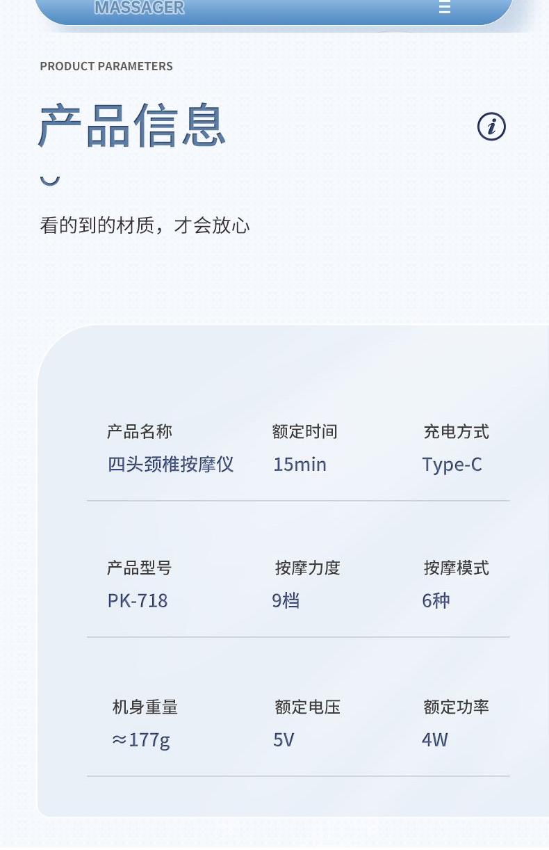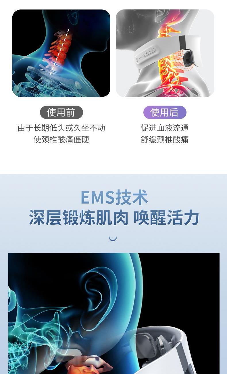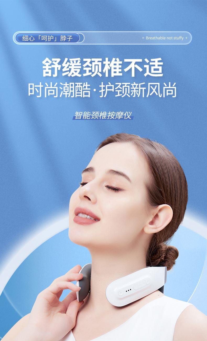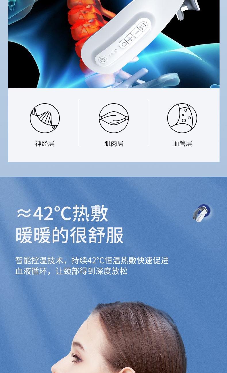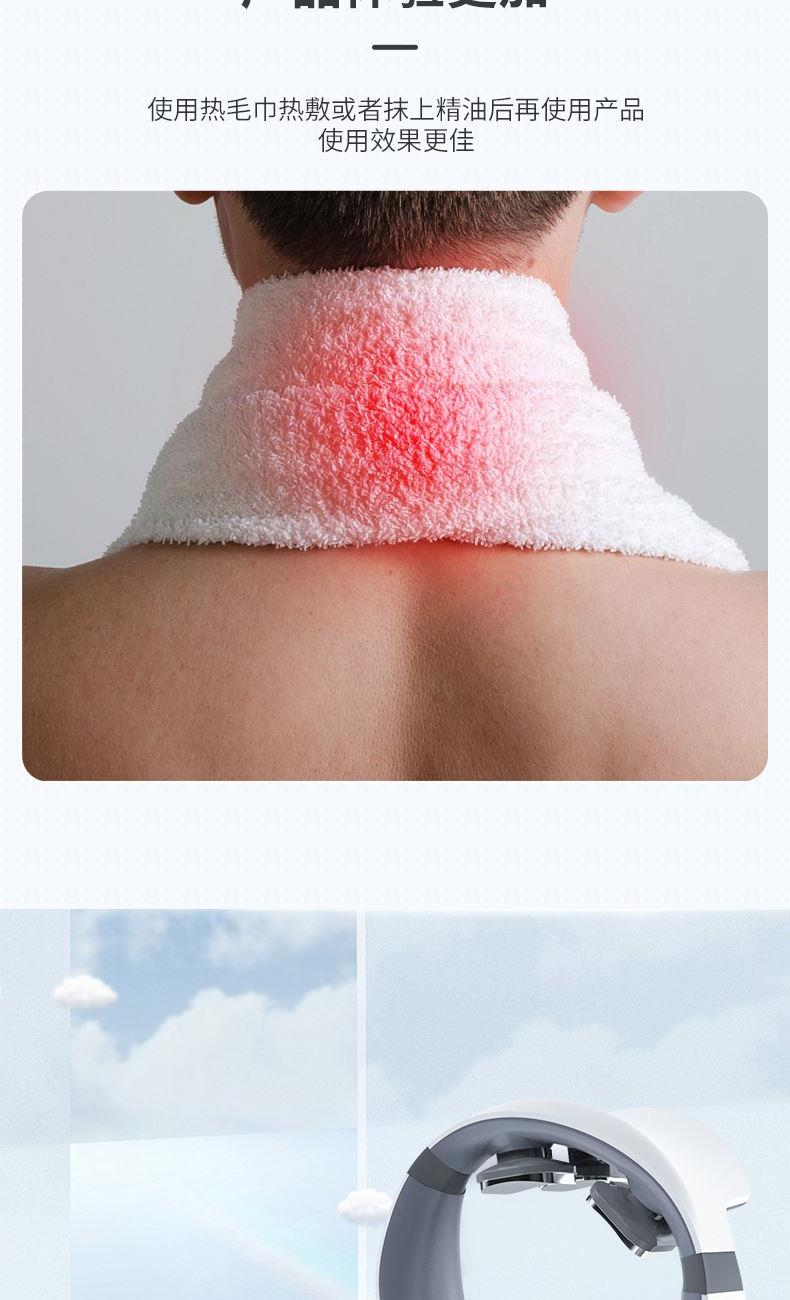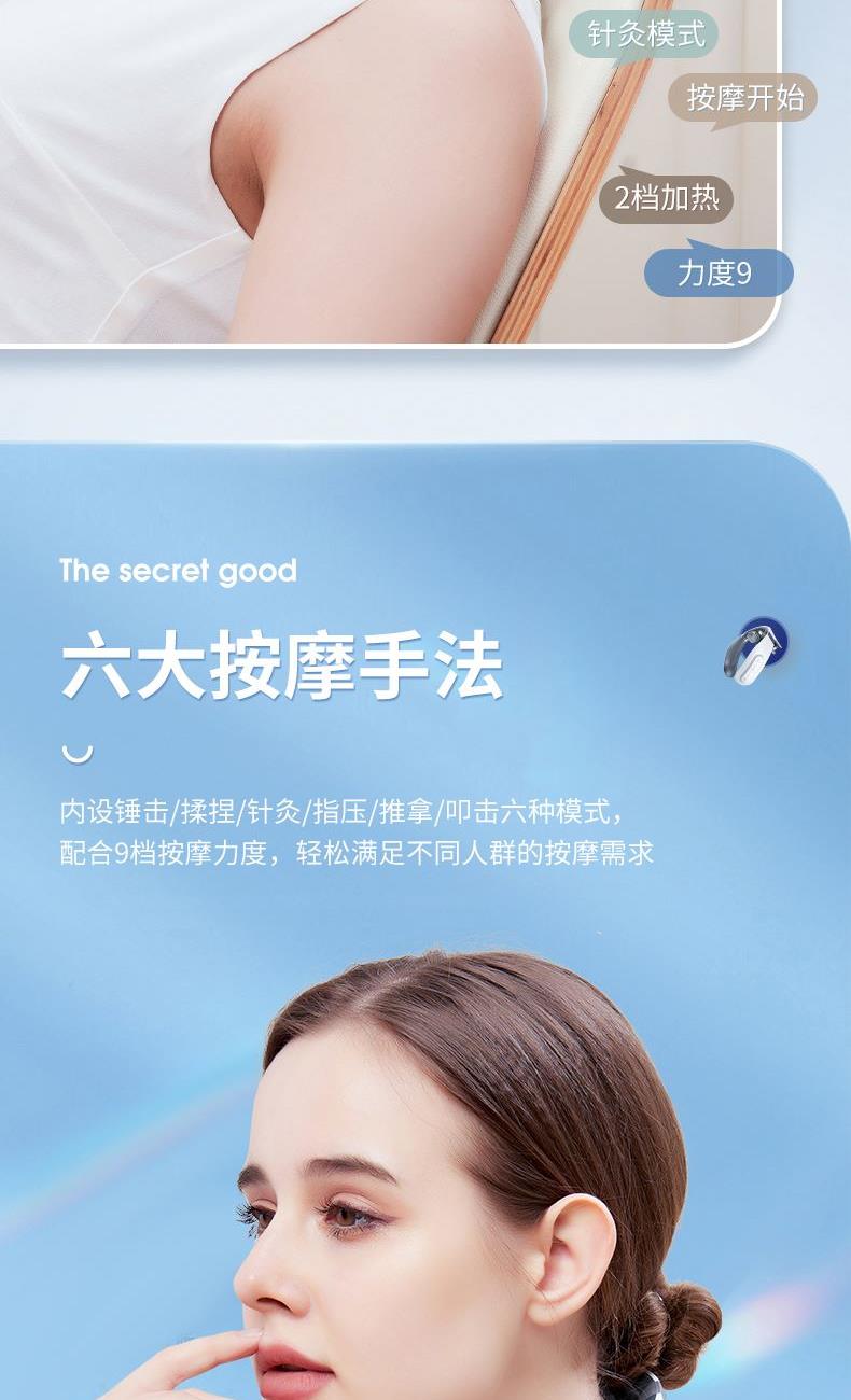 彩包尺寸:185*94*190mm 外箱尺寸:465*395*580mm 单台毛重:0.51Kg 单台净重:0.176Kg 产品颜色:白色 包装材料:彩盒 额定电压:3.7V~ 充电电压:5V 额定功率:4W 充电电流:2A 产品条码:6923473117454 6种按摩模式,9种按摩力度 | 微电流脉冲,4大电极片,肩颈同步按摩 | 轻巧又便捷。