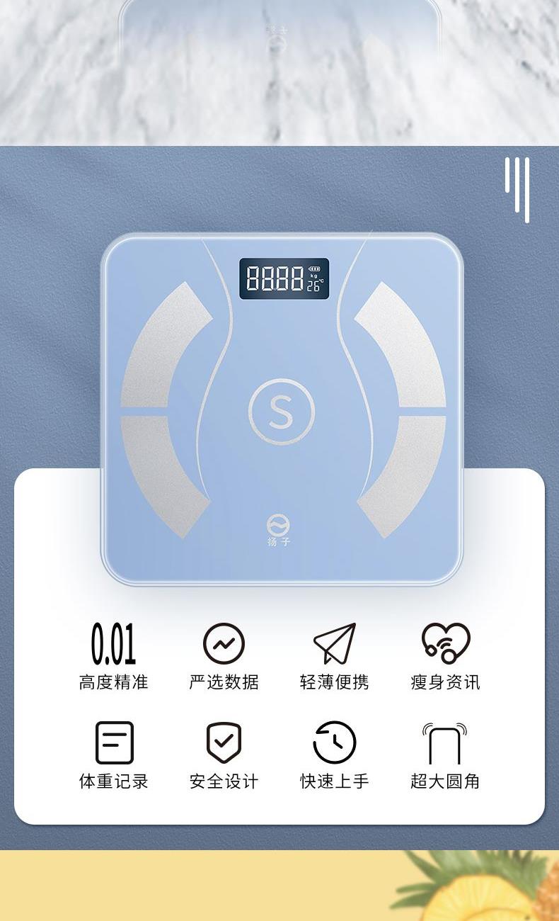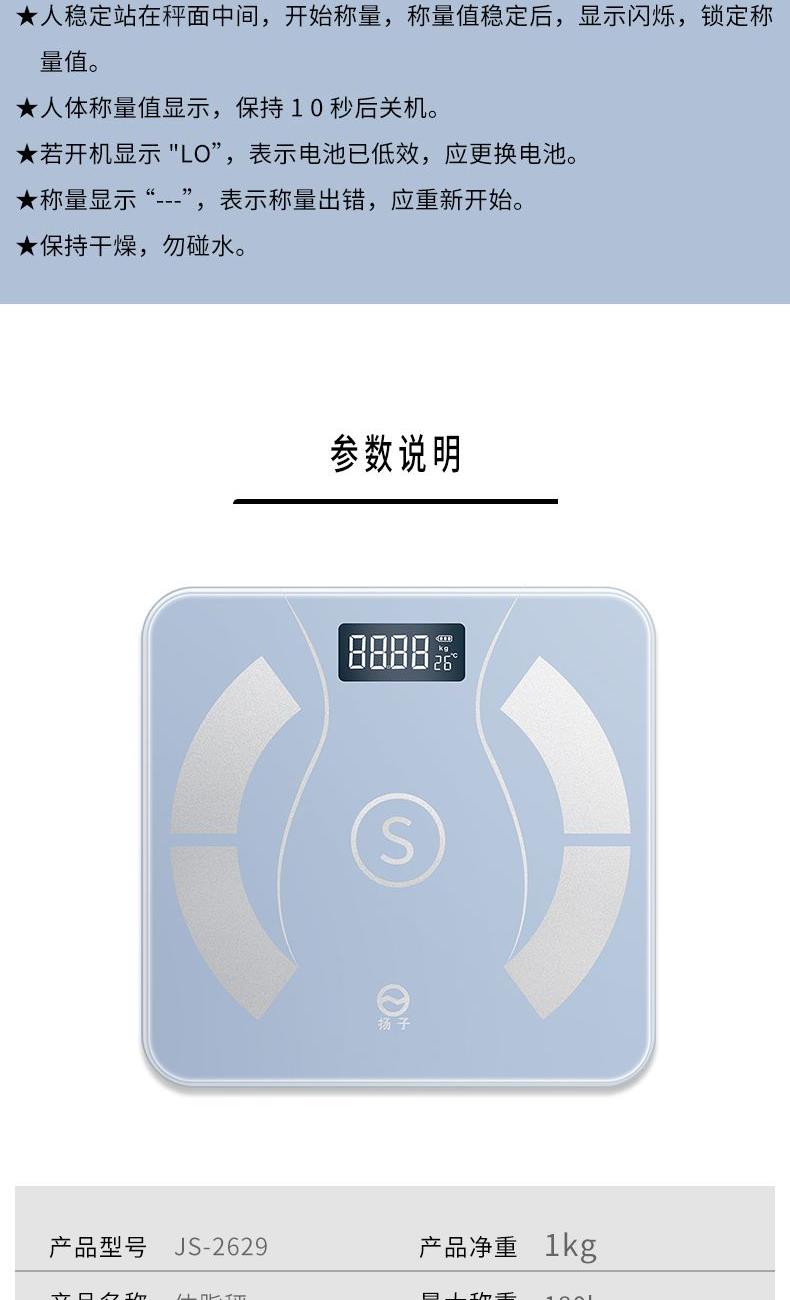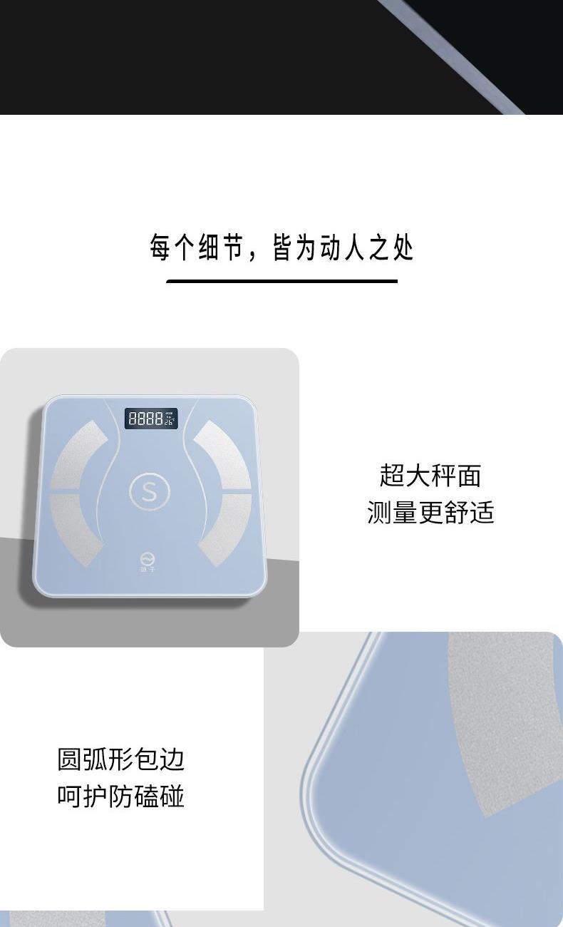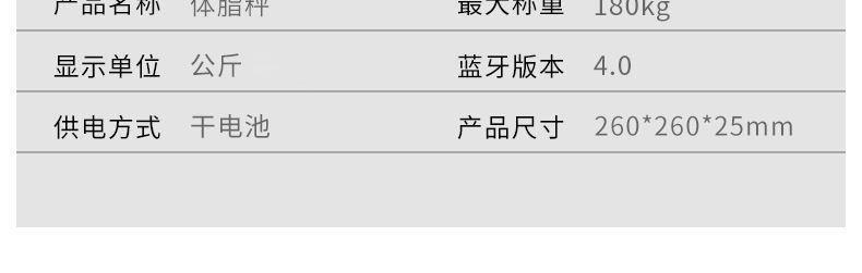 电源:AAA电池(7号两节) 称重:180Kg 工作温度:10-35摄氏度 单台净重:1kg 包装尺寸:292*292*53mm 外箱包装:520*310*310mm 包装材料:彩包 APP蓝牙链接功能 ★ 大秤面的舒适测量体验 ★ 低重心设计四角牢固防止侧翻 ★ 高强度钢化玻璃,圆角设计不惧撞击 ★