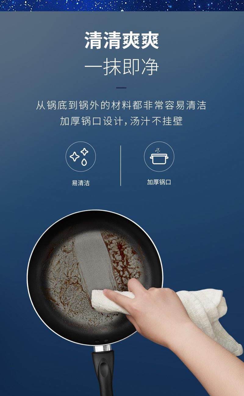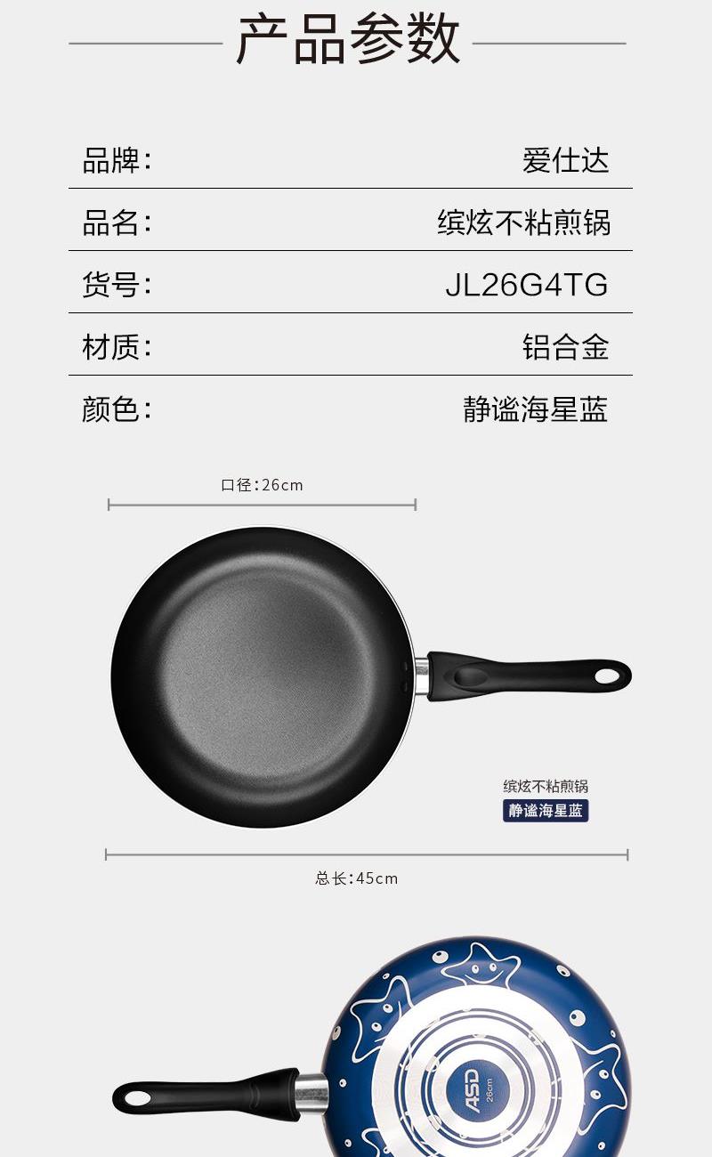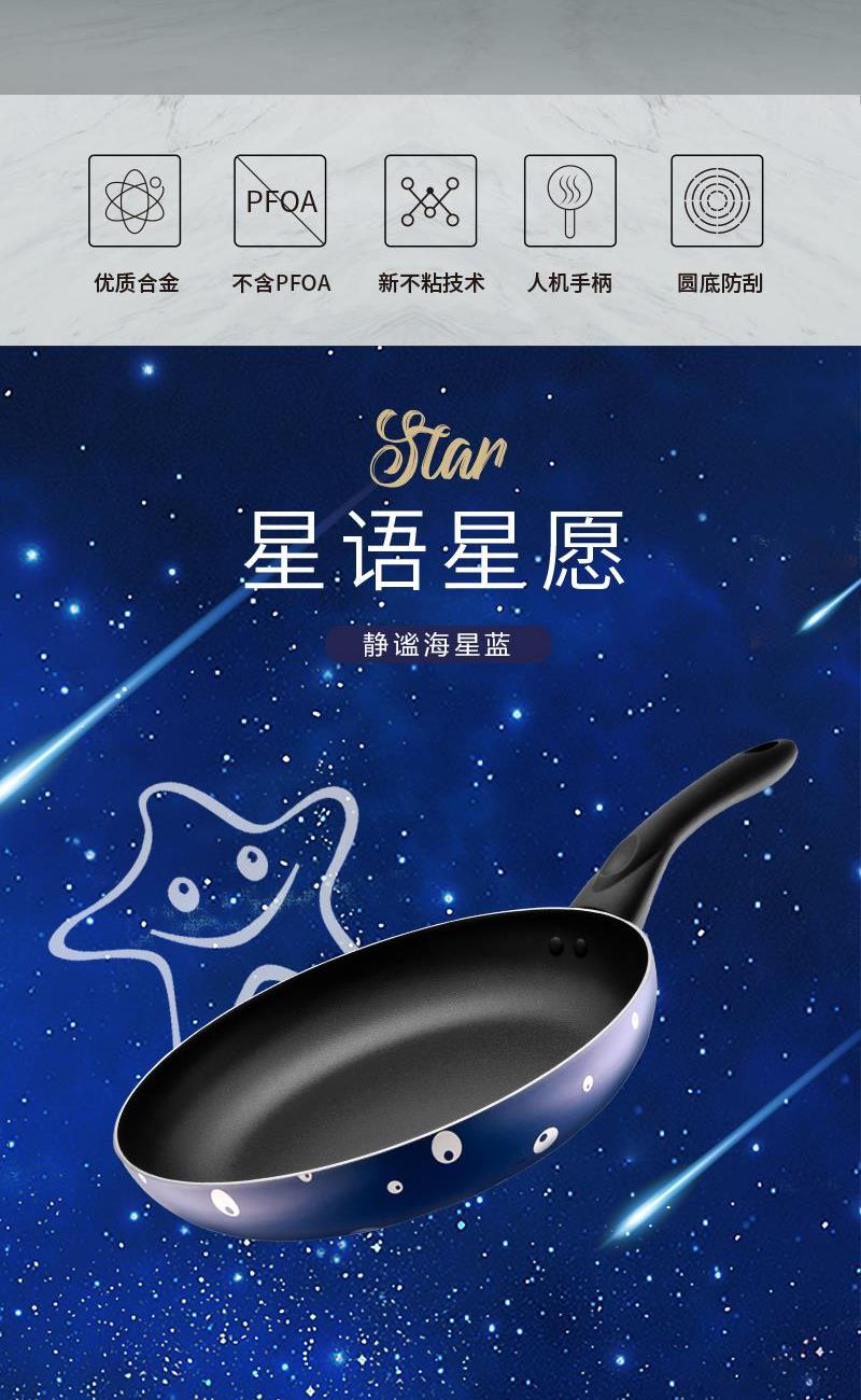 材质 - 铝合金 规格 - 26cm煎 内箱 - 330*320*88mm(邮购盒) 外箱 -660*350*565mm 净重 - 6.6kg 毛重 - 13.2kg 1、优质合金基材,导热均匀快捷,坚固耐用; 2、新不粘技术,不粘不糊易清洗,少油更健康; 3、锅身外静谧海星图案,点亮单调的空间体验; 4、防滑车纹底,防滑效果好,煮食更安全; 5、人性化手柄设计,隔热防烫,手感舒适;