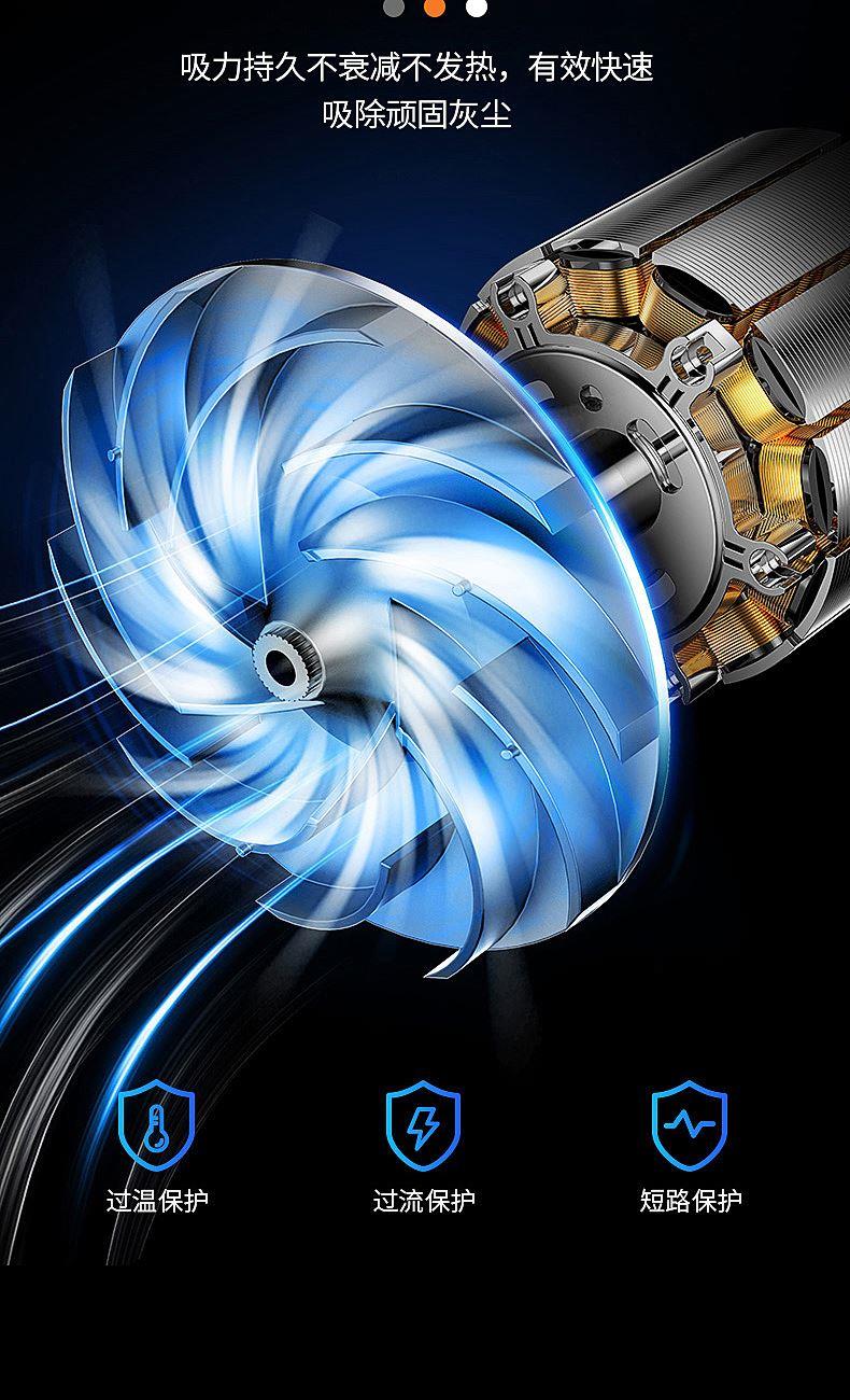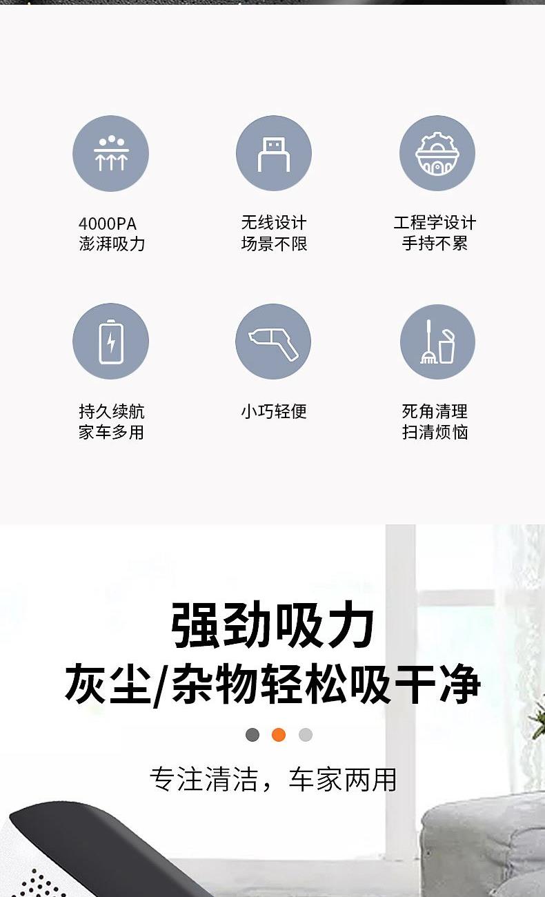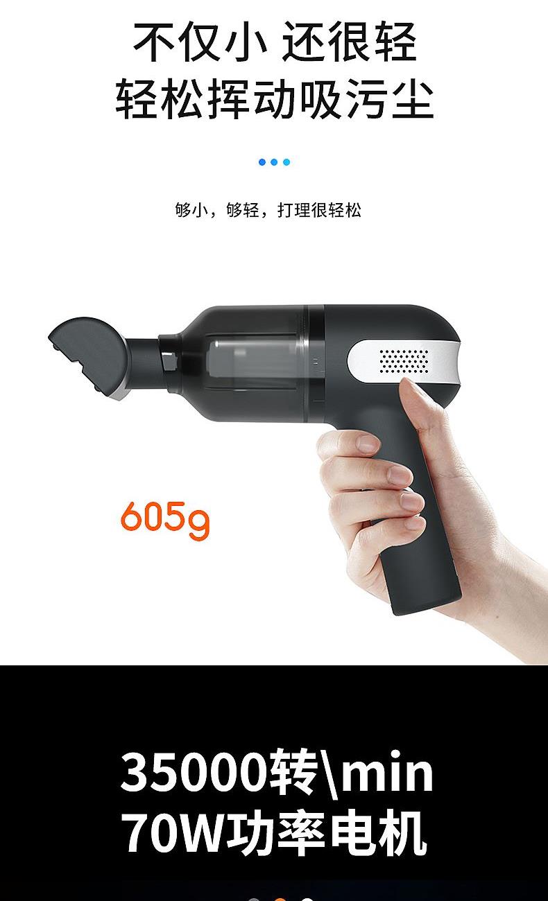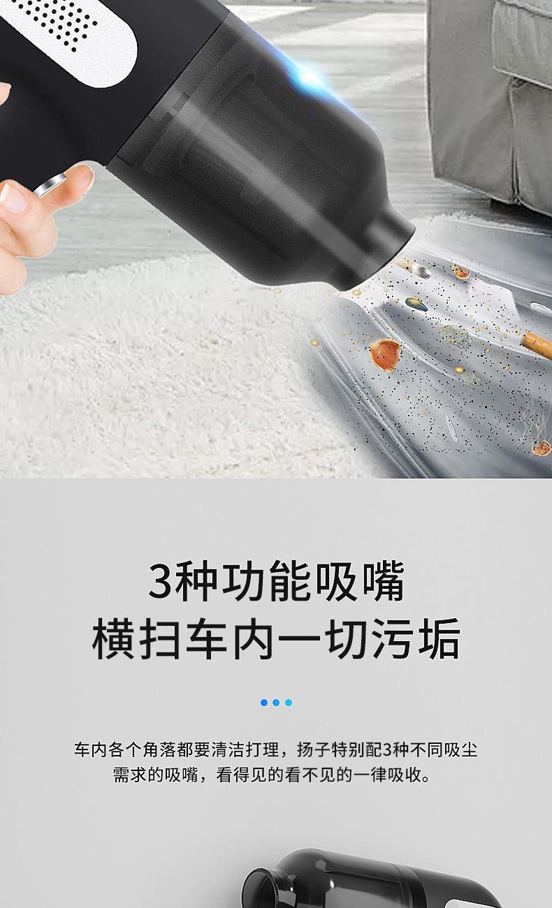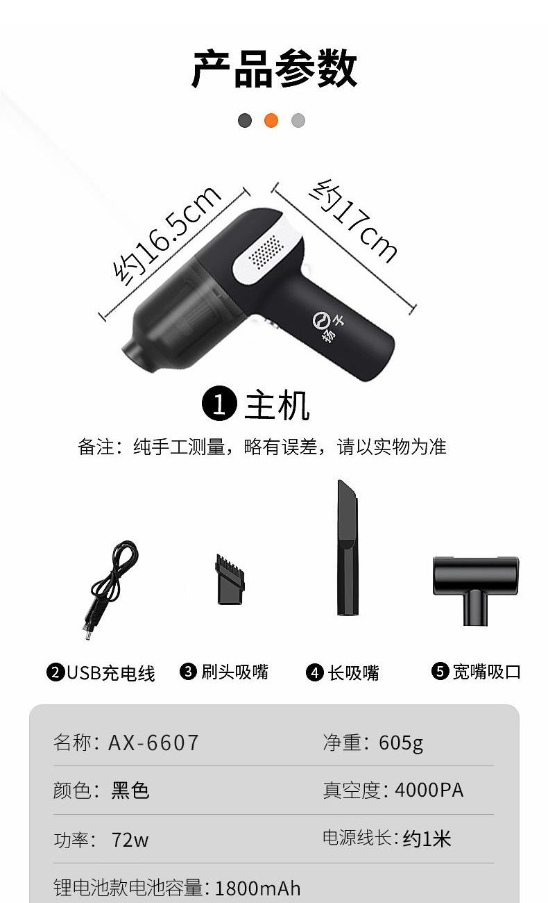 包装尺寸:270*210*80mm 外箱包装:560*450*530mm 电 线:9V USB充电线 包装材料:彩包 输出电压:7.4V~ 电流:9A 功 率:70W 电池容量:1800毫安 单台毛重:0.61kg 单台净重:0.42kg 强劲吸力,灰尘杂物轻松吸干净 无线灵活,吸尘指哪吸哪 负压真空,专注吸尘,家车两用,搭配多个吸头满足不同需求