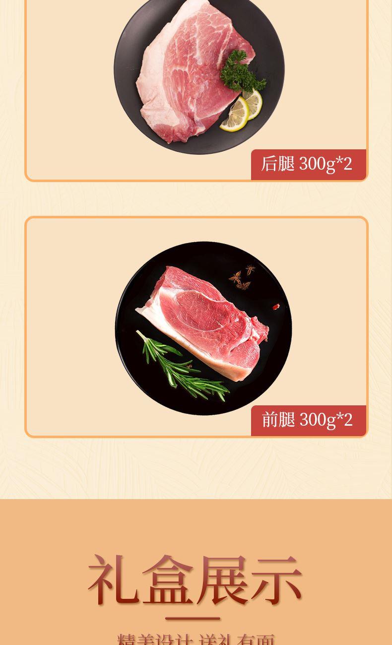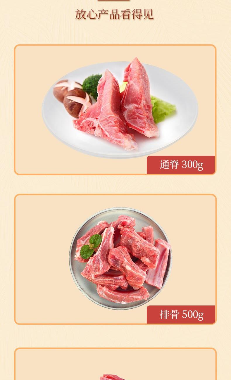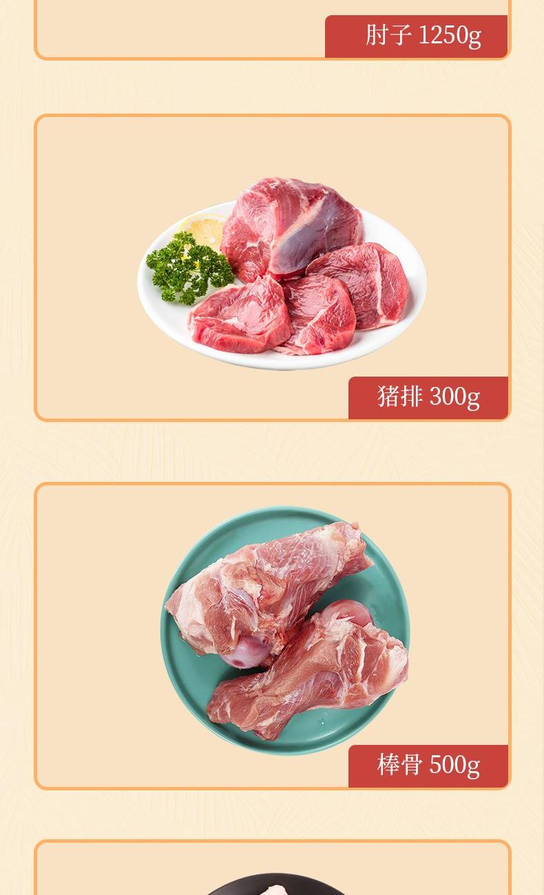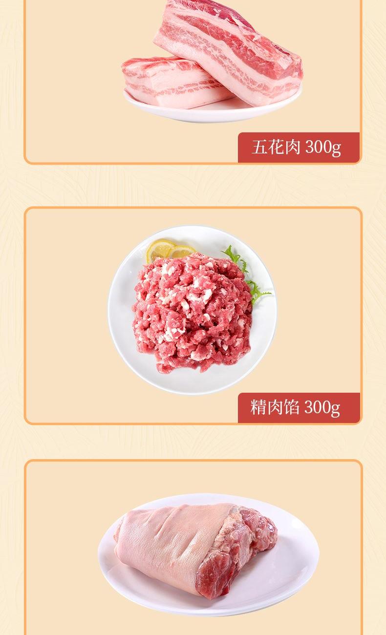 1.通脊300g*1袋 2.排骨500g*1袋 3.带皮五花肉300g*1袋 4.精肉馅300g*1袋 5.肘子1250g*1袋 6.雪花猪排300g*1袋 7.带肉棒骨500g*1袋 8.后腿300g*2袋 9.前腿300g*2袋