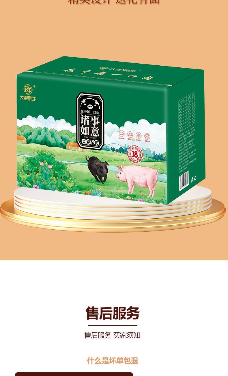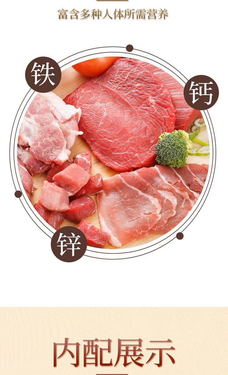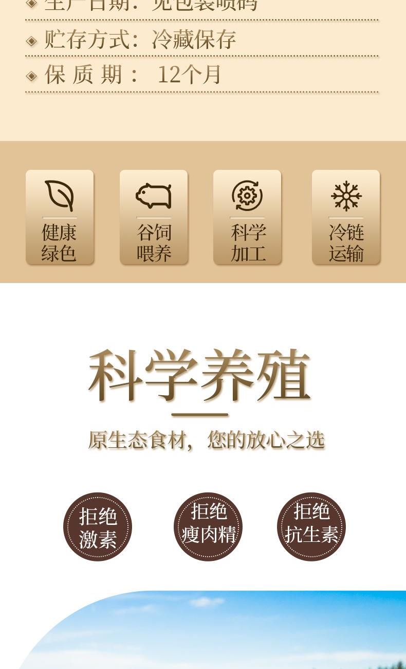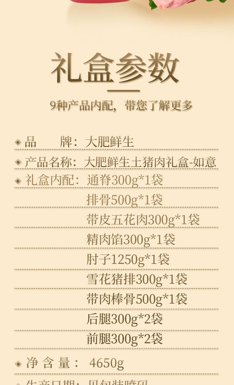 1.通脊300g*1袋 2.排骨500g*1袋 3.带皮五花肉300g*1袋 4.精肉馅300g*1袋 5.肘子1250g*1袋 6.雪花猪排300g*1袋 7.带肉棒骨500g*1袋 8.后腿300g*2袋 9.前腿300g*2袋